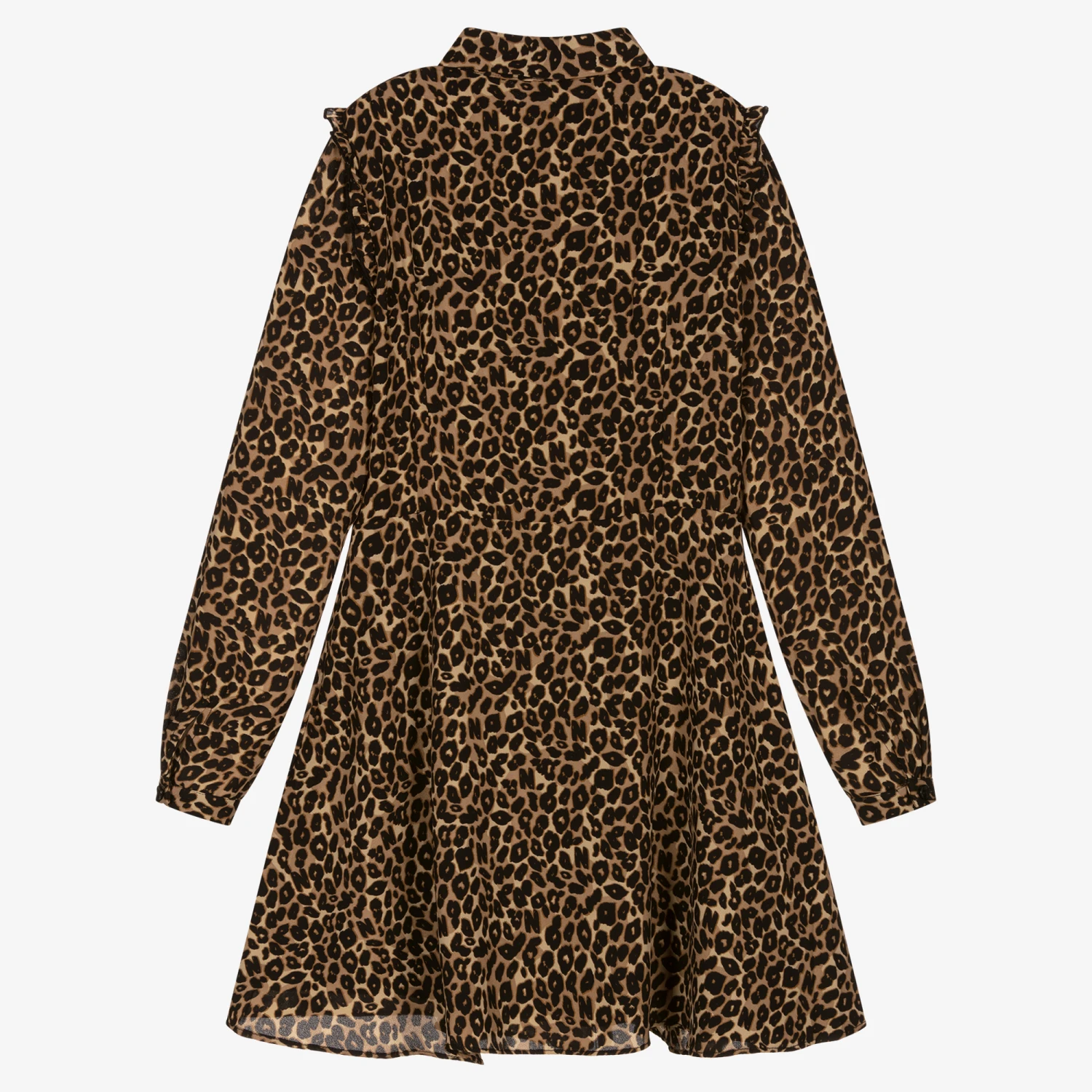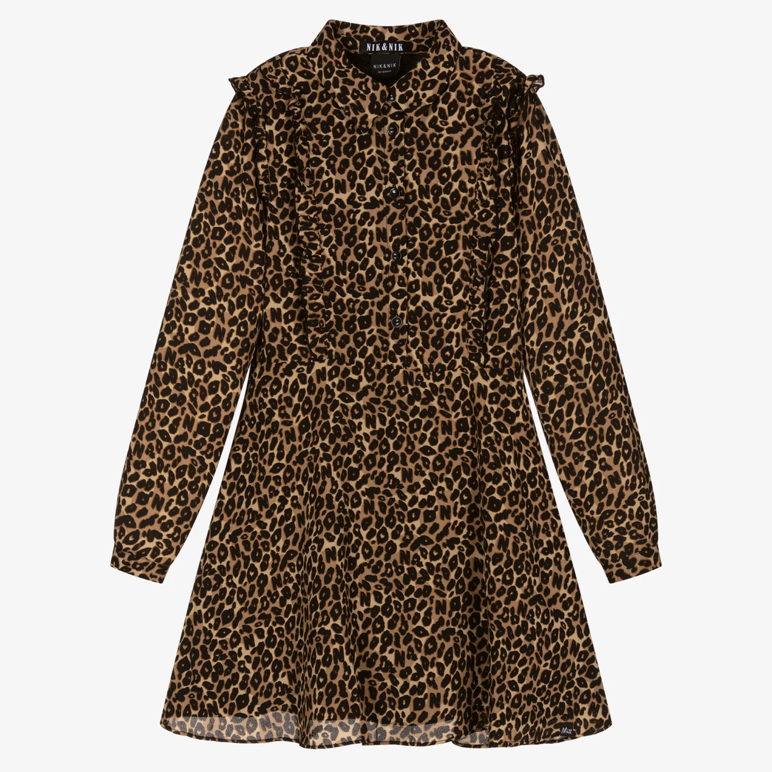 Elegant brown leopard print dress for teen girls by NIK&NIK, made in lightweight recycled polyester chiffon. With a cute A-line skirt, this shirt dress has classy ruffle trims. It fastens with black buttons and has a lightweight black viscose lining.