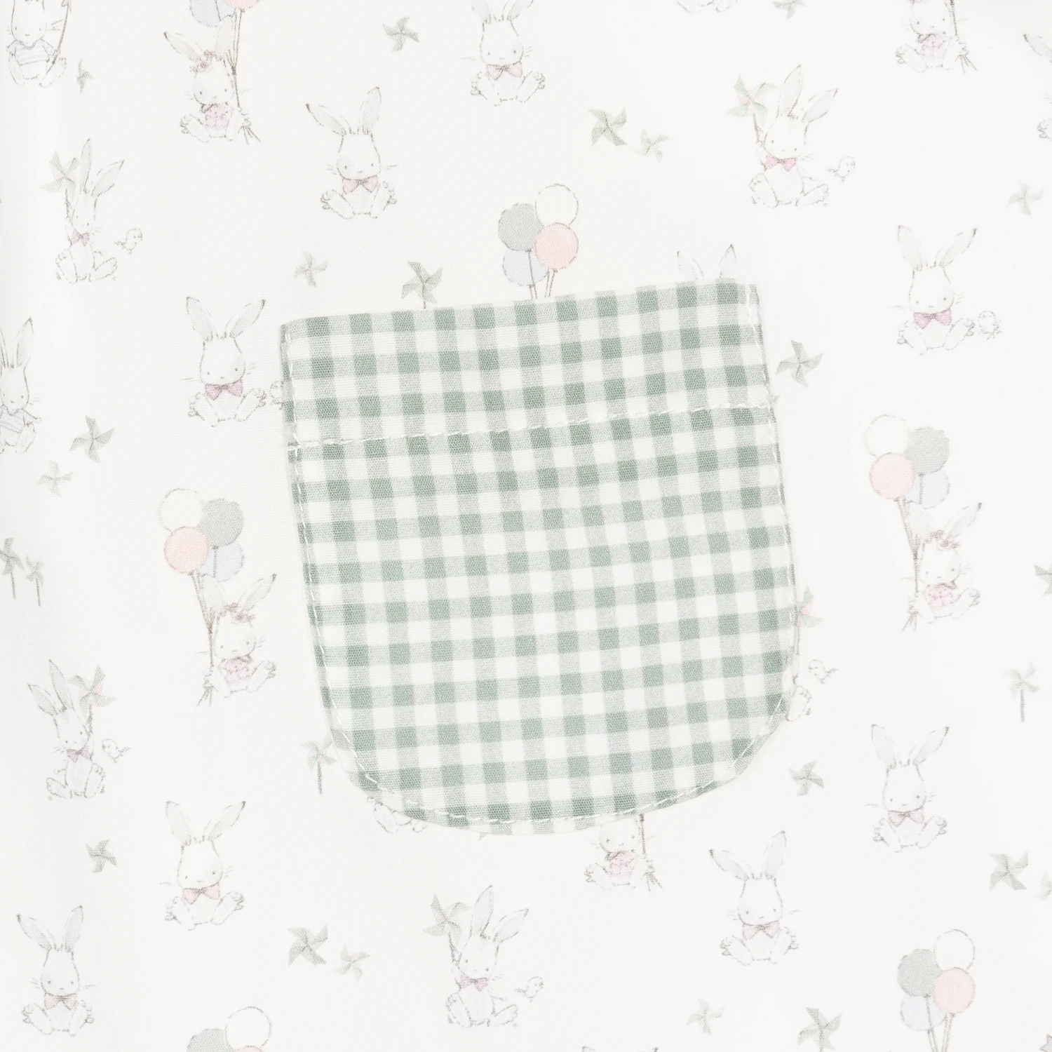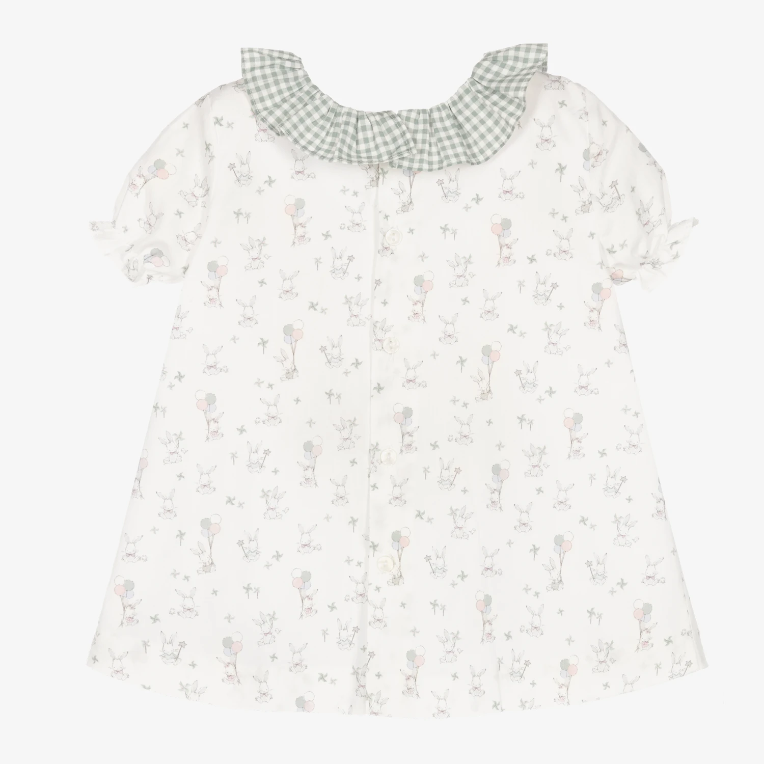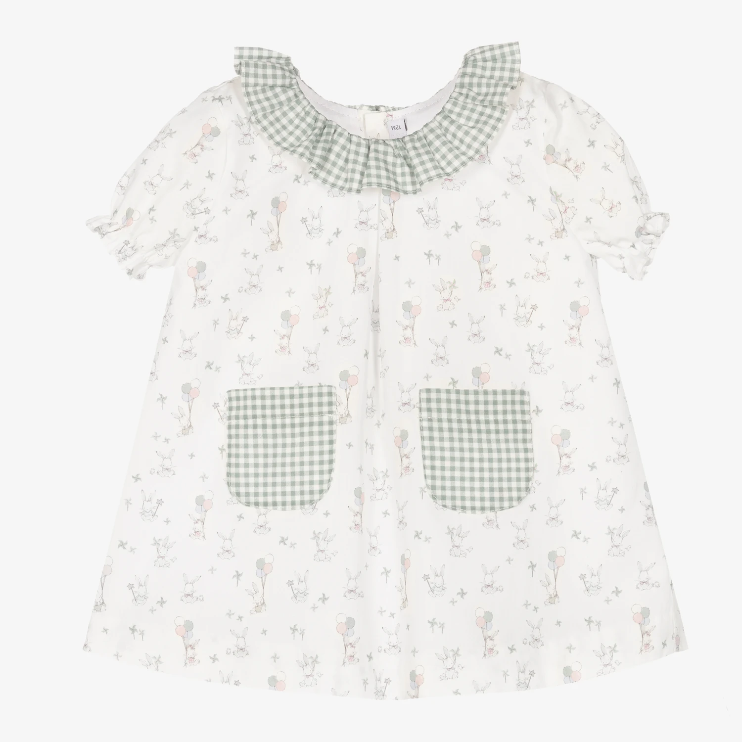 An adorable white cotton dress for little girls by Paloma de la O, with a cute bunny rabbit and balloon design. Soft and lightweight, it has a sweet green gingham check ruffle collar with coordinating front pockets and puffed short sleeves that have gently elasticated cuffs. Fully lined with soft cotton voile for comfort, it fastens with buttons on the back.