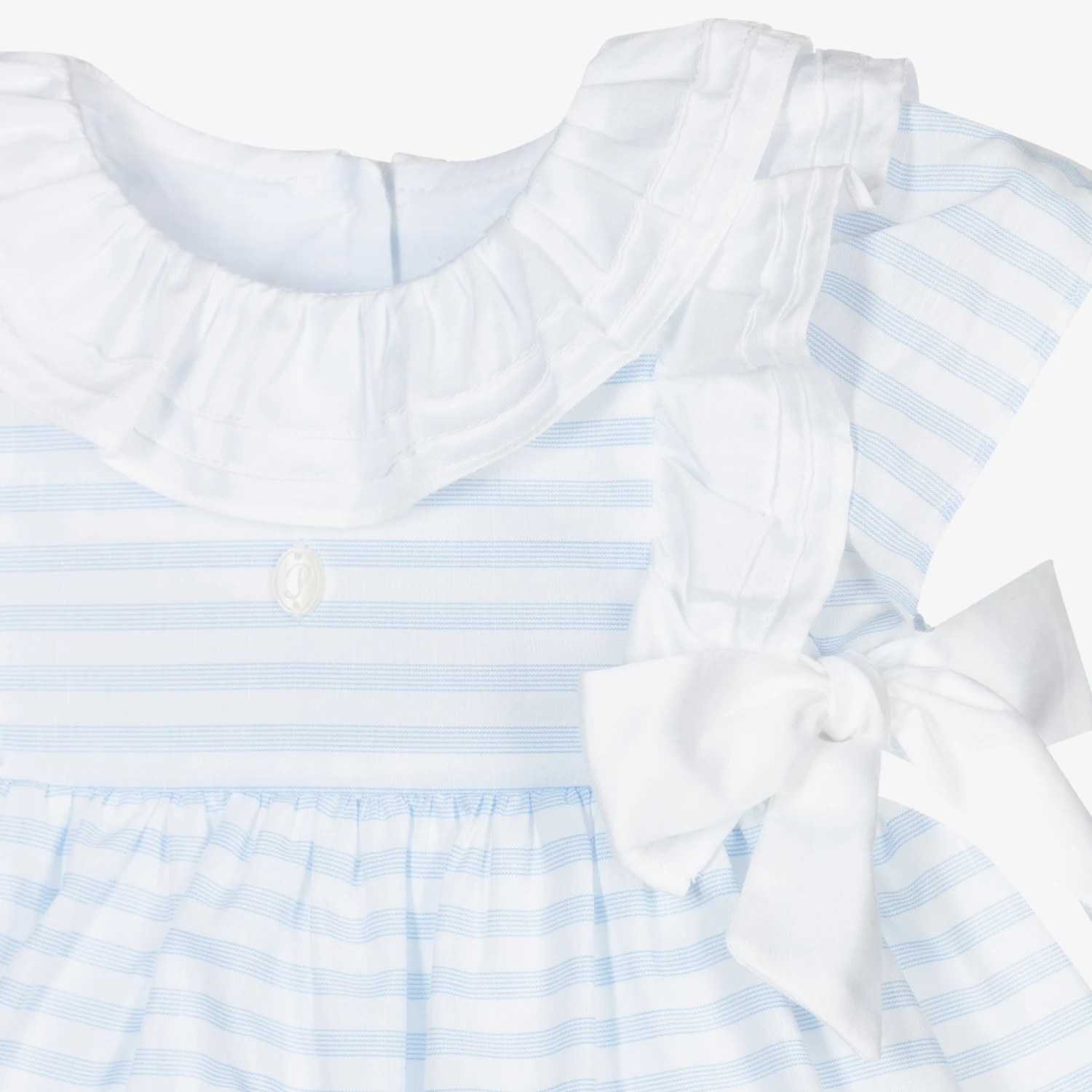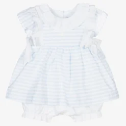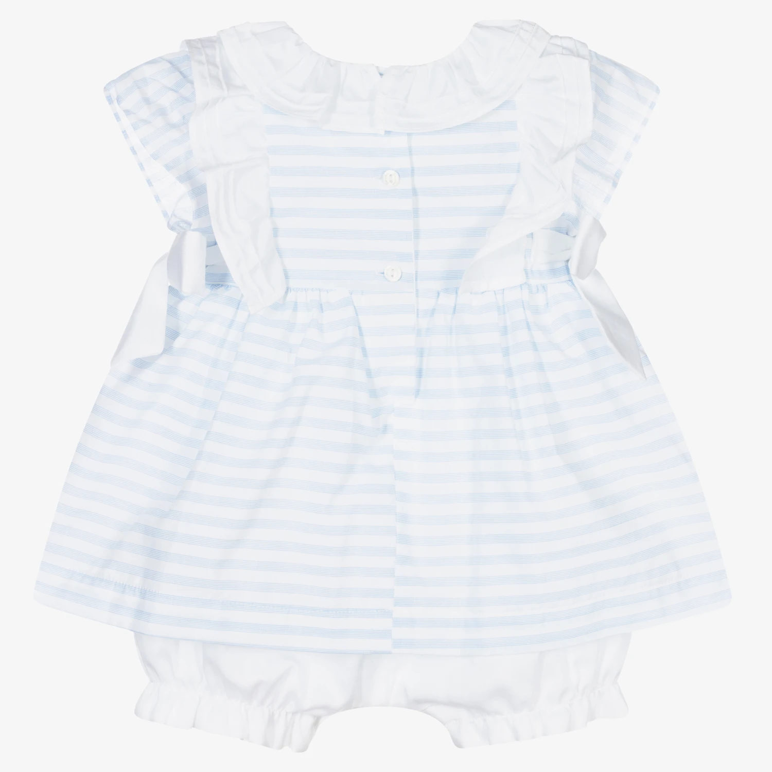 Pretty dress for baby girls by Patachou, made in pale blue and white striped cotton. It has a white ruffle collar, with matching ruffles over the shoulders and bows on the sides. Sewn on the bodice is the brand’s mother-of-pearl logo charm. Underneath are attached bloomers with gently elasticated and frilled cuffs.