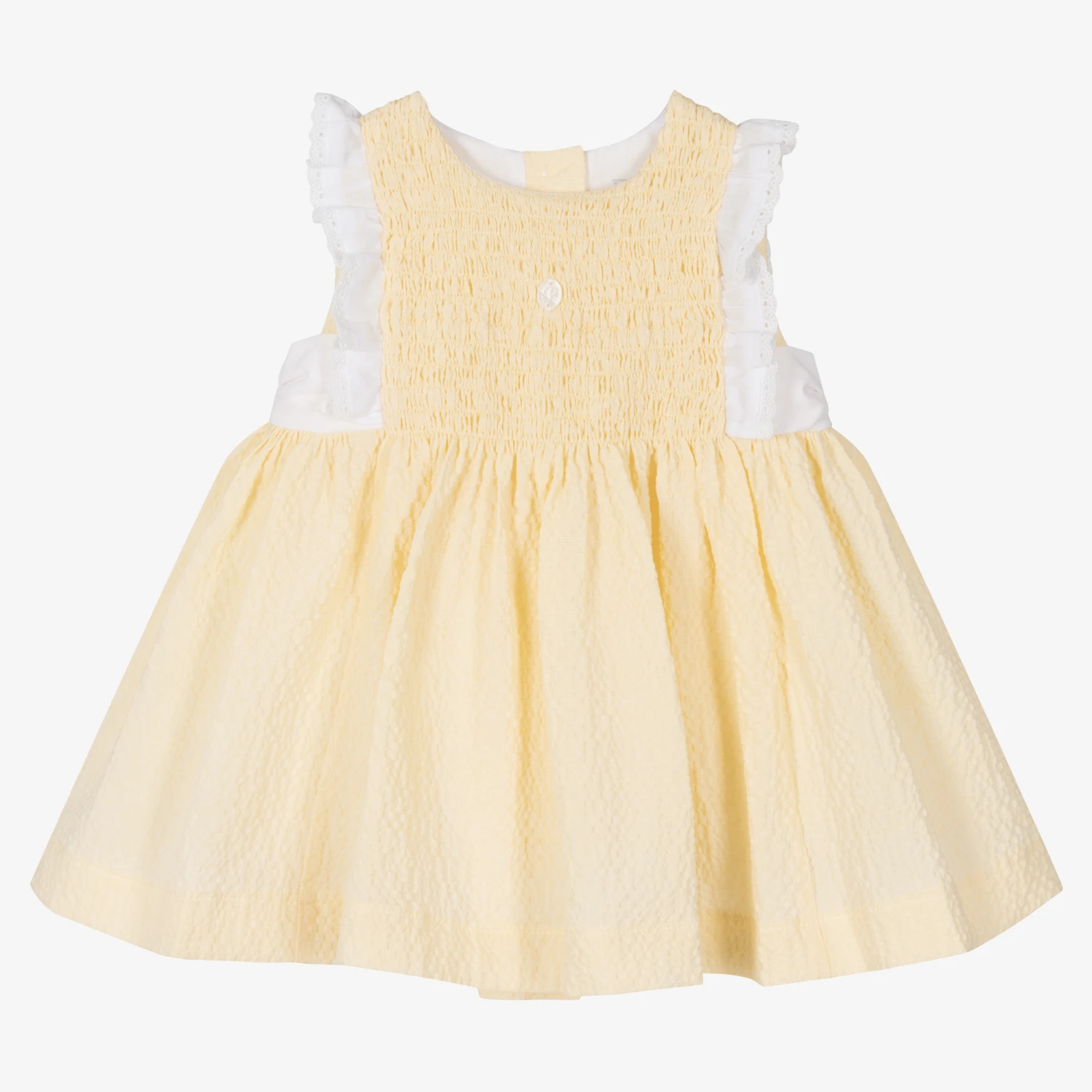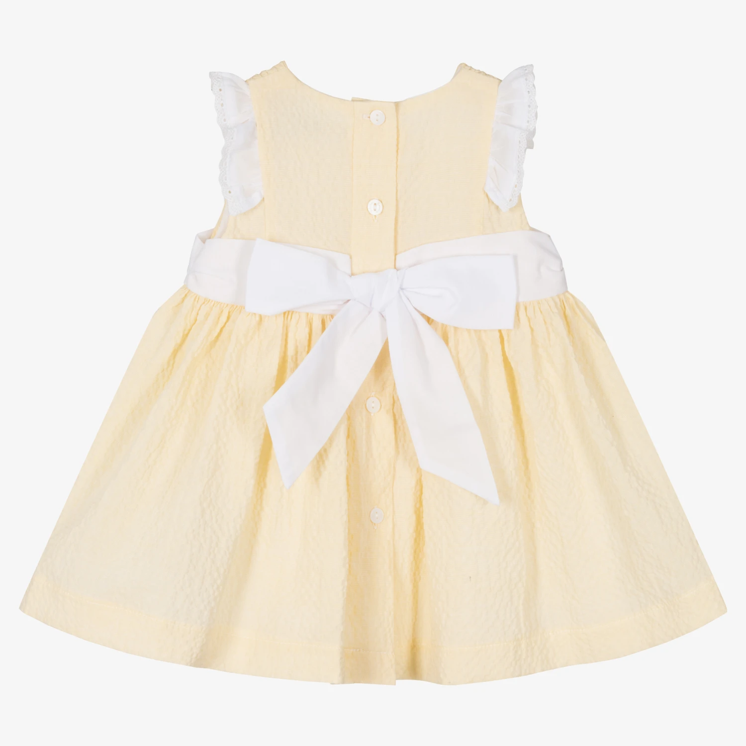 Lovely yellow cotton dress for baby girls by Patachou, made in lightweight seersucker fabric. This summery piece has white ruffle shoulder trims, a tie-up bow on the back, and a ruched bodice, for a textured style. Lined with super lightweight voile, it fastens with a branded buttons on the back.