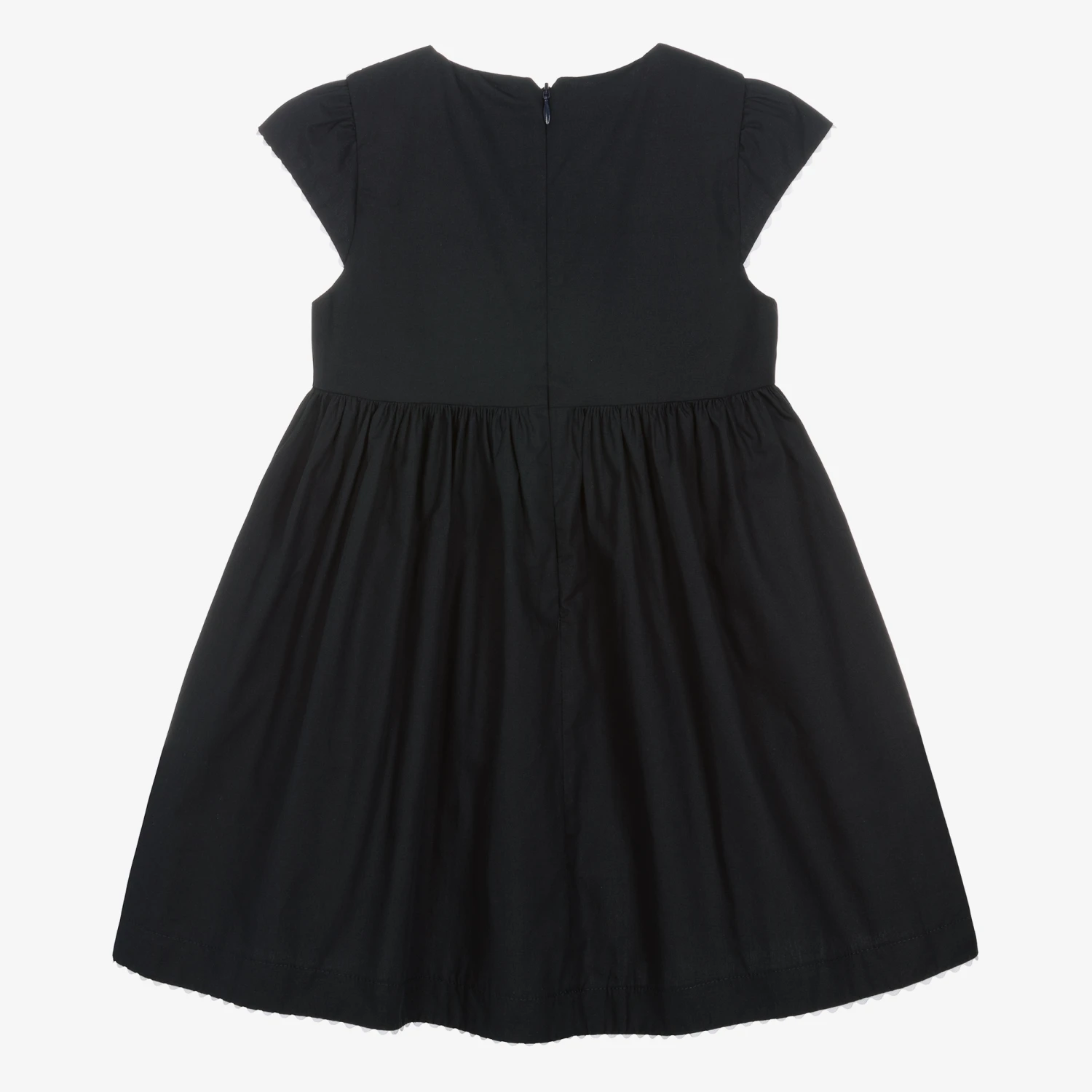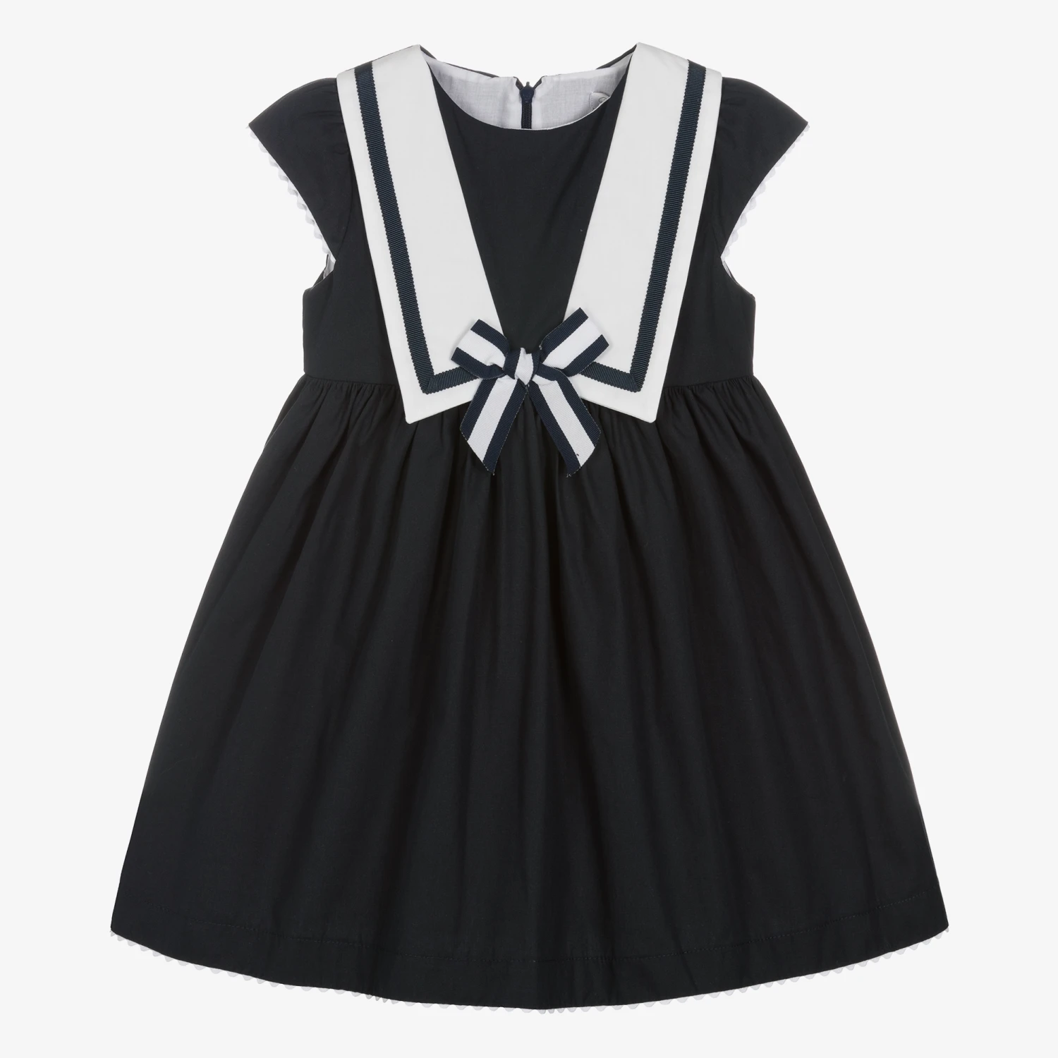 Nautical navy blue dress for girls by Portuguese brand Patachou, made in lightweight cotton poplin with a soft voile lining. It has a white bib front with navy blue ribboned trims and a bow appliqué on the front, for a touch of heritage charm. There are white ric rac trims on the sleeves and hem, with a concealed zip fastening on the back.