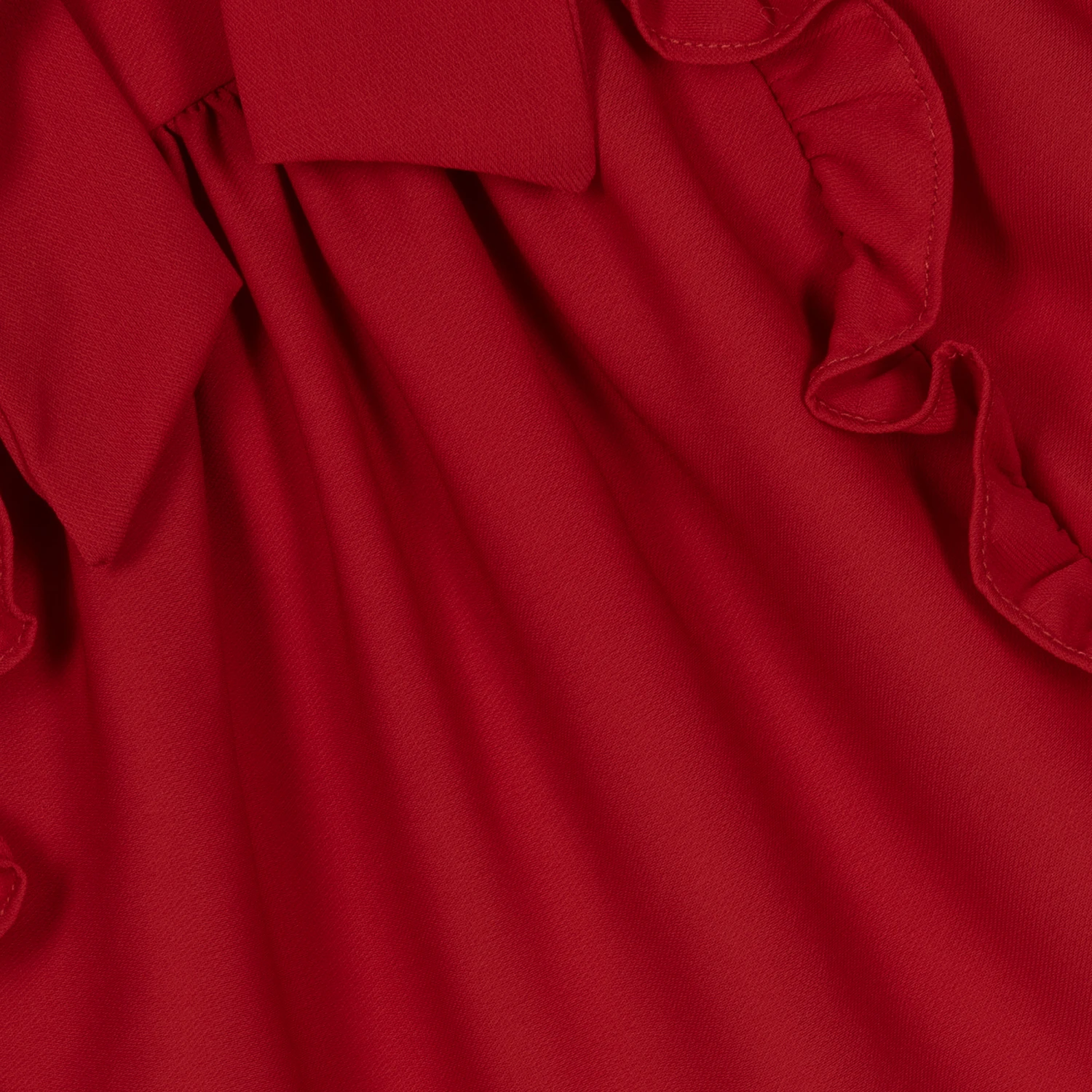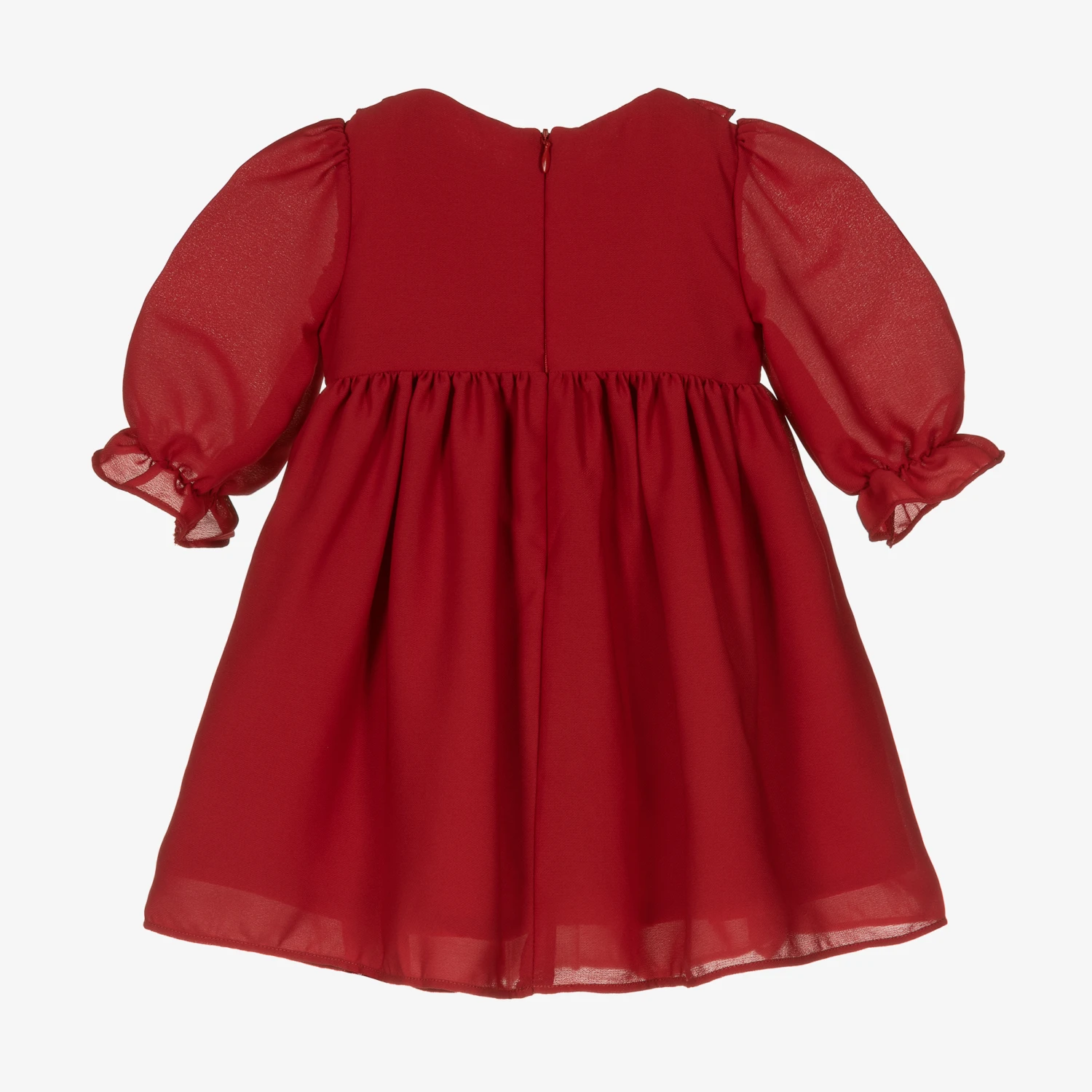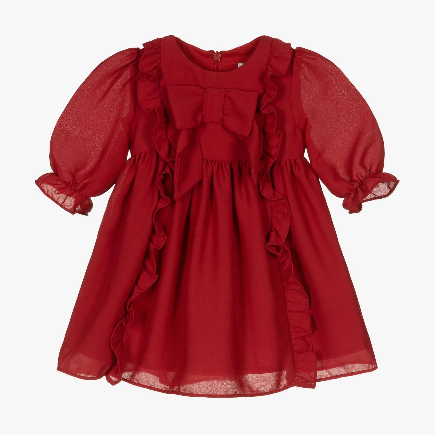 Adorable red dress for girls by Portuguese designer Patachou, made in lightweight crêpe chiffon with a soft cotton voile lining. Evoking delicacy and charm, it has ruffled detailing and a bow appliquéd to the front, with elasticated frilly cuffs. There is a concealed zip fastening on the back for a beautifully seamless finish.