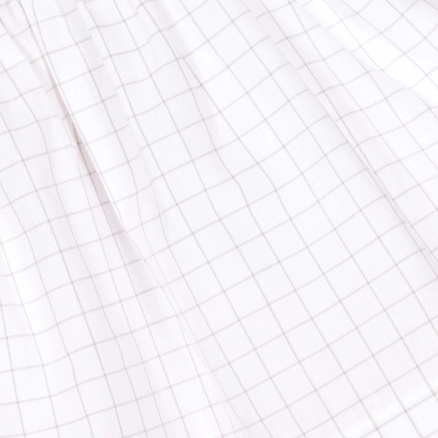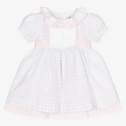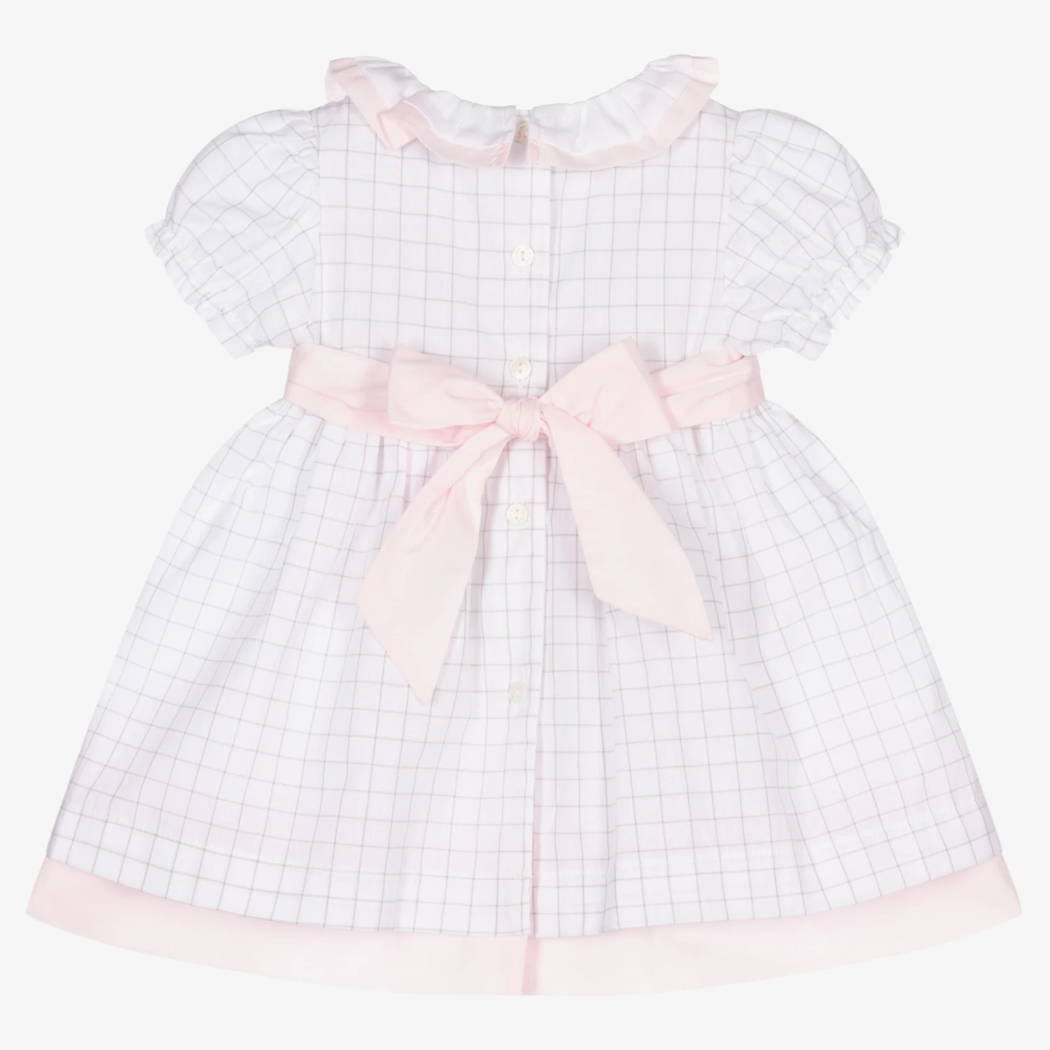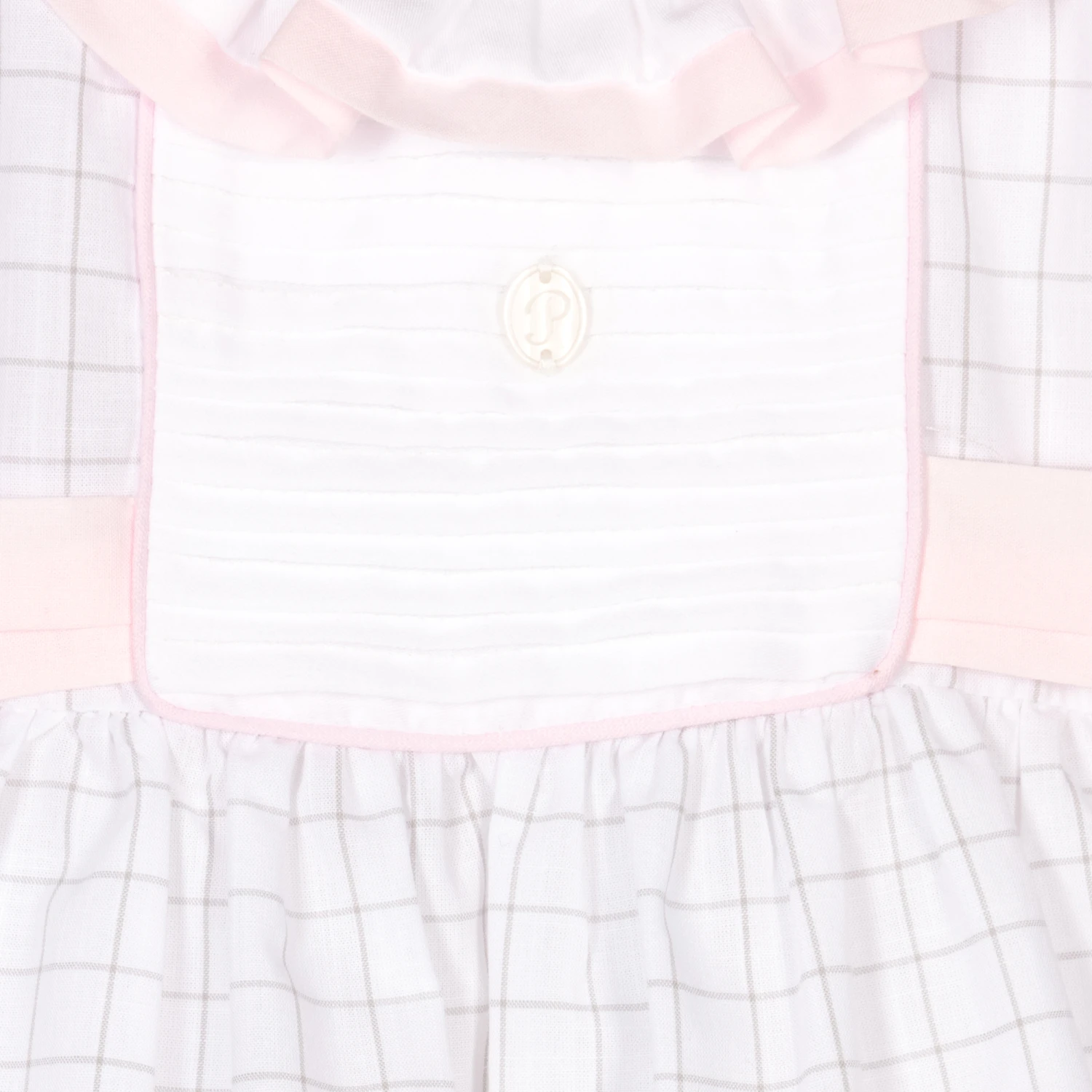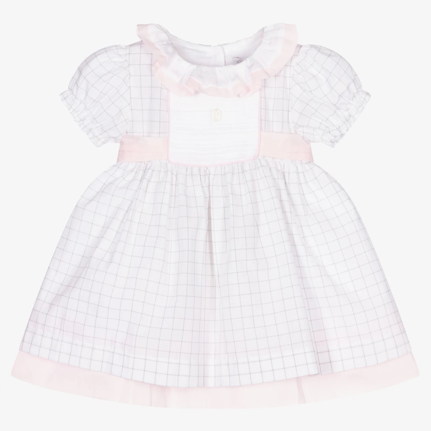 A beautiful white and grey check dress for little girls by Patachou. It is made and lined in lightweight cotton with pale pink trims and a fixed sash to tie on the back. It has a sweet ruffled collar and gently elasticated puffed sleeves. The brand’s pearlised logo charm is stitched on the pleated front detail.