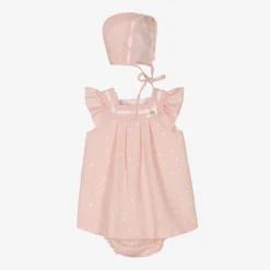 A lovely dress set for baby girls by Paz Rodriguez. In pink crinkled effect fabric with a white spotted effect, this three-piece outfit includes a dress, bonnet and matching knickers. Traditionally styled, the bodice is trimmed with ribbon and lace and has capped sleeves and back button fastening with a cotton lining. The matching bonnet fastens with ties and the knickers have an elasticated waist and leg holes.