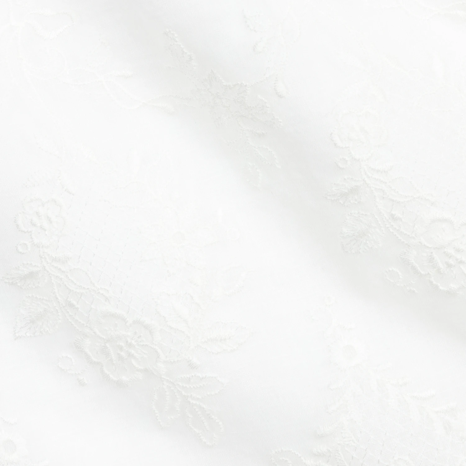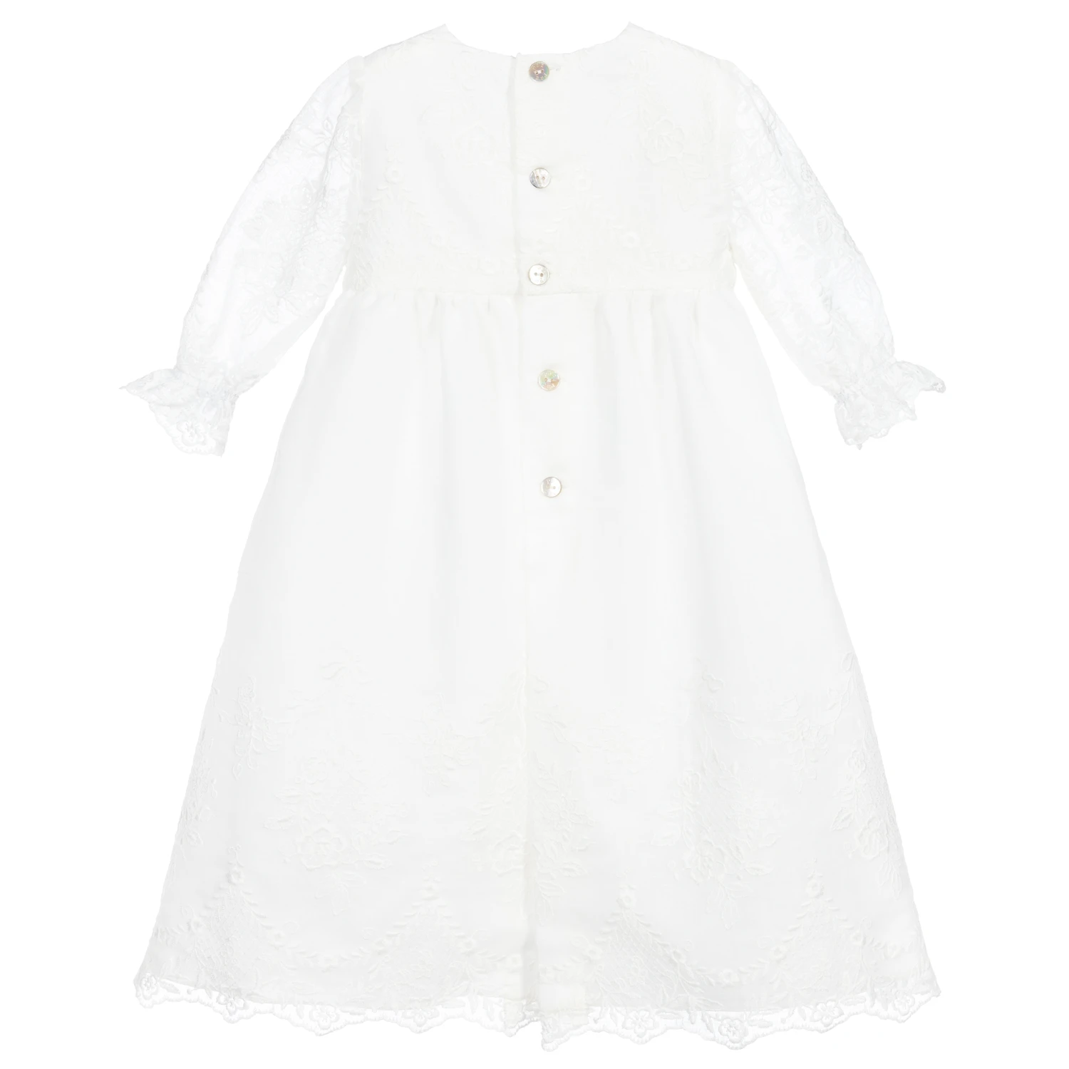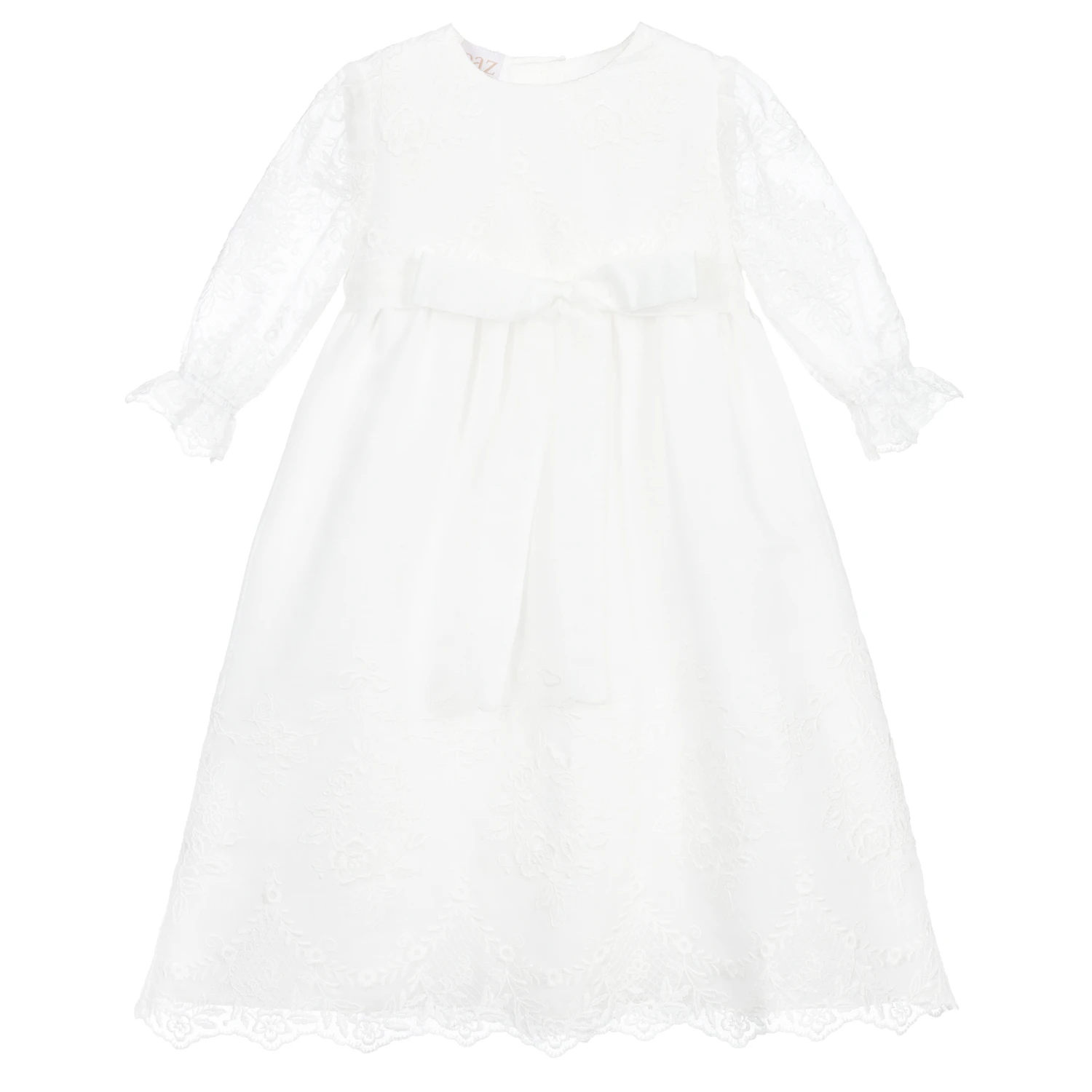 A beautiful ivory long ceremony dress for little girls by Paz Rodriguez. It has a layer of fine voile with delicate embroidery over a soft, lightweight base layer. There is a sash bow on the front that may be adjusted for a comfortable fit and pretty mother of pearl button fastenings on the back.