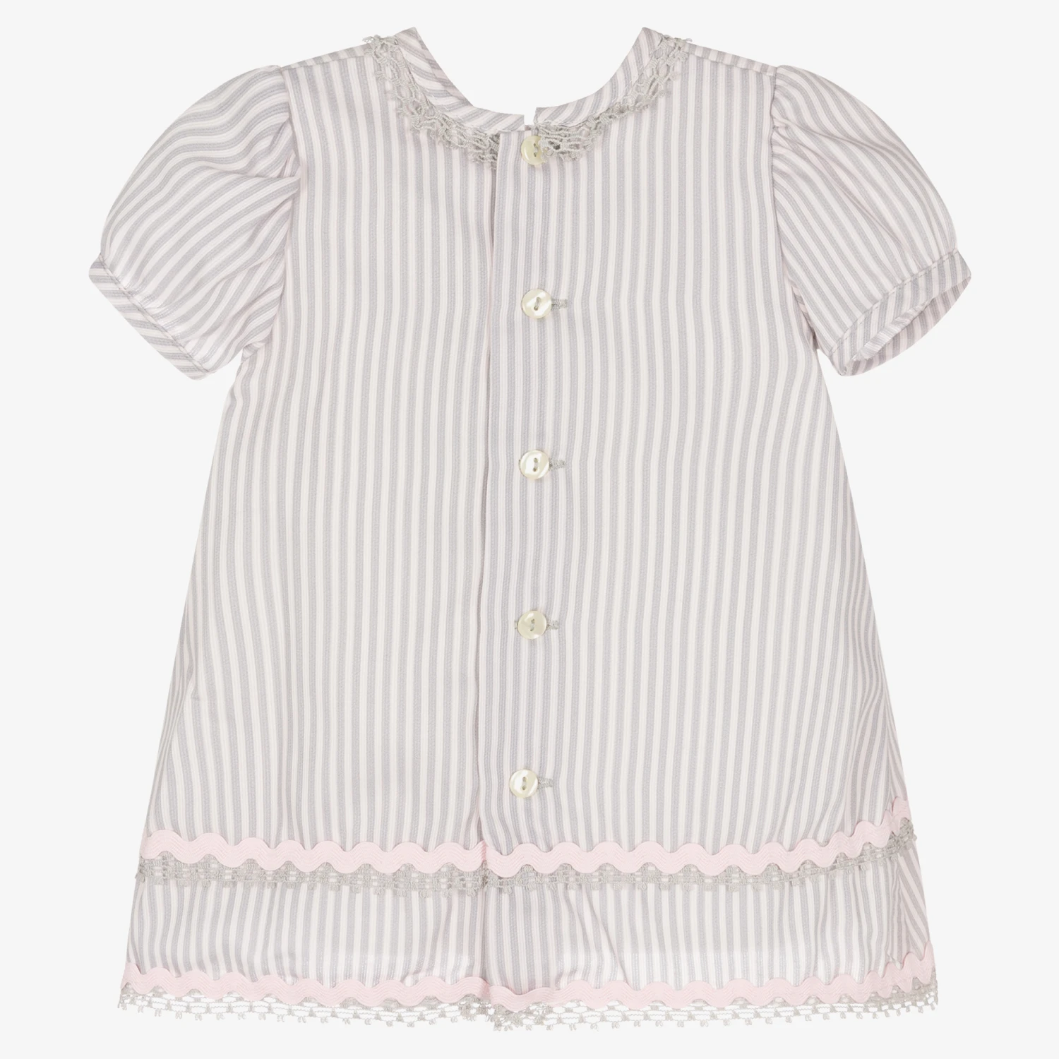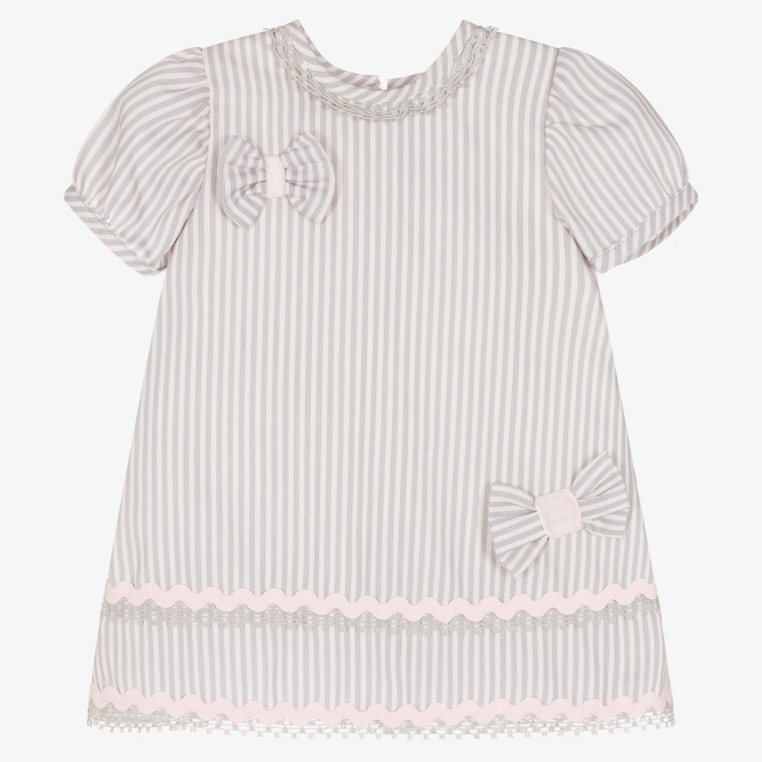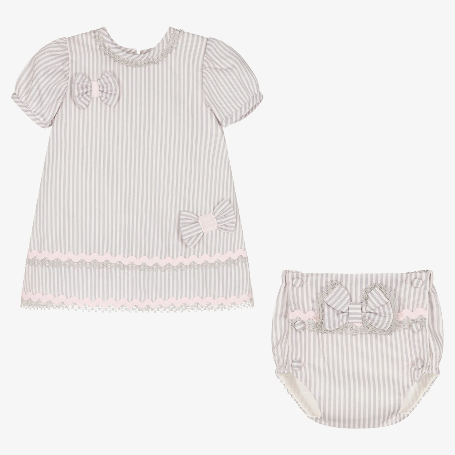 Adorable grey and off-white striped dress and knicker set for little girls by British brand Pretty Originals, made in a soft twill. Beautifully feminine, this stylish A-line dress has puffed capped sleeves, statement bows on the front, and contrasting pink ric rac trims. Fully lined in a lightweight and breathable voile, it fastens with pearlescent buttons on the back. The matching knickers have side button fastenings and are gently elasticated on the legs for comfort.