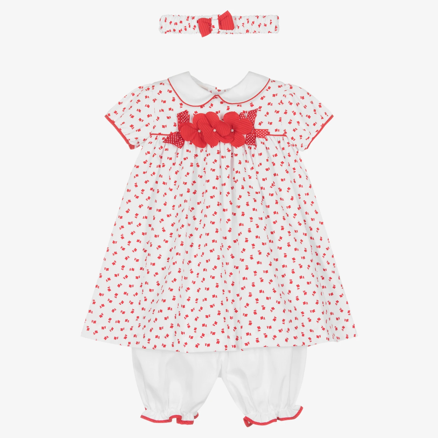 Beautiful red and white dress set for little girls from British brand Pretty Originals, made in a delicate cotton twill. Patterned in a ditsy red floral print, this traditionally styled dress has a rounded collar and puffed cap sleeves. It has gorgeous appliqué flowers with faux pearl centres, and polka dot grosgrain ribbons on the bodice. Fully lined in a soft, lightweight voile for comfort, it fastens with buttons and a sash around the back. It comes with white bloomers that have gently elasticated, frilled cuffs and a matching headband for a co-ordinated look.
