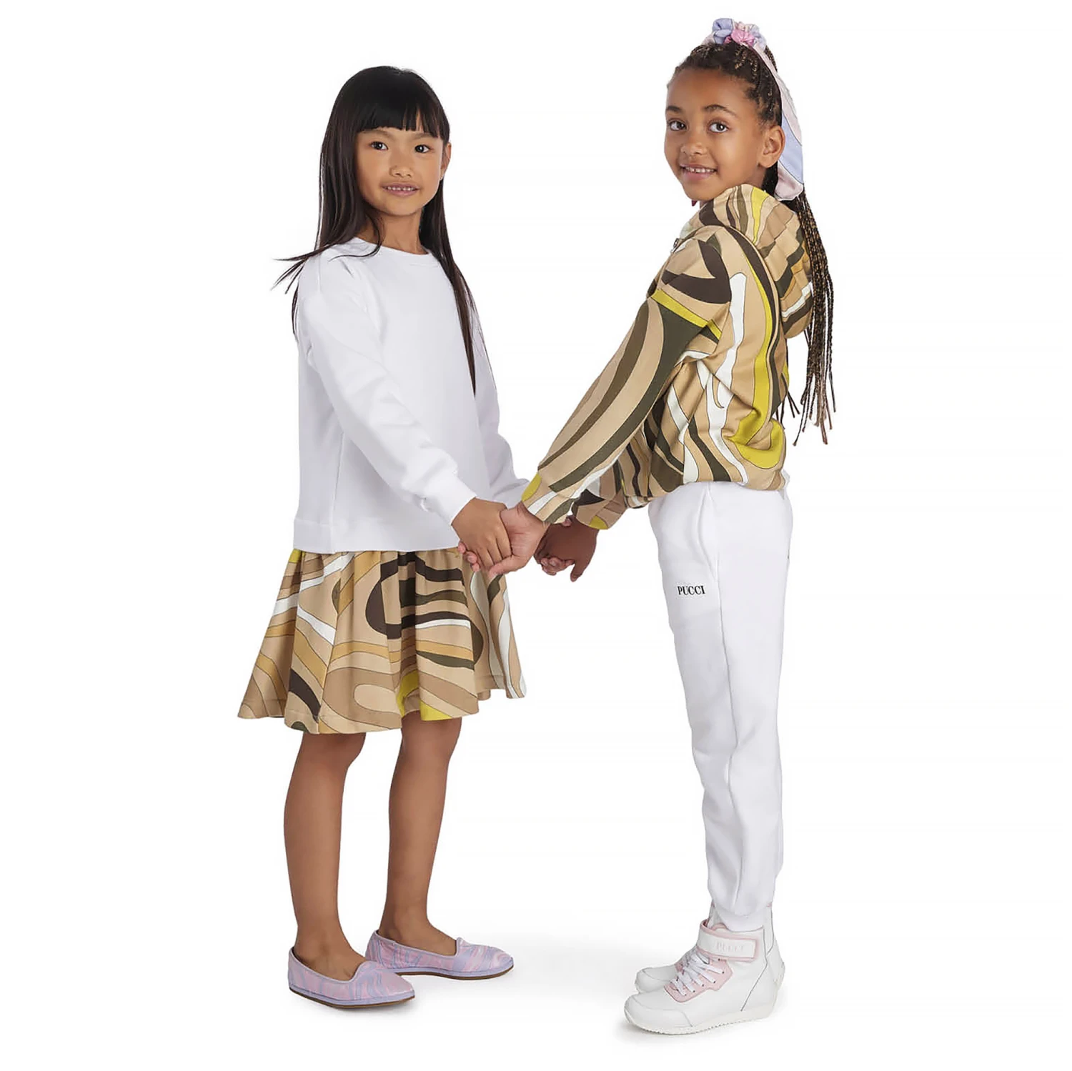 Ivory sweatshirt dress for teen girls from luxury Italian designer Emilio Pucci, with a stunning beige and green Marmo print skirt. With the design of two pieces, it is printed with a discreet logo above the drop hem for a designer touch. It has a stylish shape and the mid-weight organic cotton jersey is comfortable, ideal for relaxed days.