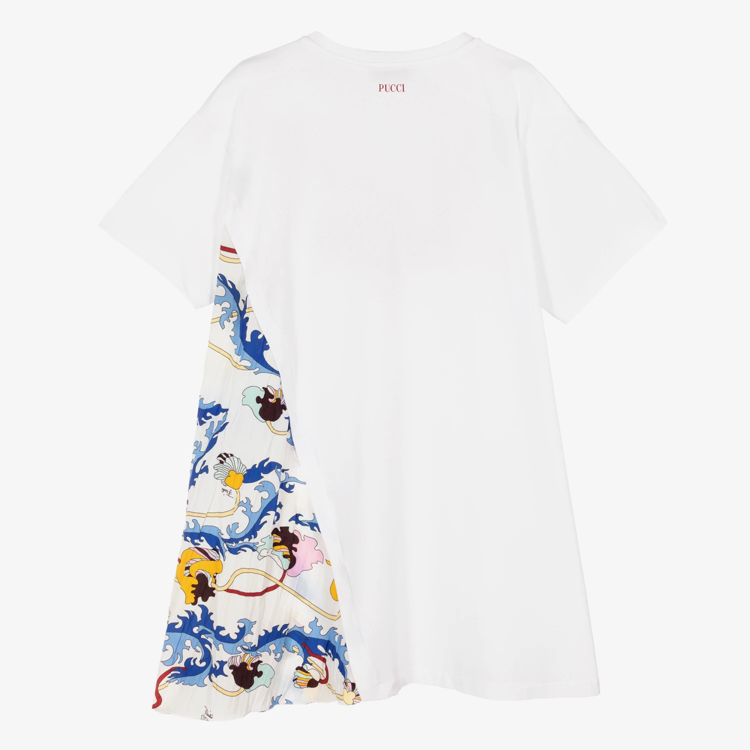 White T-shirt dress for Teen girls by Italian designer Emilio Pucci, known for it’s iconic use of psychedelic prints. Made in comfortable cotton jersey, it has a side panel of crinkled silky polyester, patterned with the brand’s Ranuncoli print in blue, pink and yellow. Loose-fitting and endlessly comfortable, it has a brick red logo printed around the back of the neck.