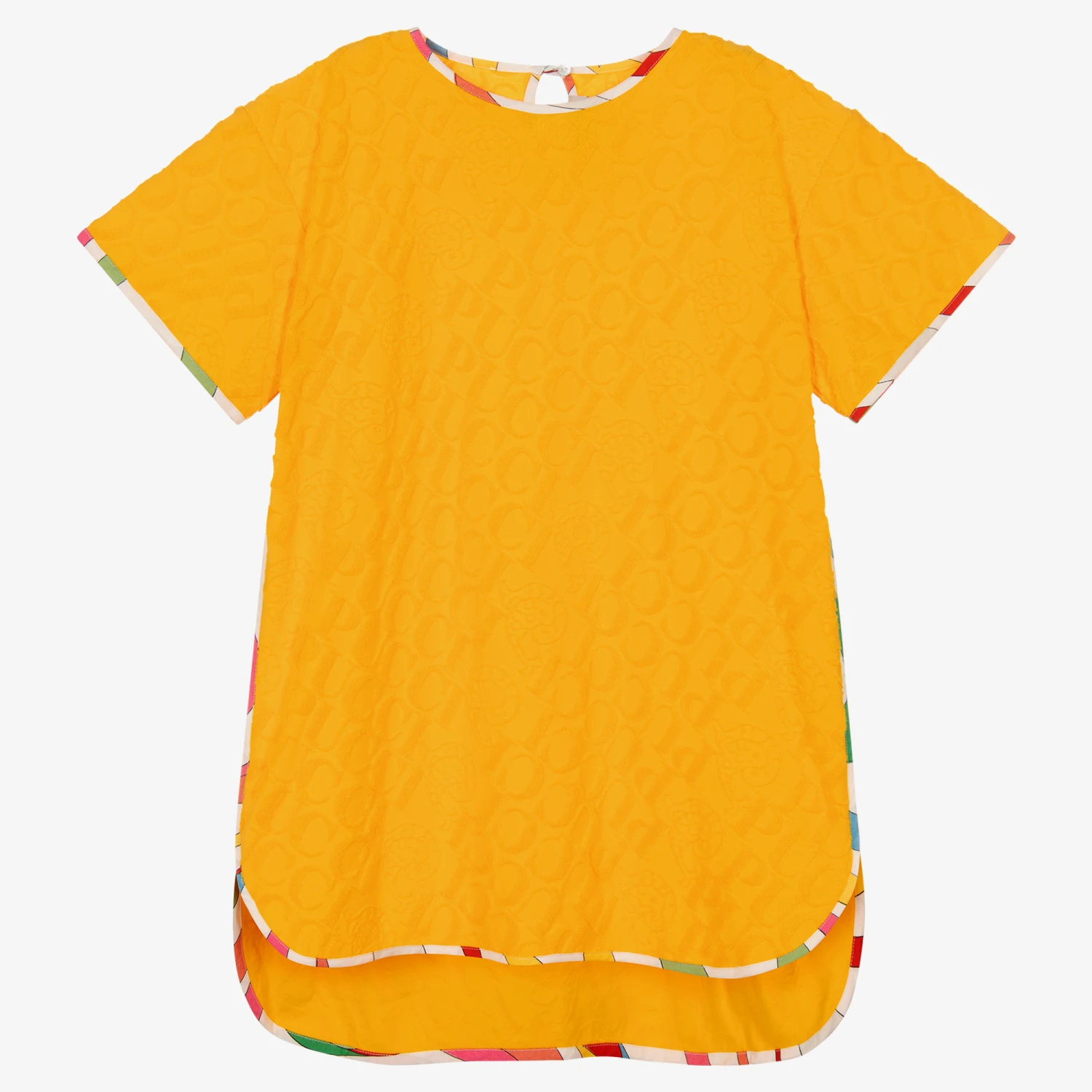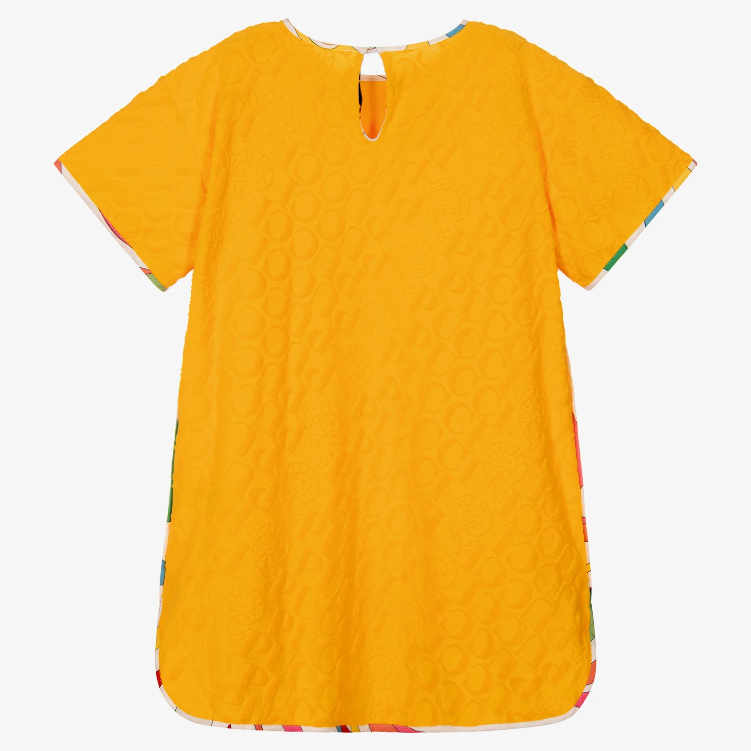 Bold and bright, this deep yellow cotton dress for teen girls is designed by Emilio Pucci. A tonal flocked jacquard logo design decorates this relaxed style, incorporating the brand’s spell-out and fish logo motif. The colourful, linear Marmo artwork details the trims for a quirky look. Great for lounging on the beach or as a cover up, this effortlessly chic piece adds a pop of colour to any summery occasion. It fastens with a keyhole fastening on the back and is made in lightweight cotton blend jersey.