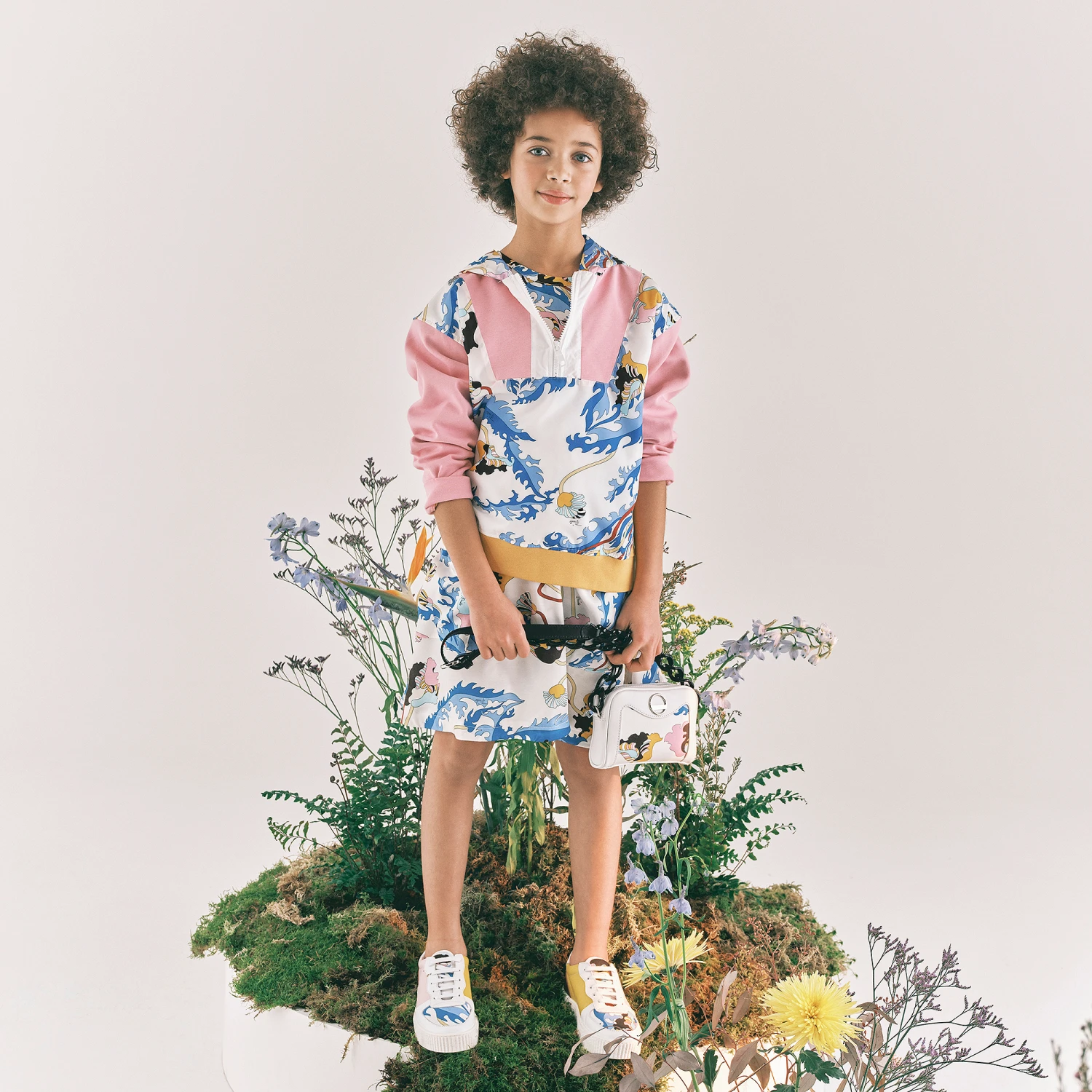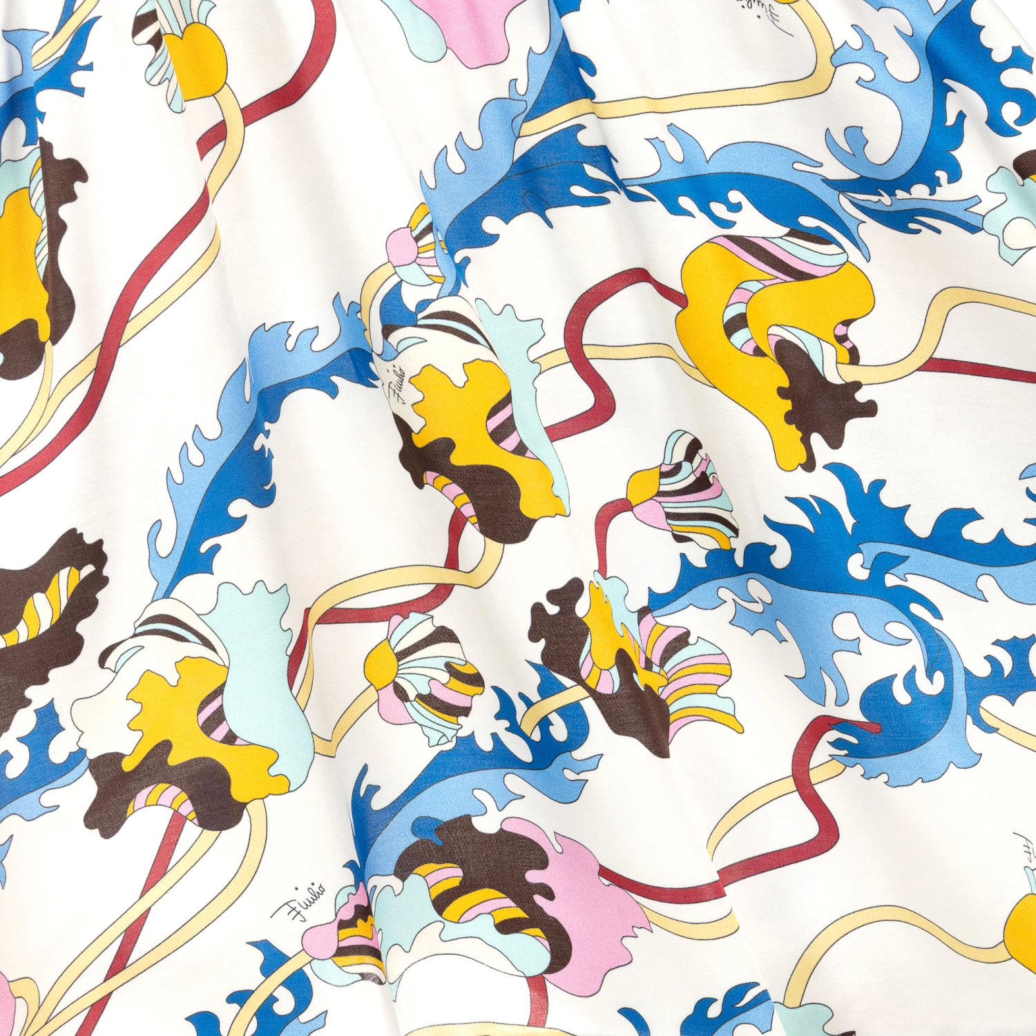 Elegant white and blue dress for teen girls by luxury Italian brand Emilio Pucci, made in a luxuriously soft silk blend. Patterned with the brand’s psychedelic blue and yellow tonal Ranuncoli print all-over, it has an elasticated waist for a lovely shape, and two large skirt pockets.