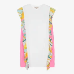 Beautiful white dress for teen girls, by luxury Italian brand Emilio Pucci. Made in soft cotton jersey, it has pink panels on the sides, trimmed with the brand’s yellow, pink and green psychedelic Lance print ruffles. In a lovely A-line shape, it has the brand’s subtle crest logo rubberised on the chest in white.