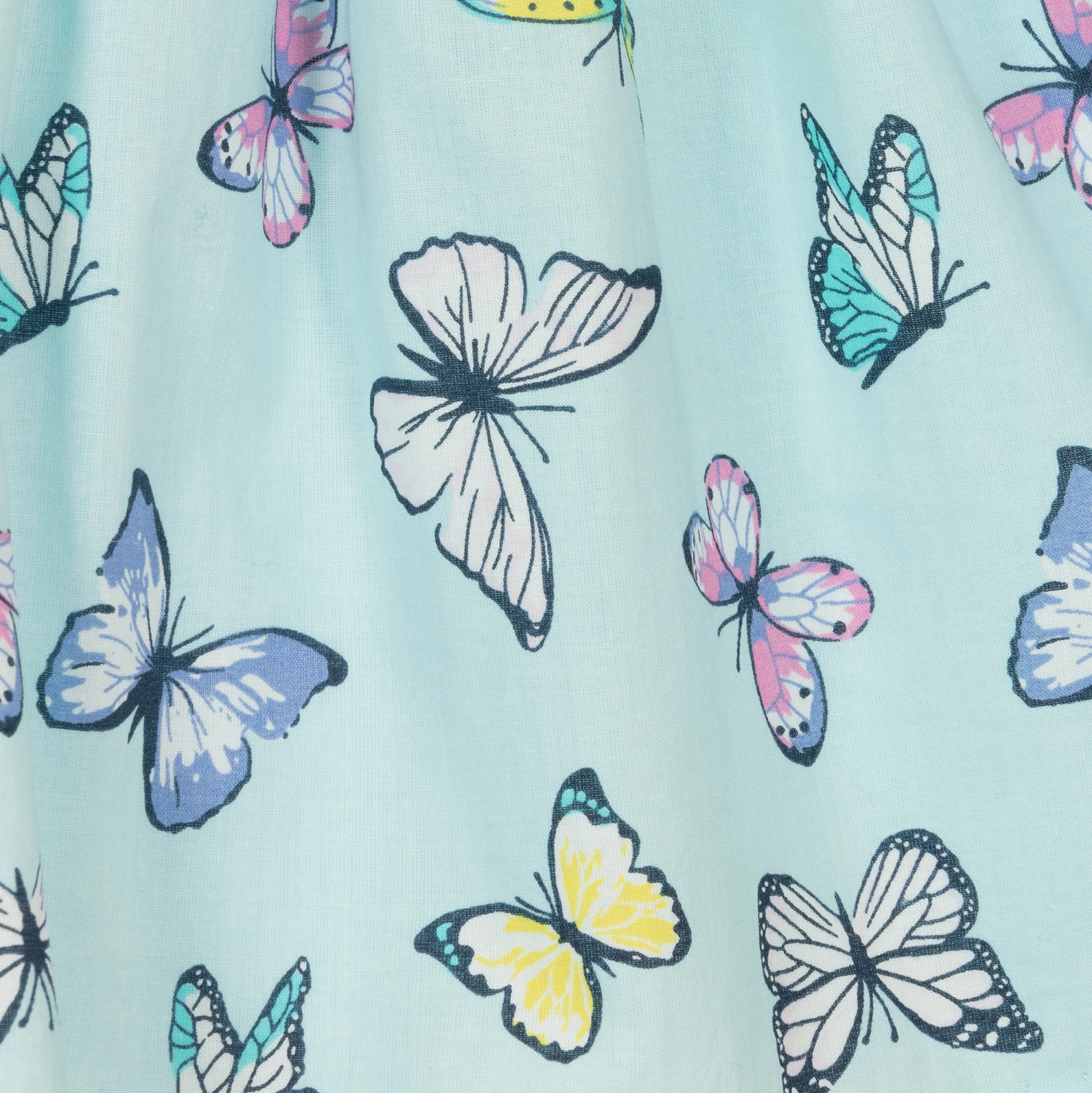 Light blue sleeveless dress for baby girls by British designer Rachel Riley, made and lined in soft cotton. Paired with pretty matching knickers, it has romantic ruffled trims on the bodice to create a delicate, feminine look. There are pearlescent button fastenings on the back.