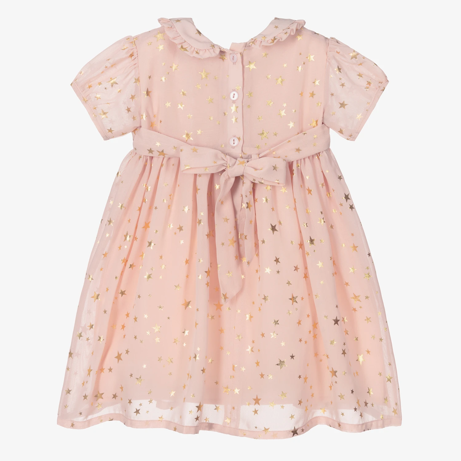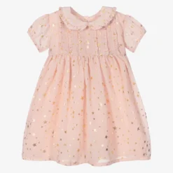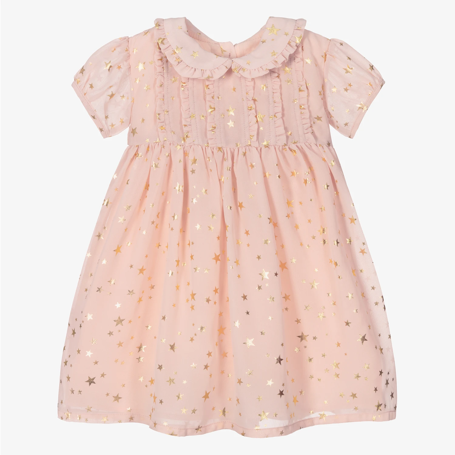Dusky pink dress for baby girls, by British brand Rachel Riley. Lined in soft cotton voile, it has a shiny gold star print all-over, a rounded collar and pleats on the front with ruffle trims. The chiffon material hangs beautifully and the puffed sleeves give this dress a traditional feel. It fastens with buttons on the back for easy dressing.