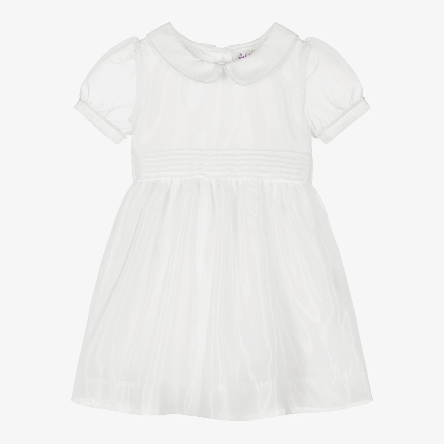 Beautifully classical, this off-white dress for baby girls is from British brand, Rachel Riley. Made from delicate organza, it has a Peter Pan collar, sheer puff sleeves and neat pintucks on the bodice. Lovely for special occasions, it has pearlescent button fastenings, with a fixed adjustable belt at the back. This dress is finished with a silky soft satin and tulle lining.