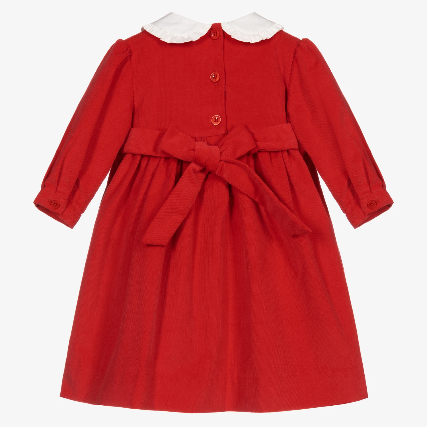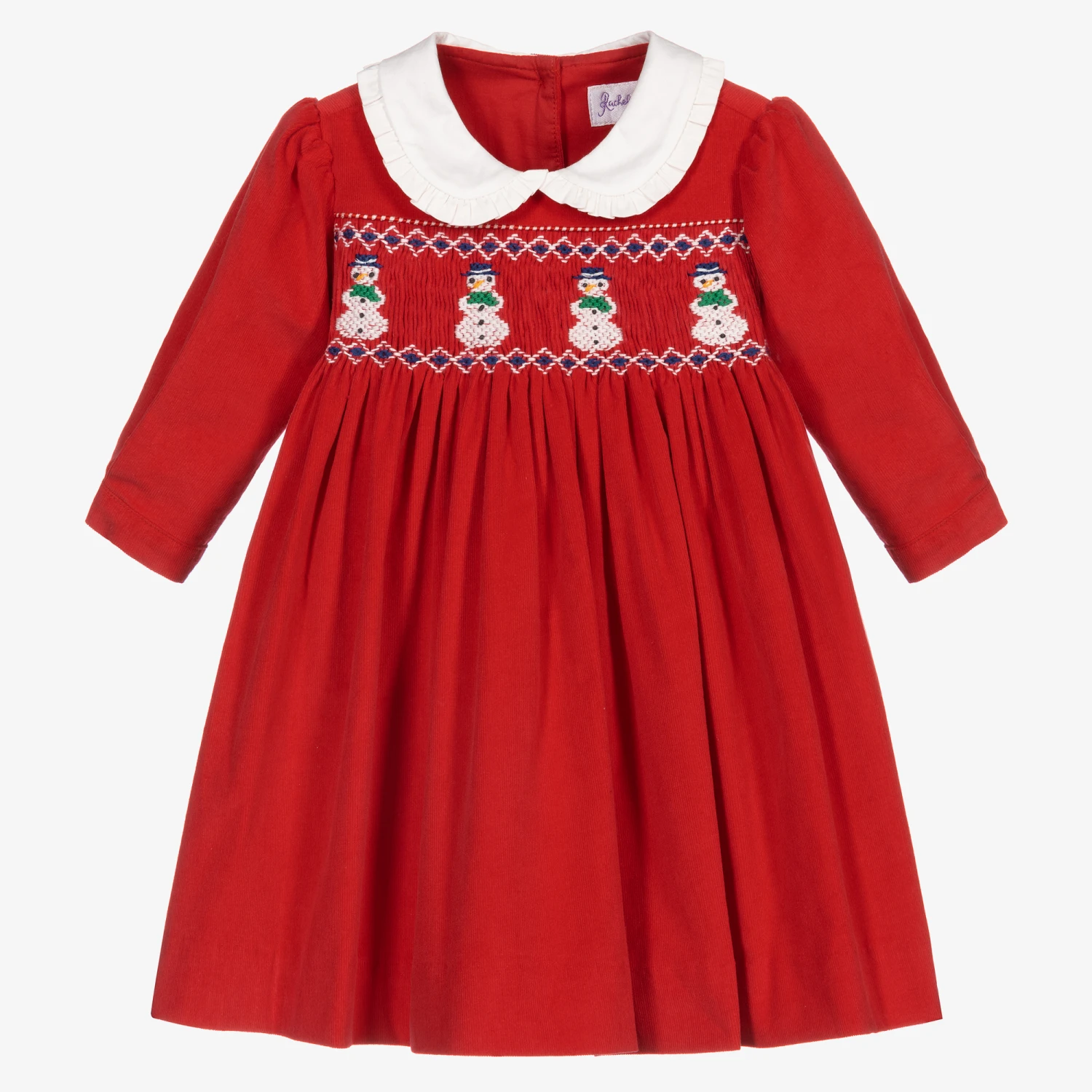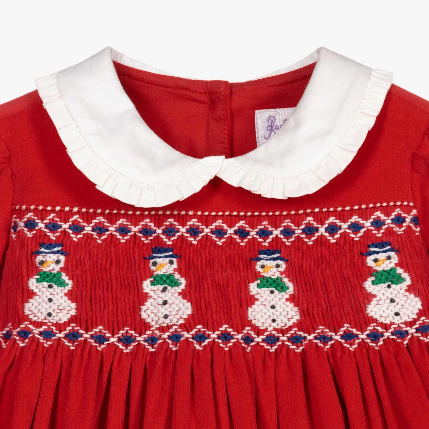 Baby girls pretty red dress by British designer Rachel Riley, made in soft cotton needlecord. It is beautifully hand-smocked and embroidered with cute white, navy blue and green snowmen. There is a smart white frilled collar, with button fastenings and a tie-belt on the back. It is lined in a lightweight cotton.