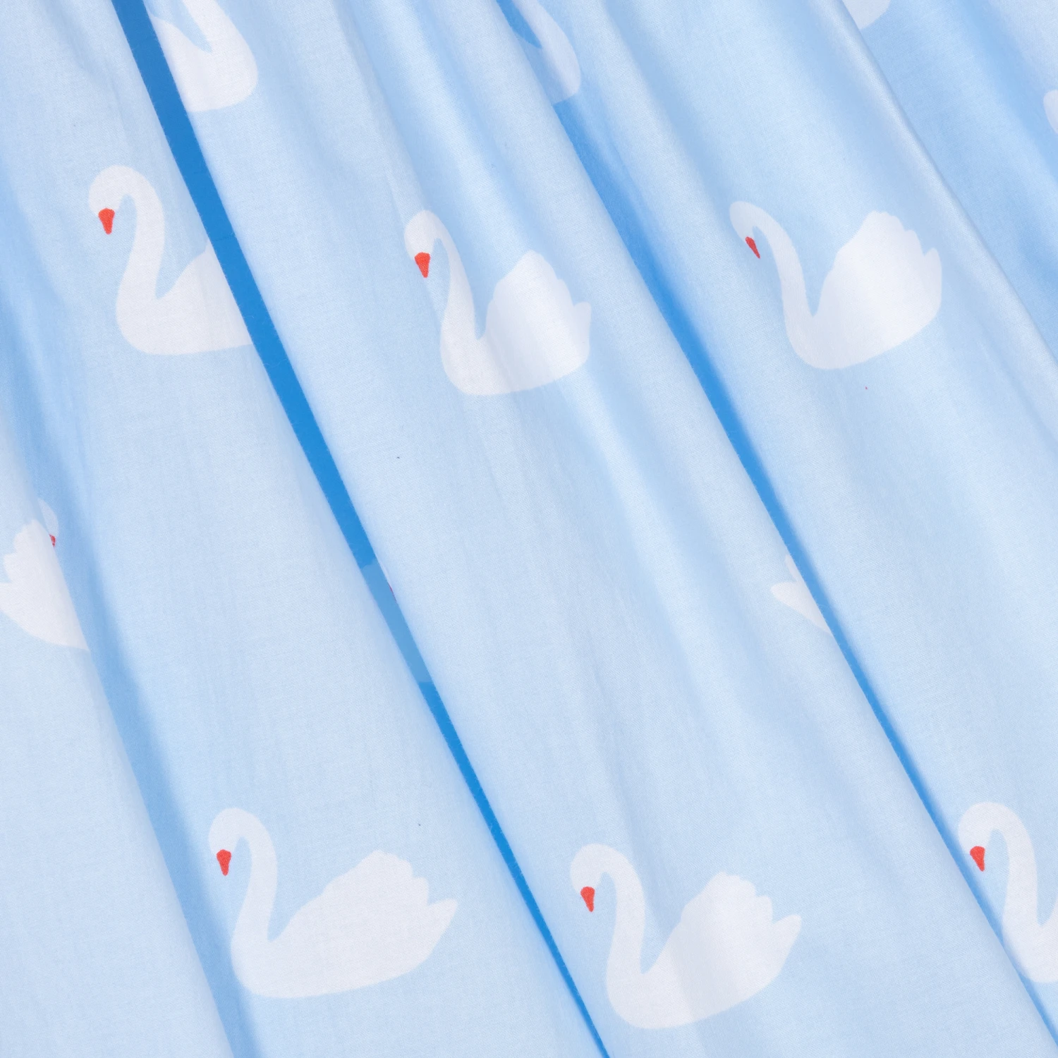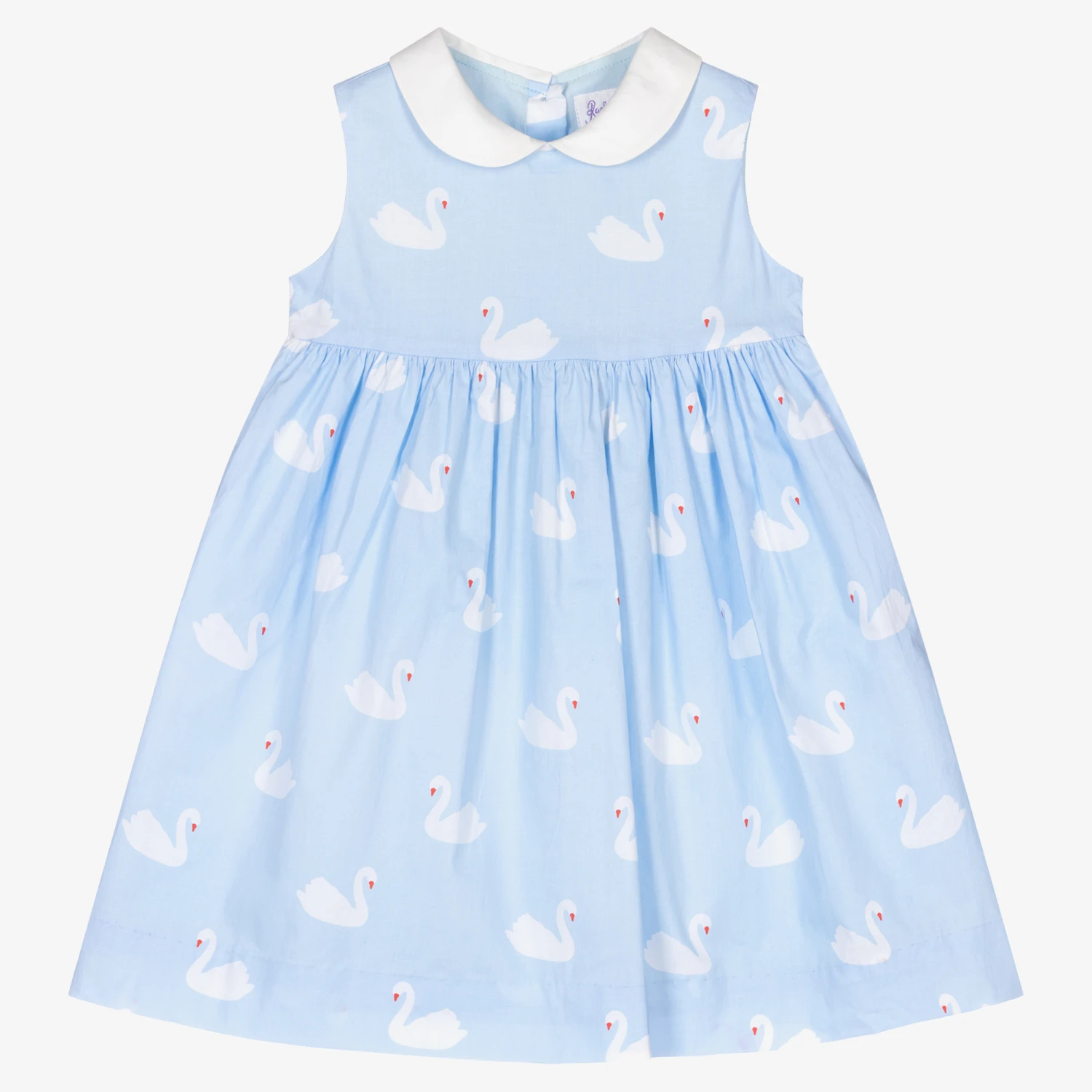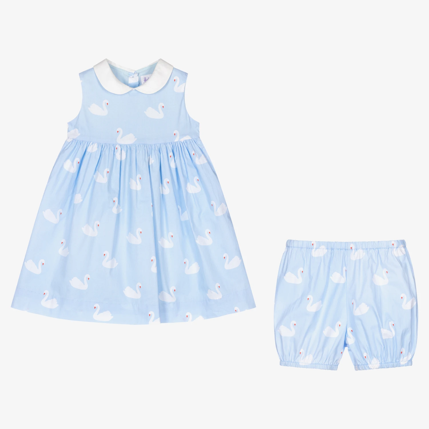 Baby girls blue dress and bloomers set by Rachel Riley, made with soft and lightweight poplin. Fully lined in lightweight voile, it has a white swan print and a round white collar. It has back button fastenings and an attached sash that ties in a bow. It comes with a matching pair of bloomers.