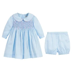 Lovely pale blue dress for baby girls by Rachel Riley, with pale pink trim and exquisite hand-smocking and hand-embroidery. Made in soft and lightweight cotton, the dress is fully lined and comes with matching bloomer-style knickers.
