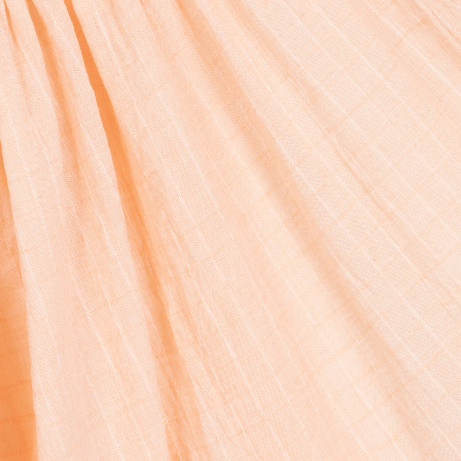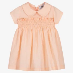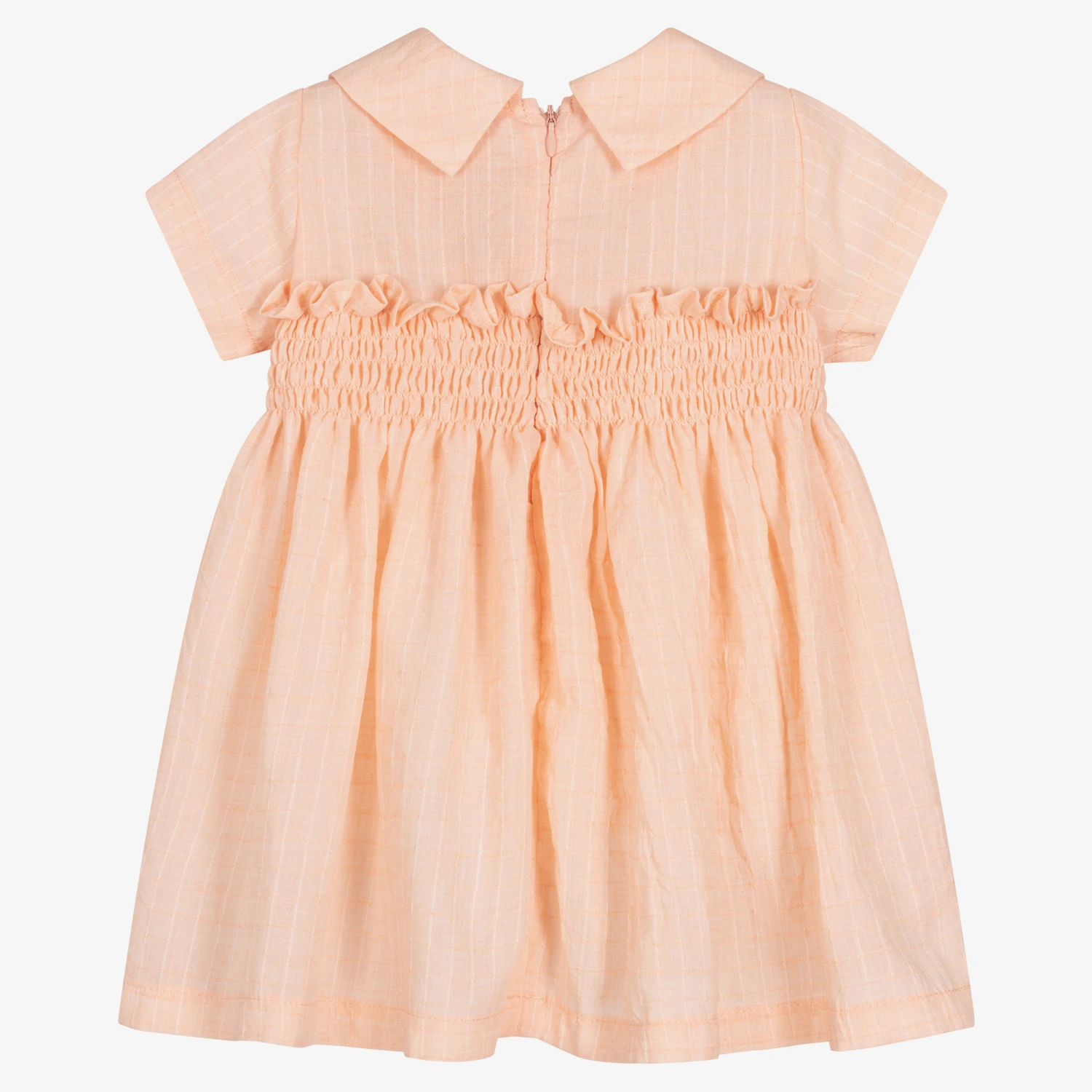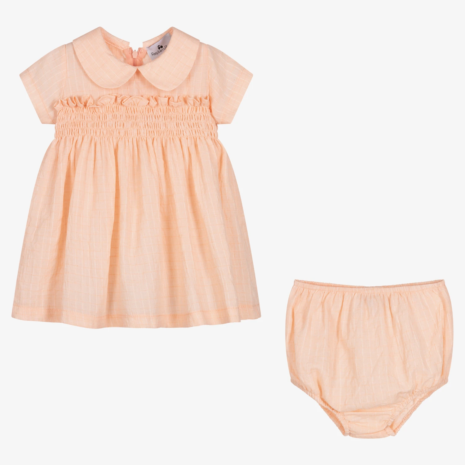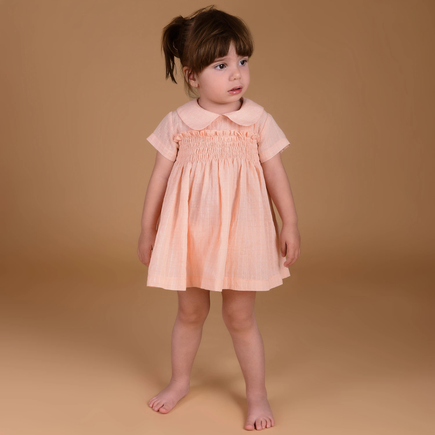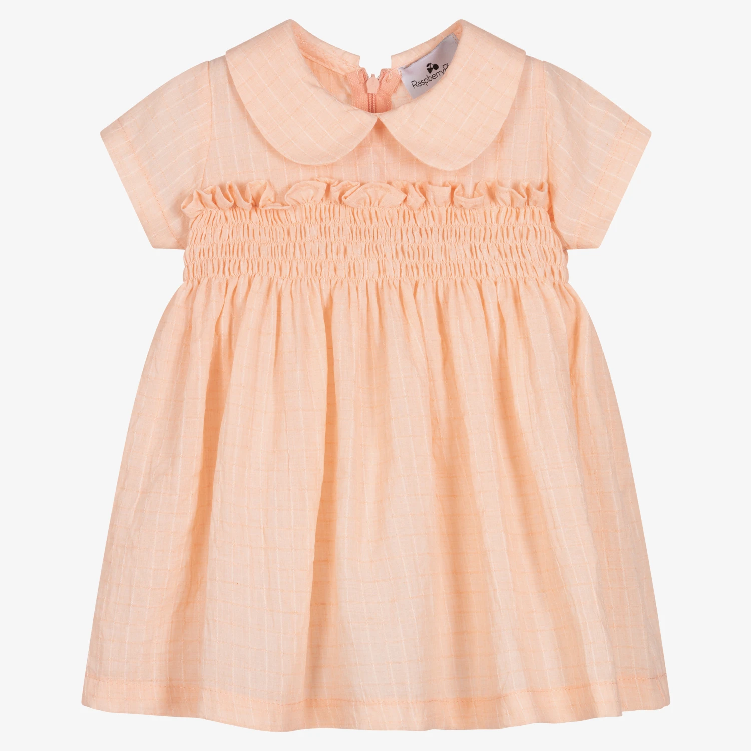 Pastel orange dress for baby girls by London-based designer, RaspberryPlum. Soft and lightweight, the cotton blend fabric has a delicate grid pattern, with a ruched bodice and oversized collar. There is a concealed back zip fastening a pair of matching bloomer knickers are included.