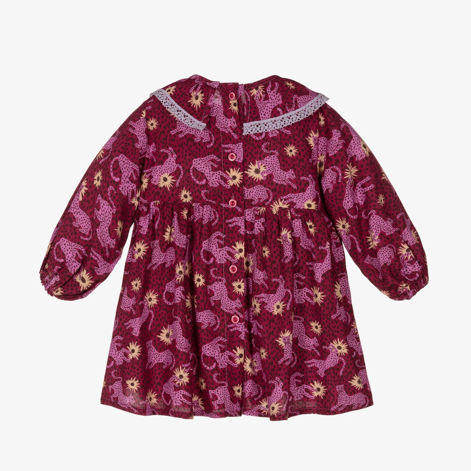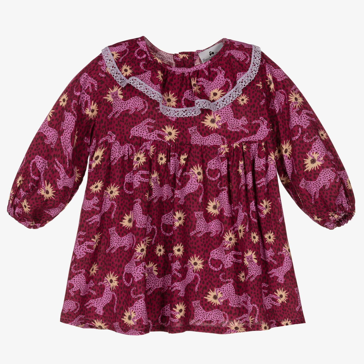 In a gorgeous magenta purple shade, bohemian-inspired dress for baby girls by RaspberryPlum. With an empire waist and full floaty skirt, it has a vibrant cheetah and sunflower print, and pairs with matching knickers for an effortlessly cute and cool look.