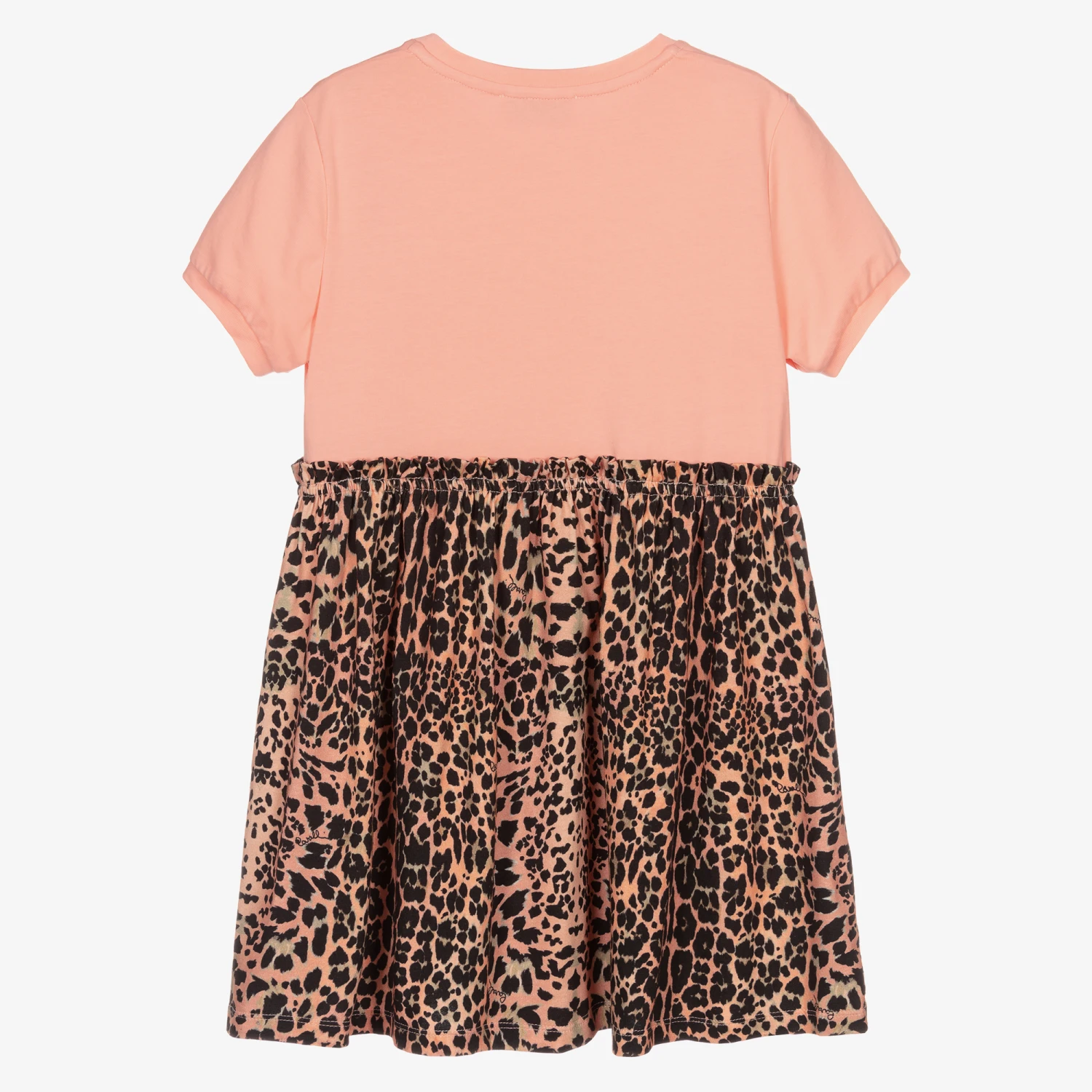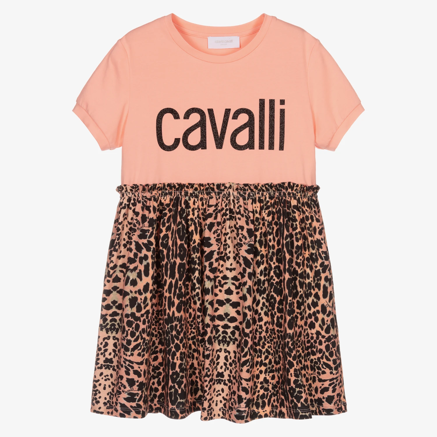 Pink dress for teen girls by luxury brand Roberto Cavalli, made in soft cotton jersey. The top has a sparkly black logo print on the front, while the skirt has a stylish leopard print in black and beige.