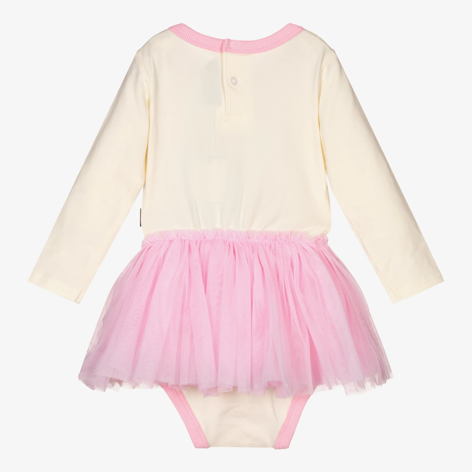 Ivory and pink tulle dress by Rock Your Baby, with a cute ‘Circus Bunny’ print on the front. The top half is made in soft and stretchy jersey, with a pink ribbed collar. The waistband is stretchy and there are multiple layers of tulle with a soft jersey lining.