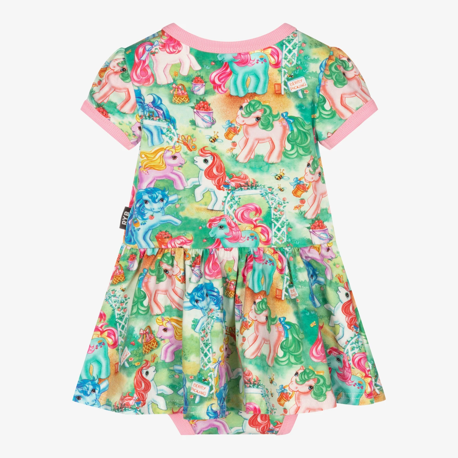 Green dress for baby girls by Rock Your Baby, with a colourful ‘My Little Pony’ print and pink trim. Made in soft cotton jersey, it has attached knickers with popper fastenings, and poppers on one shoulder.
