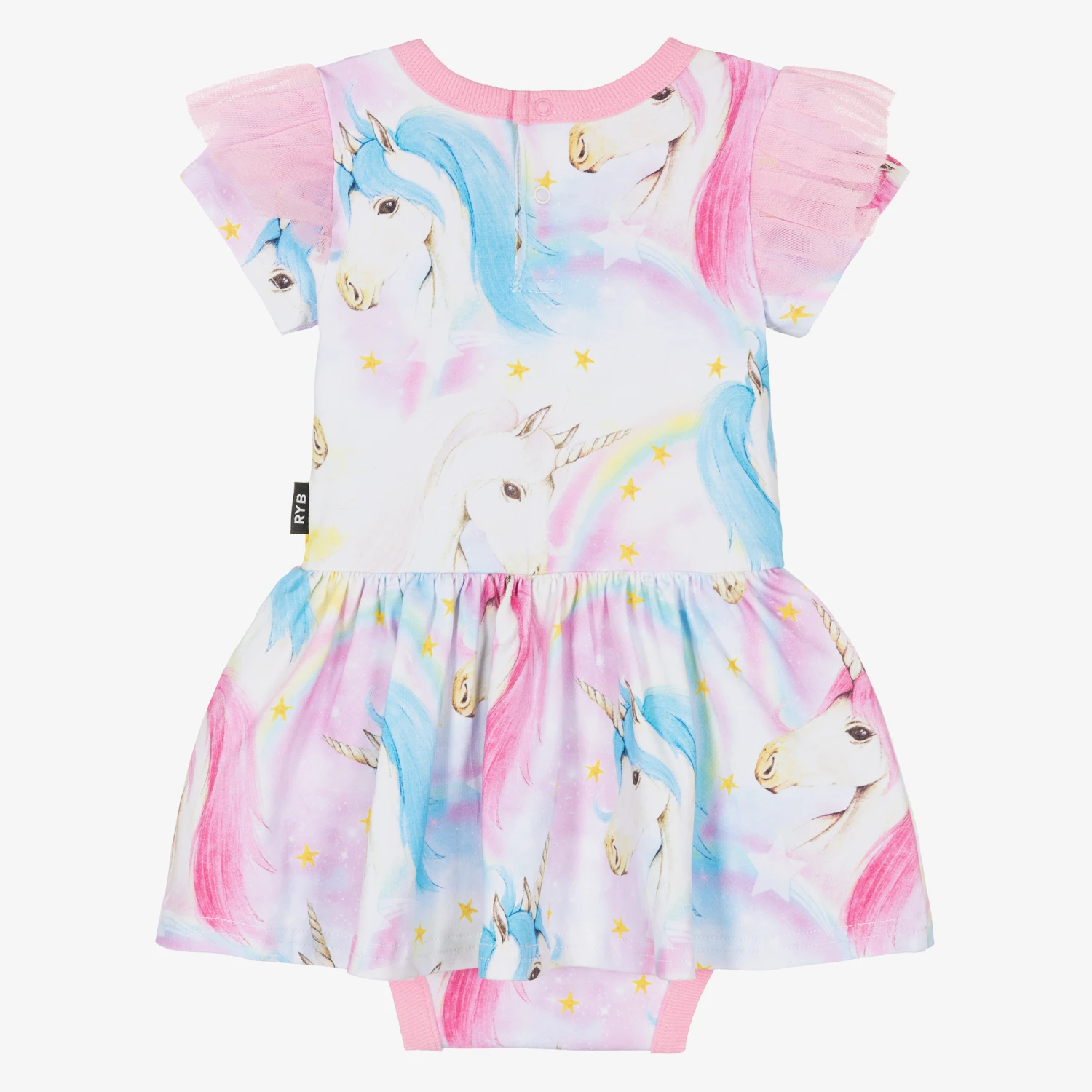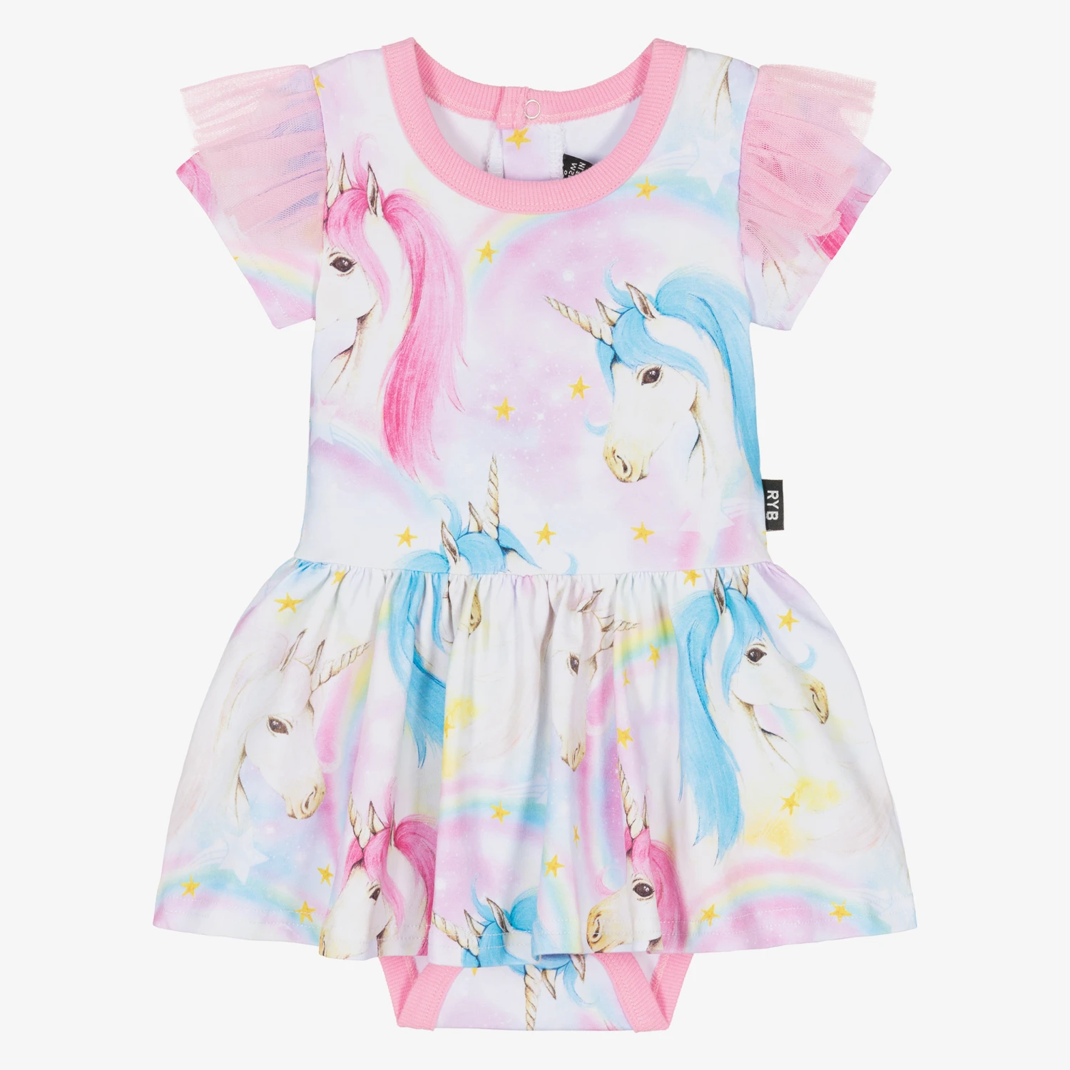 So sweet for baby girls, this fun pale pink and blue cotton dress is from Australian brand Rock Your Baby. This cute dress features an all-over galaxy print, with little yellow stars, pastel-coloured rainbows and friendly unicorn motifs. Layered under the skirt are attached knickers with popper fastenings between the legs for fuss-free changing. The capped sleeves are detailed with pink tulle for a girly look, and the neckline is trimmed with soft pink ribbed jersey. It is made in soft, stretchy and comfortable jersey, gentle on delicate skin.