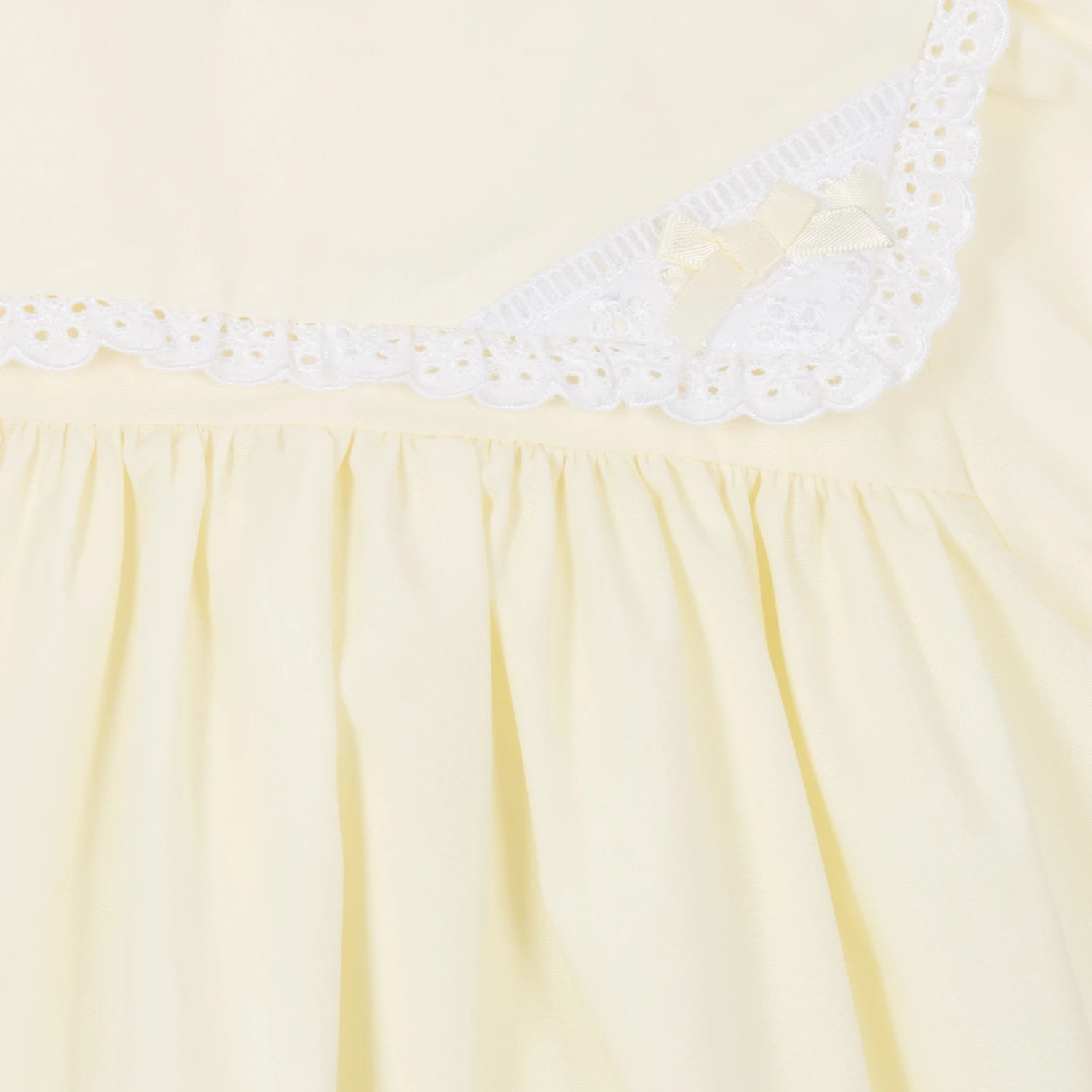 Lovely pale yellow dress for baby girls by Sarah Louise, woven in a soft and lightweight cotton blend fabric. Fastening with buttons on the back, this classic dress has a puffed sleeves and a bib front, both trimmed with white broderie anglaise ruffles. It is fully lined for added comfort and modesty.