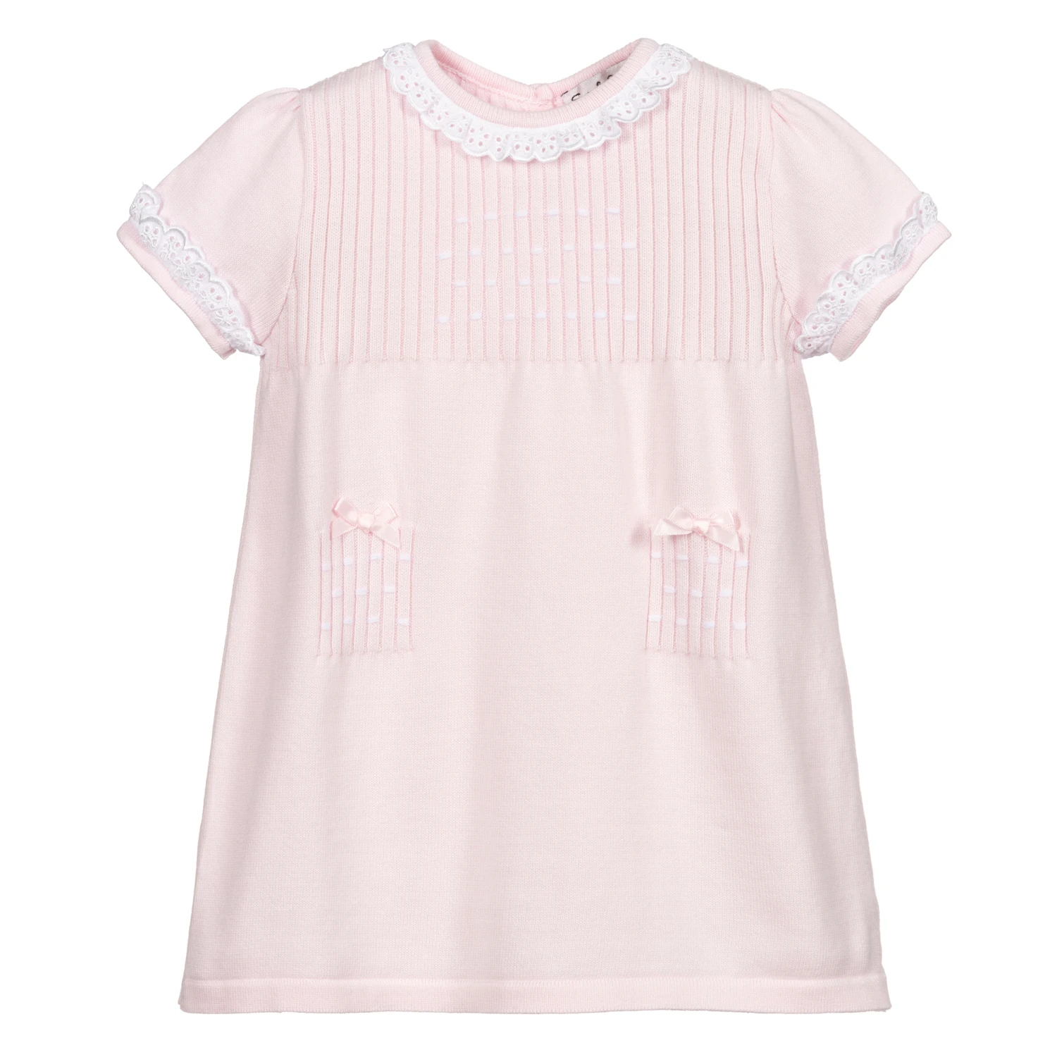 Sweet pink dress for baby girls by Sarah Louise, in a soft cotton knit. It has ribbing detail on the bodice, white broderie anglaise trim and pink satin bows on the front.
