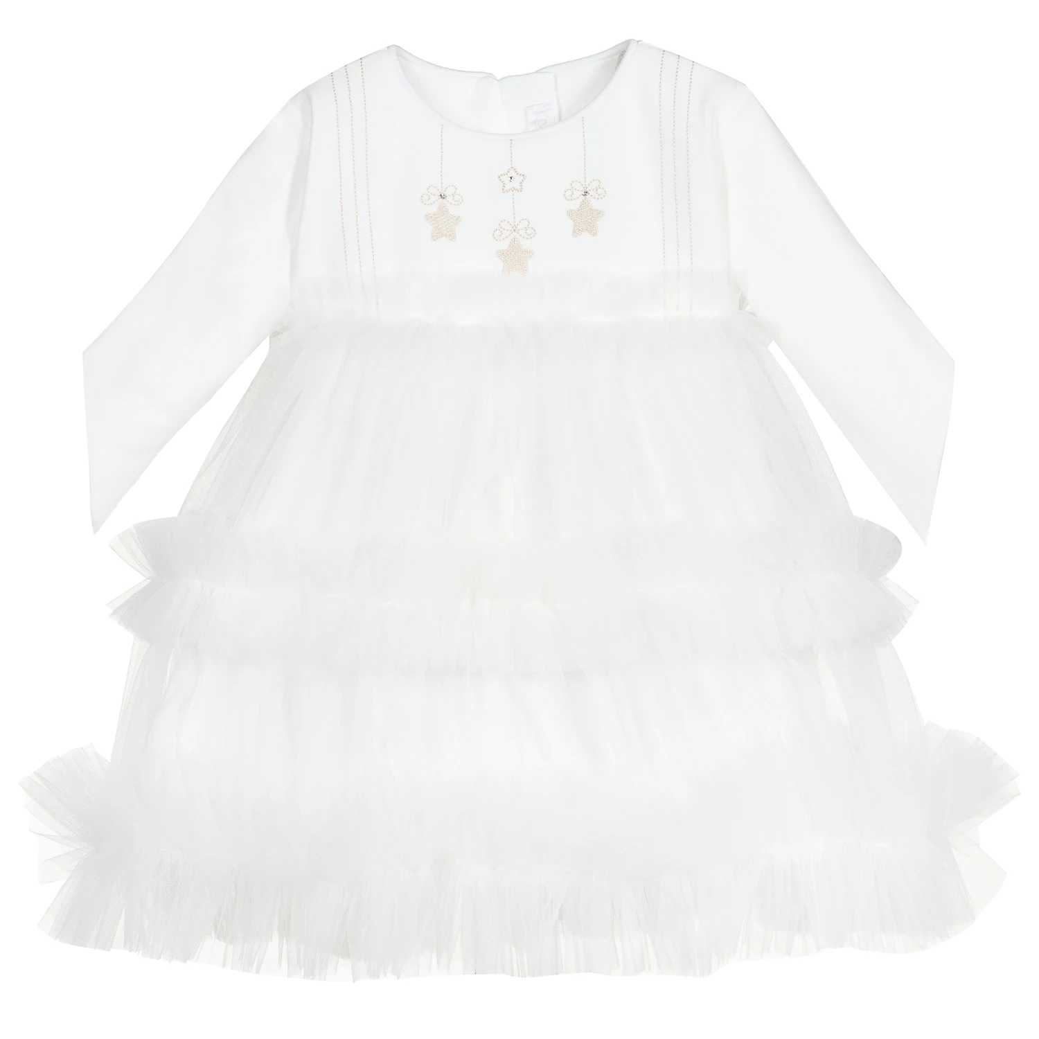 Ivory dress for baby girls by Sofija, exclusive to Childrensalon. Made in soft cotton jersey with an ivory tulle overlay, there are beautiful beige hanging stars embroidered on the chest. The cuffs are asymmetric and there are sweet angel wings sewn onto the back.