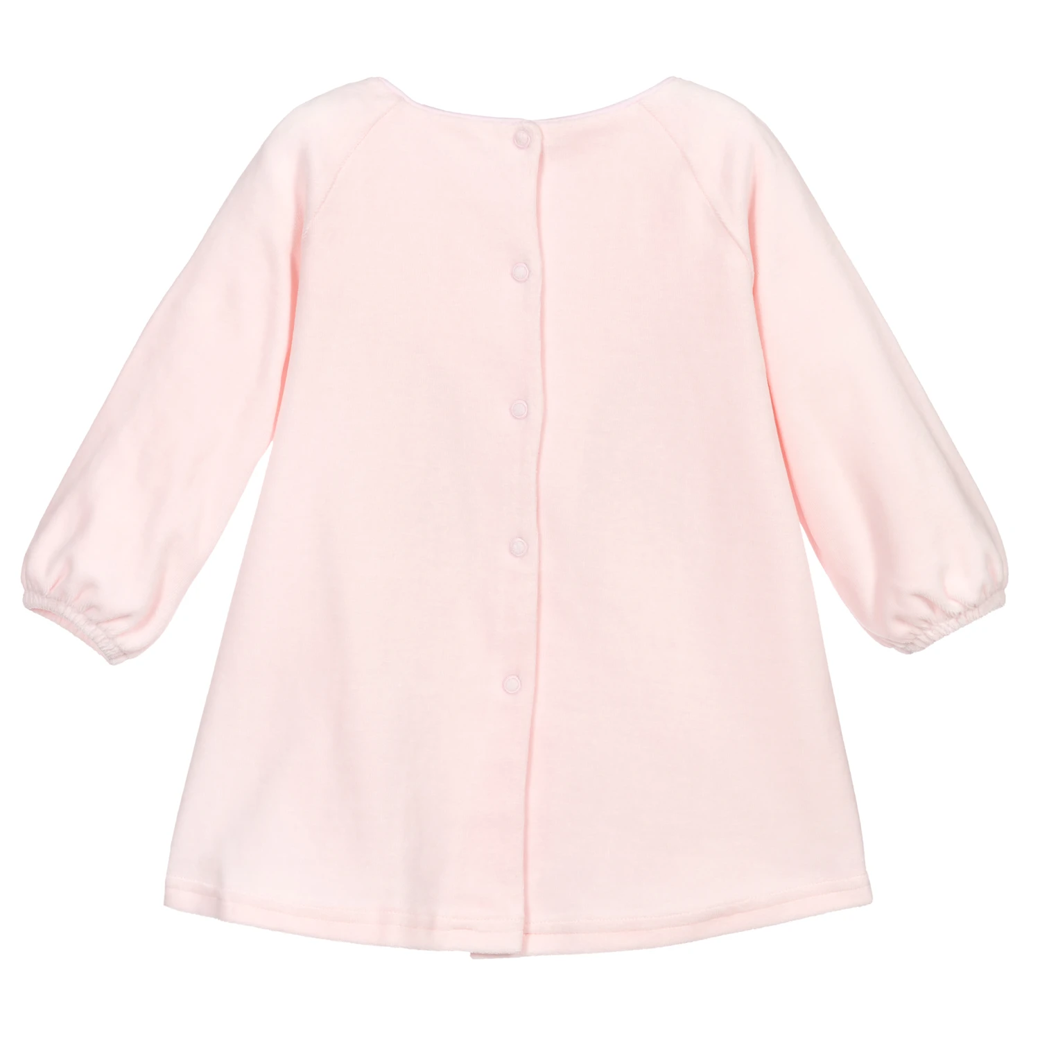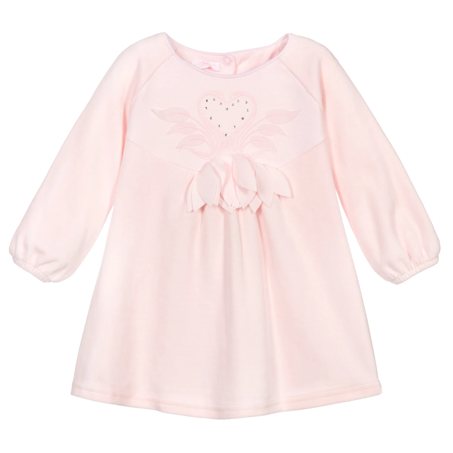 Baby girls lovely pale pink dress from Sofija, an exclusive to Childrensalon. It is made in soft cotton velour in a loose A-line silhouette. The front is embroidered with beautiful swans with sparkly diamanté and 3D flower petal appliqués.