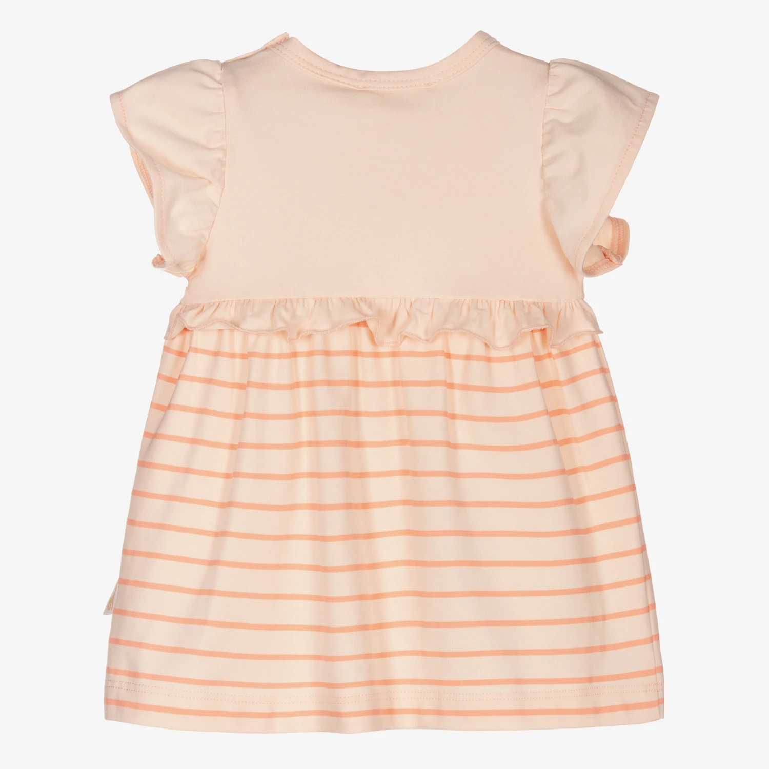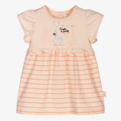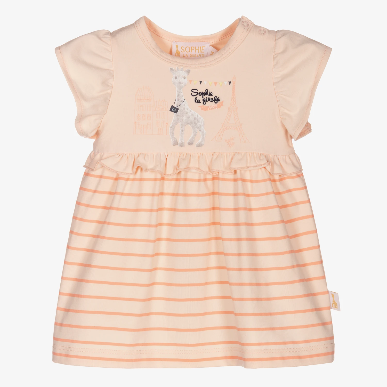 Coral pink dress for baby girls by Sophie la Girafe, made in soft and stretchy cotton jersey. The striped skirt has a ruffle trim around the waist and there is a cute Sophie la Girafe Paris themed print on the front with a black embroidered logo. It fastens with poppers on one shoulder.