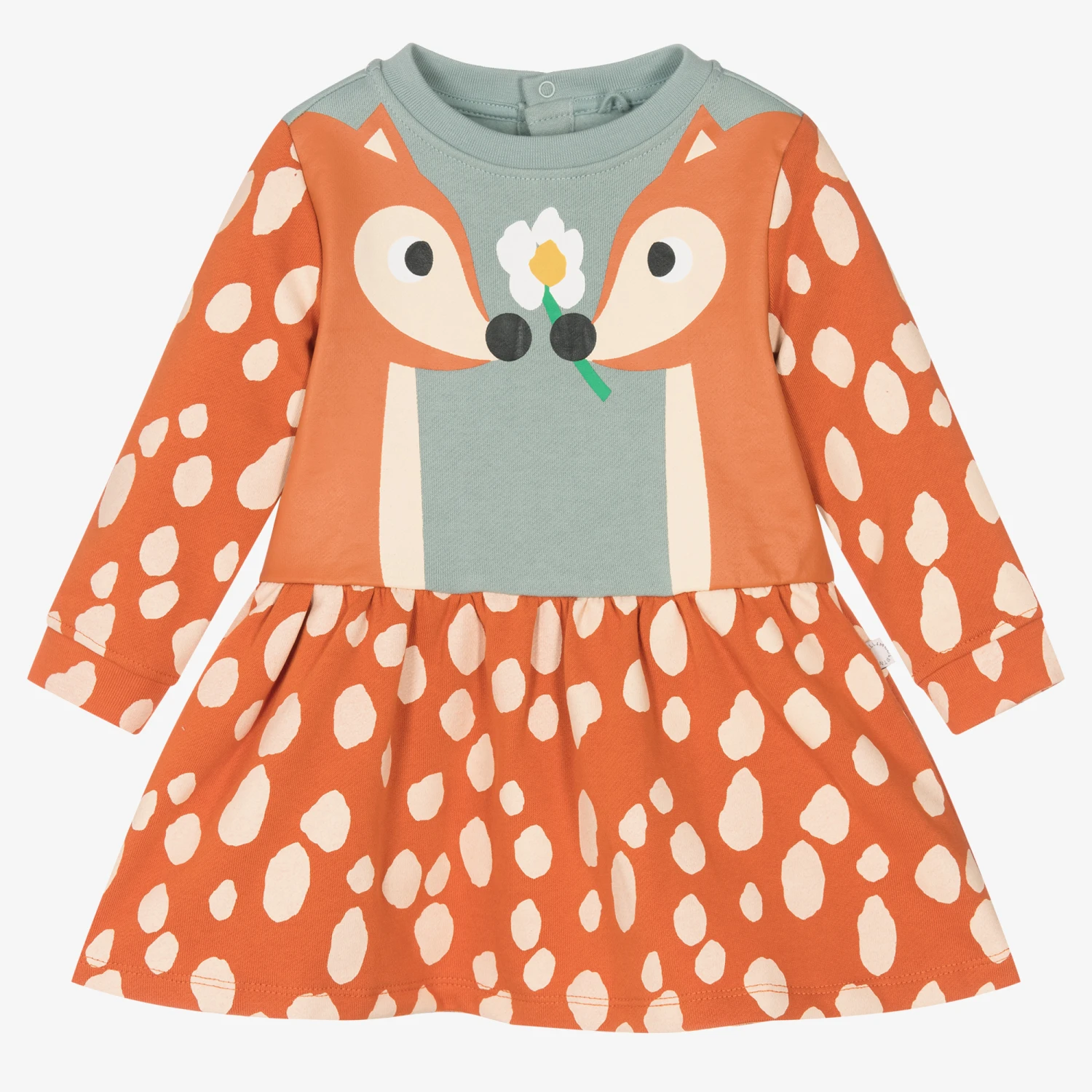 An adorable dark orange and duck egg blue dress for baby girls by Stella McCartney Kids, made in organic cotton jersey with a fleecy inside. Designed with two friendly deers on the bodice and a fun deer dot print on the sleeves and skirt, this dress has a dropped waist with ribbed trims for ultimate comfort. There are popper fastenings on the back for easy dressing.