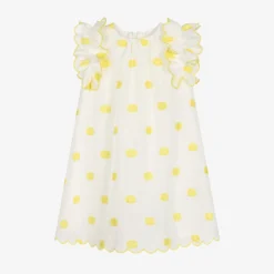 White dress for baby girls by Stella McCartney Kids, with embroidered yellow polka dots. Made in beautifully lightweight satin from recycled fibres, this sweet sleeveless style is gathered from the neckline to create a gentle A-line shape. To complete the look, there are pretty ruffles on the shoulders with embroidered scalloped edging to match the hem. The dress is lined in lightweight cotton for comfort and fastens neatly with a concealed zip on the back. The Stella McCartney fit can be quite small so choose a size up if you want room to grow.