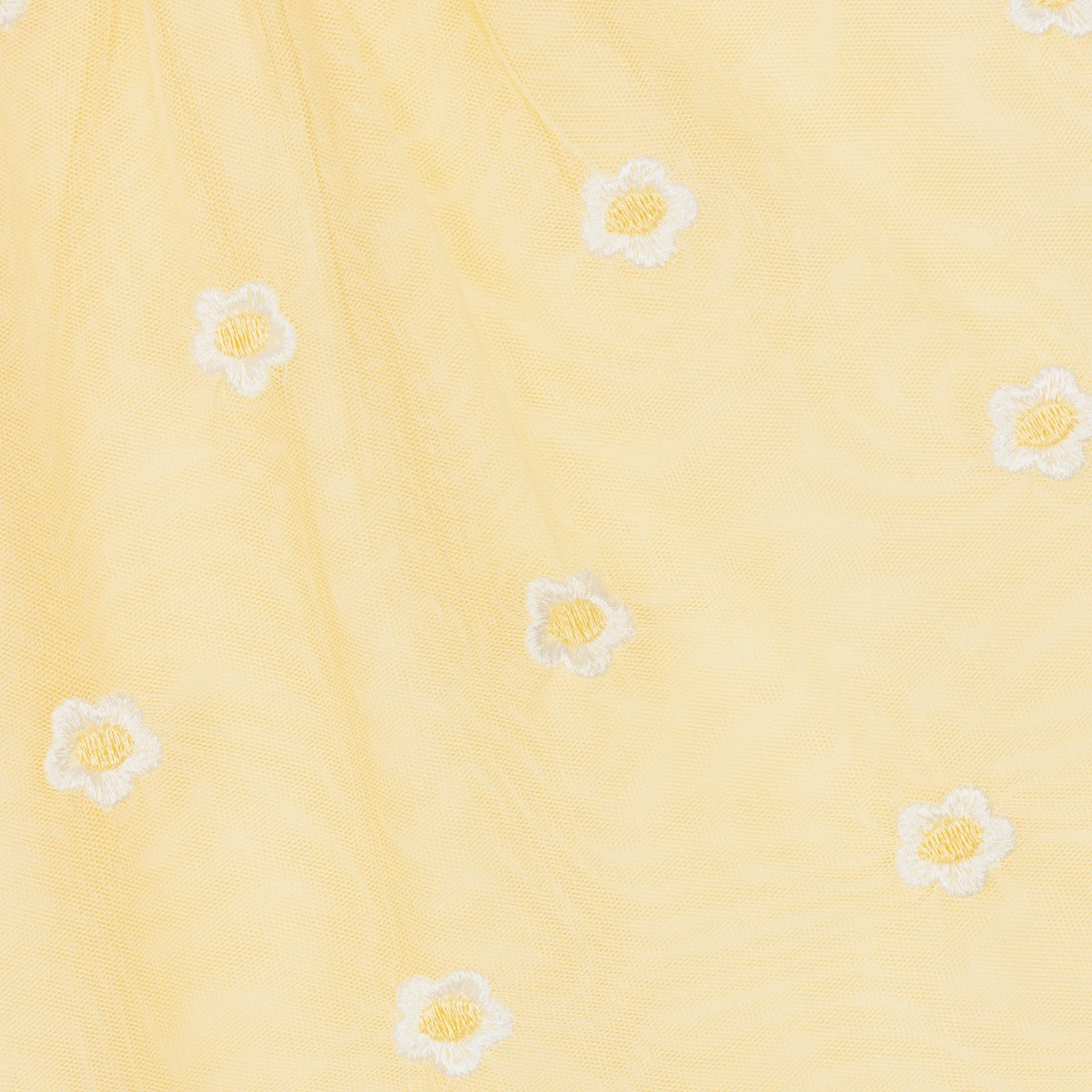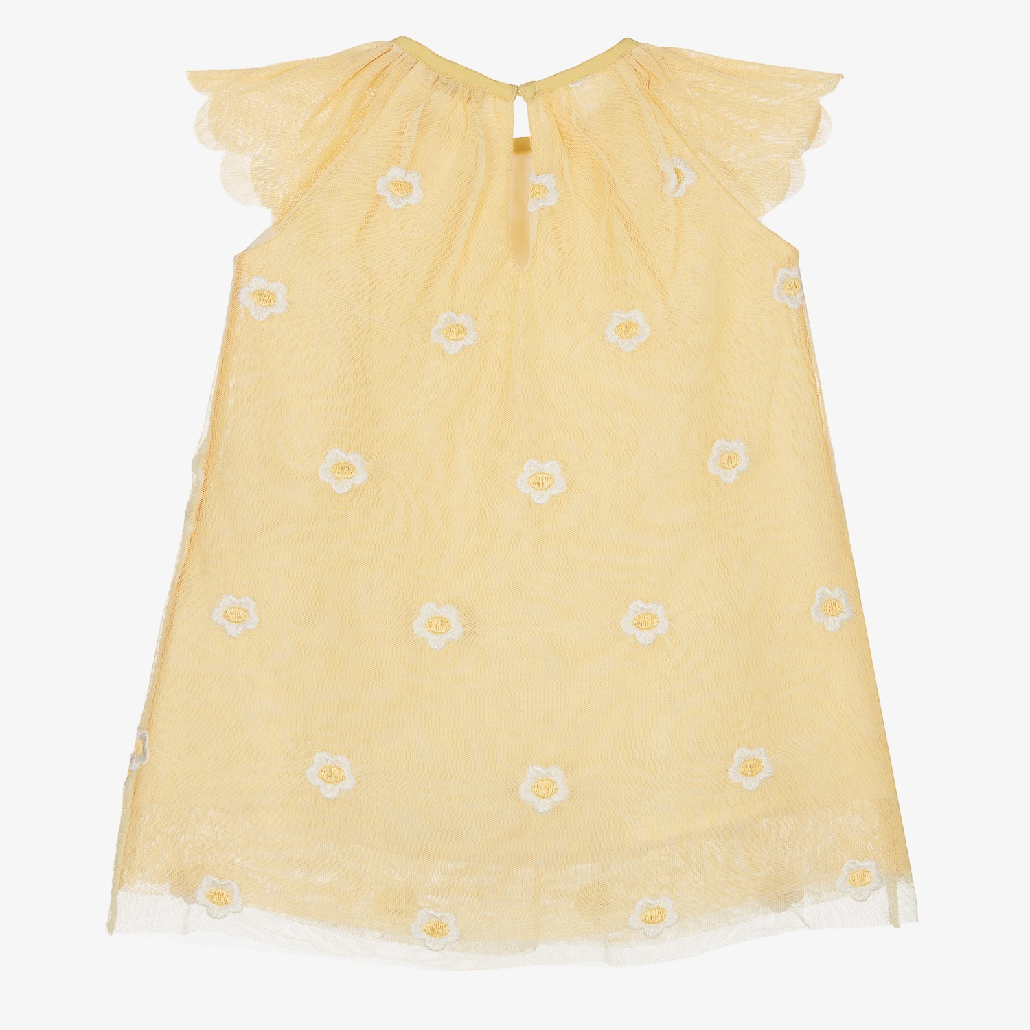 Sweet pastel yellow dress for little girls from Stella McCartney Kids, made with recycled materials. Falling from the neckline are soft layers of tulle, embroidered with white and yellow daisies for a lovely effect. The short sleeves are sheer, and trimmed with pretty scalloped edges. The dress is lined with super-soft and gentle cotton voile, and fastens with a keyhole button on the back. The Stella McCartney fit can be quite small so choose a size up if you want room to grow.
