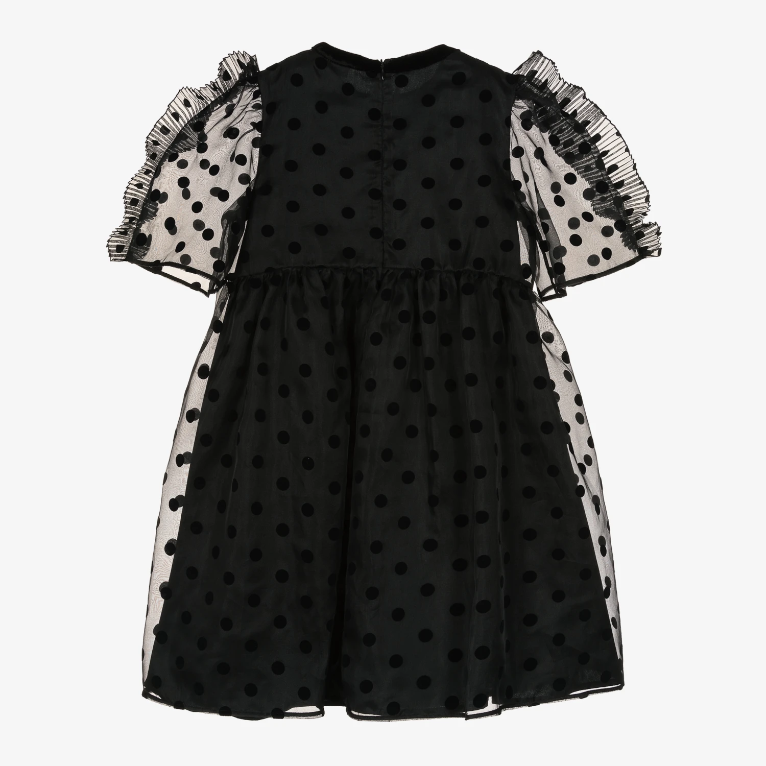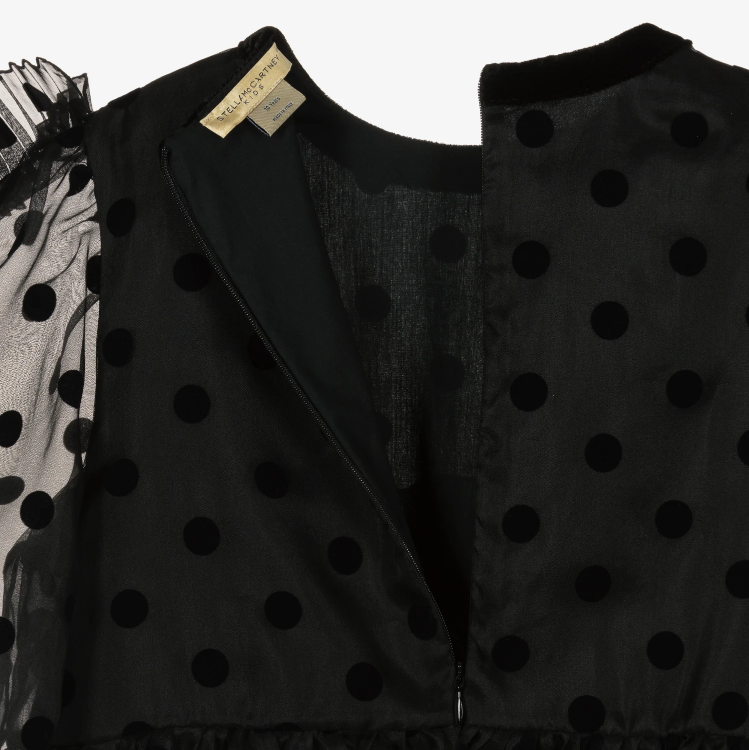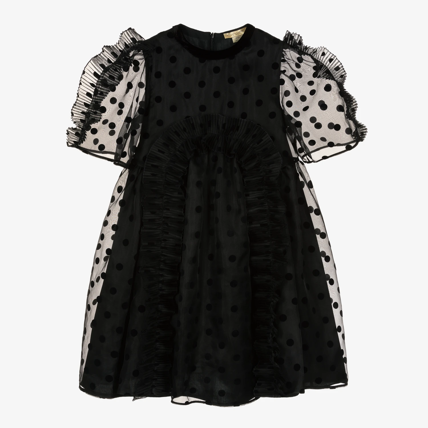 Gorgeous black silk organza dress for teen girls by Stella McCartney Kids, with luxuriously soft velvet polka dot pattern. Forming part of the designer’s festive capsule collection, it has beautiful plissé ruffle trims on the sheer sleeves and on the front of the dress. So lovely for special occasions, it has a black velvet trim for an added finishing touch. It is lined in soft cotton poplin for comfort and has a concealed back zip fastening for a sleek finish.