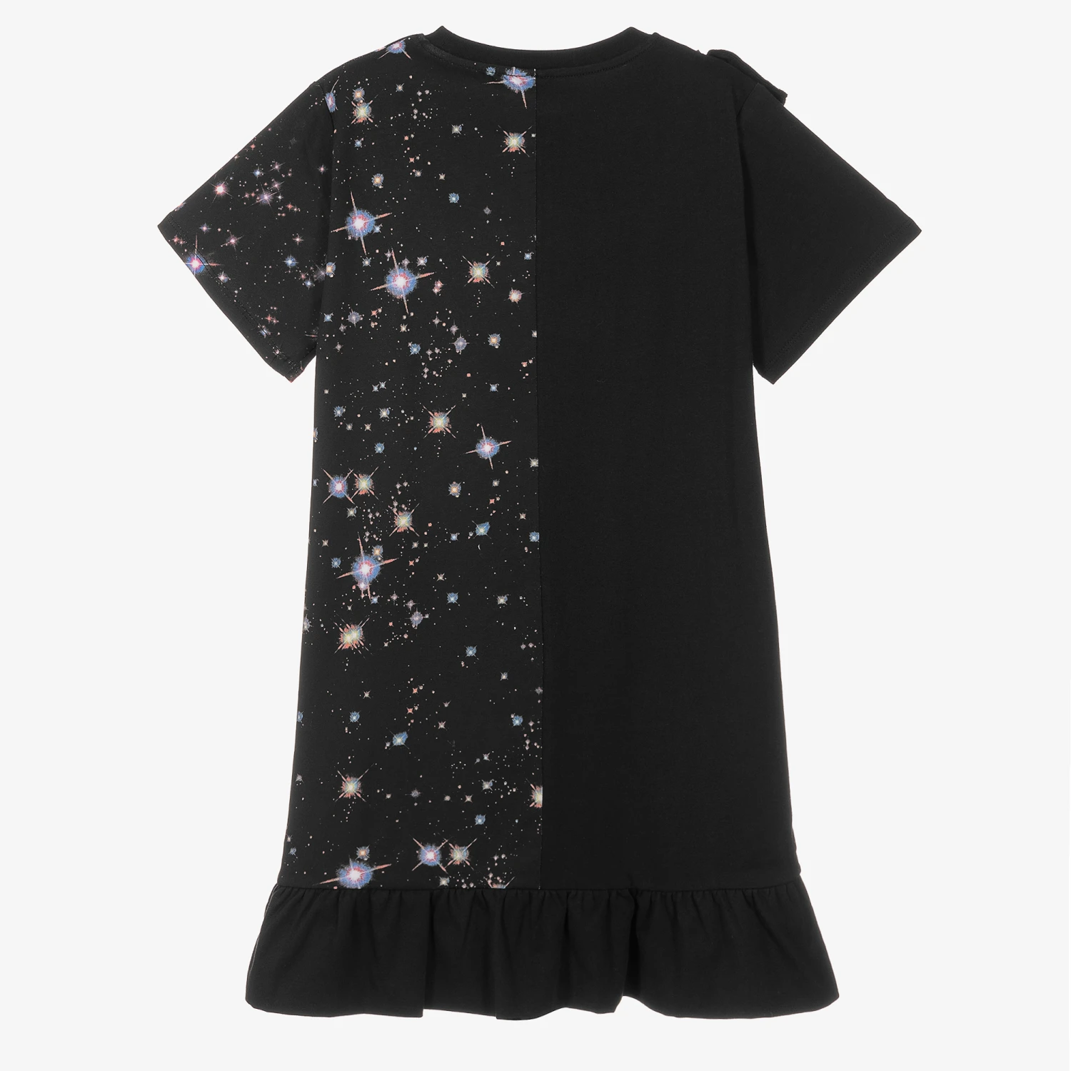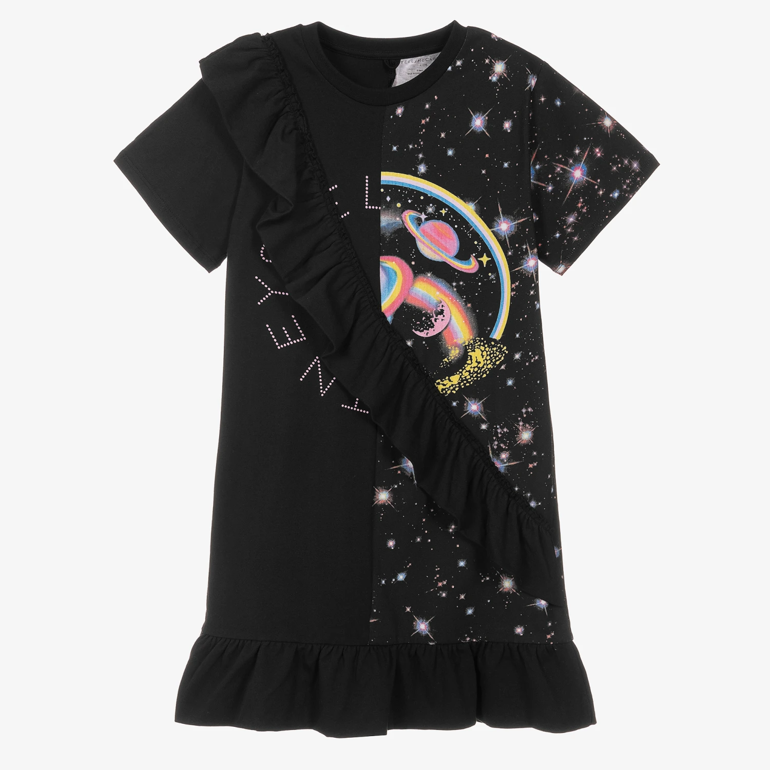 Striking, quirky and with a diagonal frill across the body, this black dress for teen girls is by British brand Stella McCartney Kids. One half is plain black with half of the designer’s iconic medallion logo printed in pink on the front, whilst the other half is patterned with a colourful cosmic print. Made in eco-friendly, organic cotton jersey, it is soft, stretchy and comfortable to wear, and simply slips on over the head.