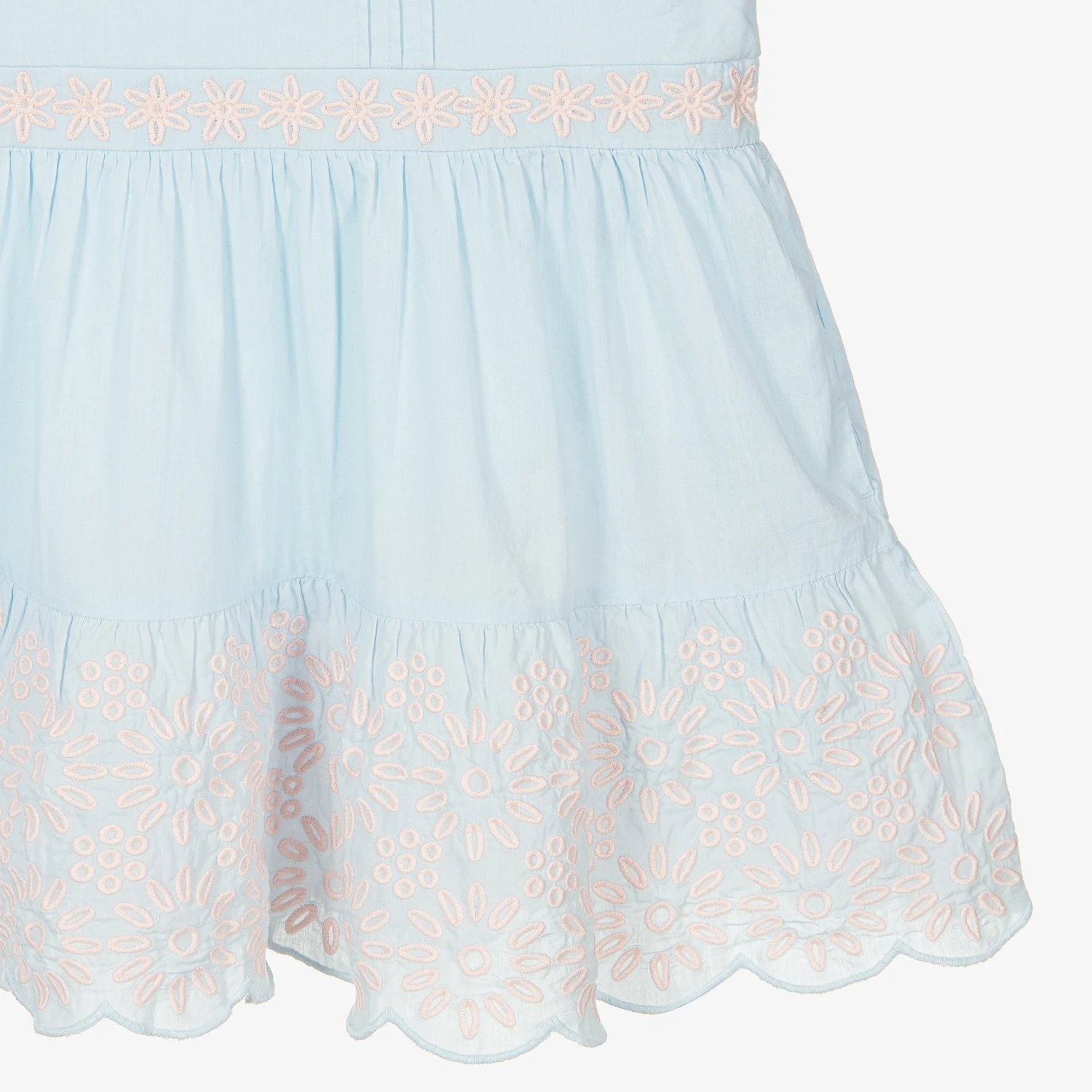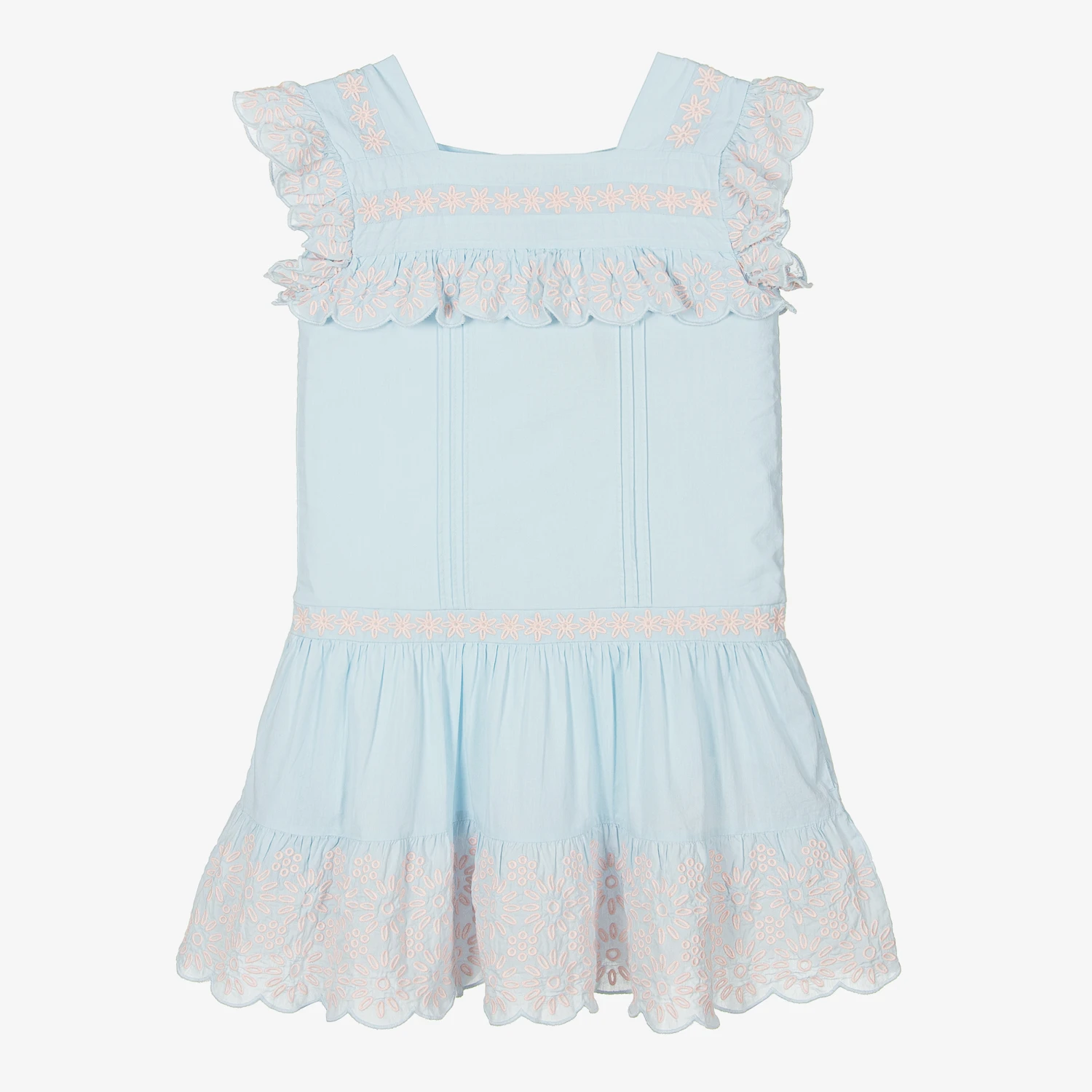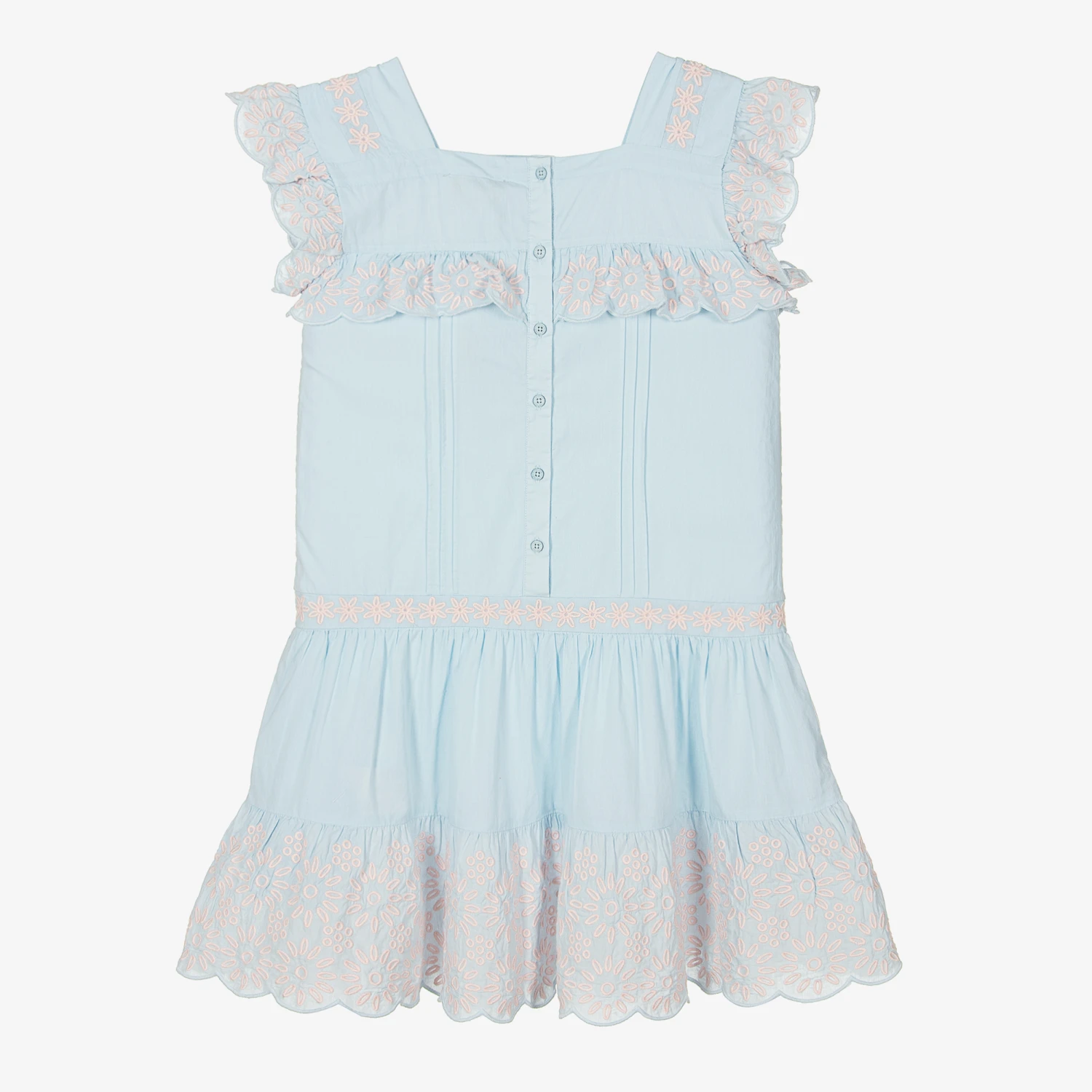 Pastel blue dress for teen girls by Stella McCartney Kids, lovely for warmer days spent in the sun. Crafted in organic cotton in line with the brand’s eco-conscious ethos, this pretty style draws inspiration from bohemian fashion. Embroidered with pink flowers all-over, this floaty style has ruffle trims and a flattering square neckline. It fastens with branded buttons on the back, signing off the look with a subtle designer detail. The Stella McCartney fit can be quite small so choose a size up if you want room to grow.