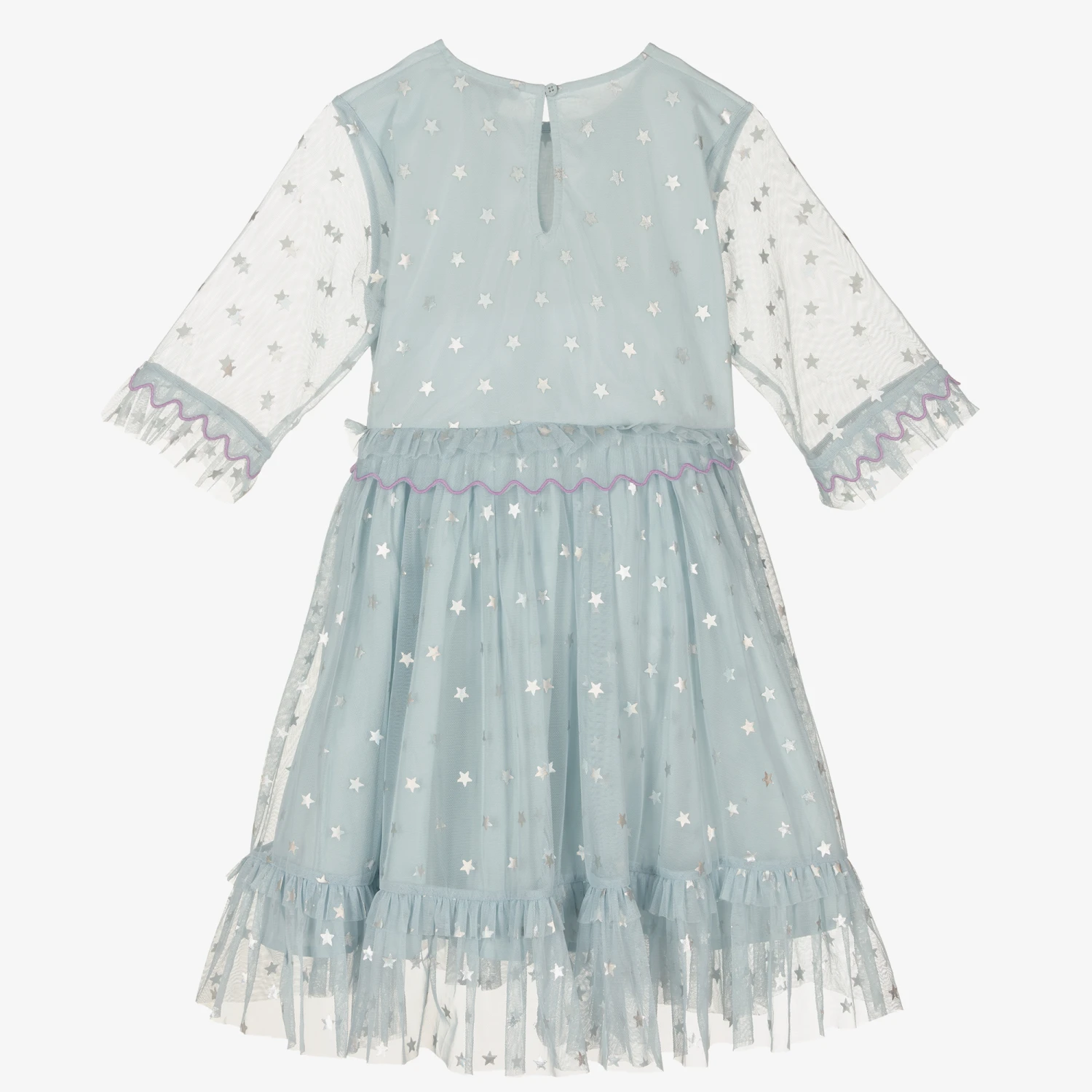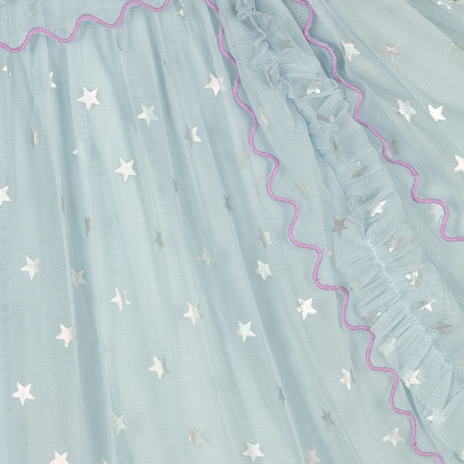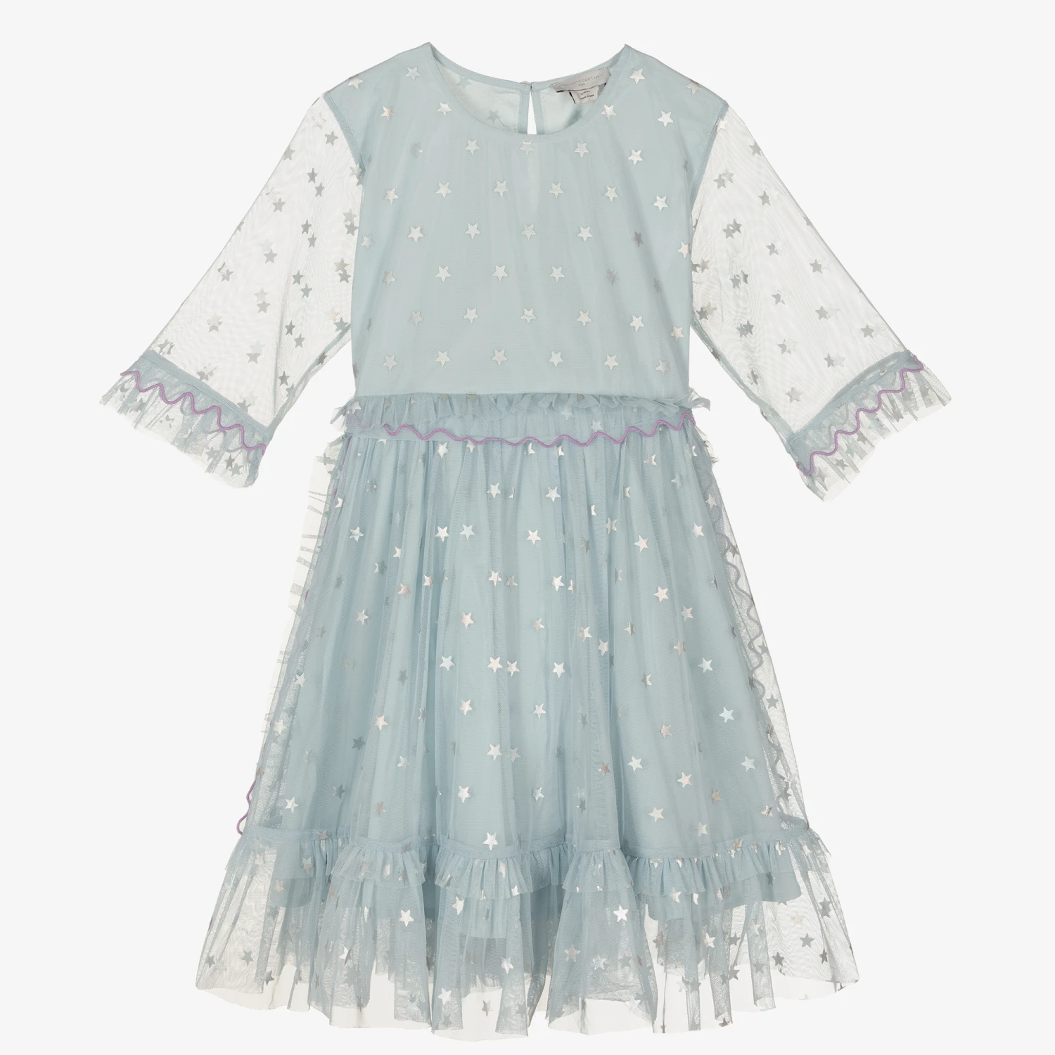 Teen girls light blue dress by Stella McCartney Kids, made in soft, recycled tulle. Printed with metallic silver stars, it has chic frill trims with delicate lilac purple stitching. With stylish sheer sleeves, it has a cotton voile lining for comfort, and a single button fastening on the back.