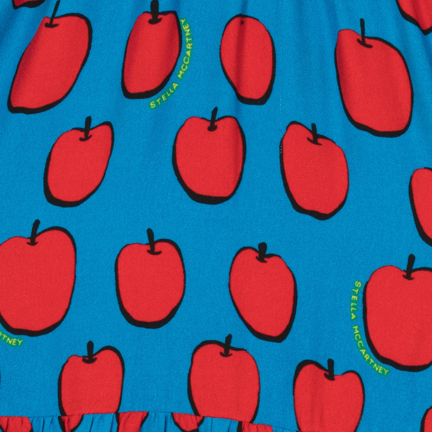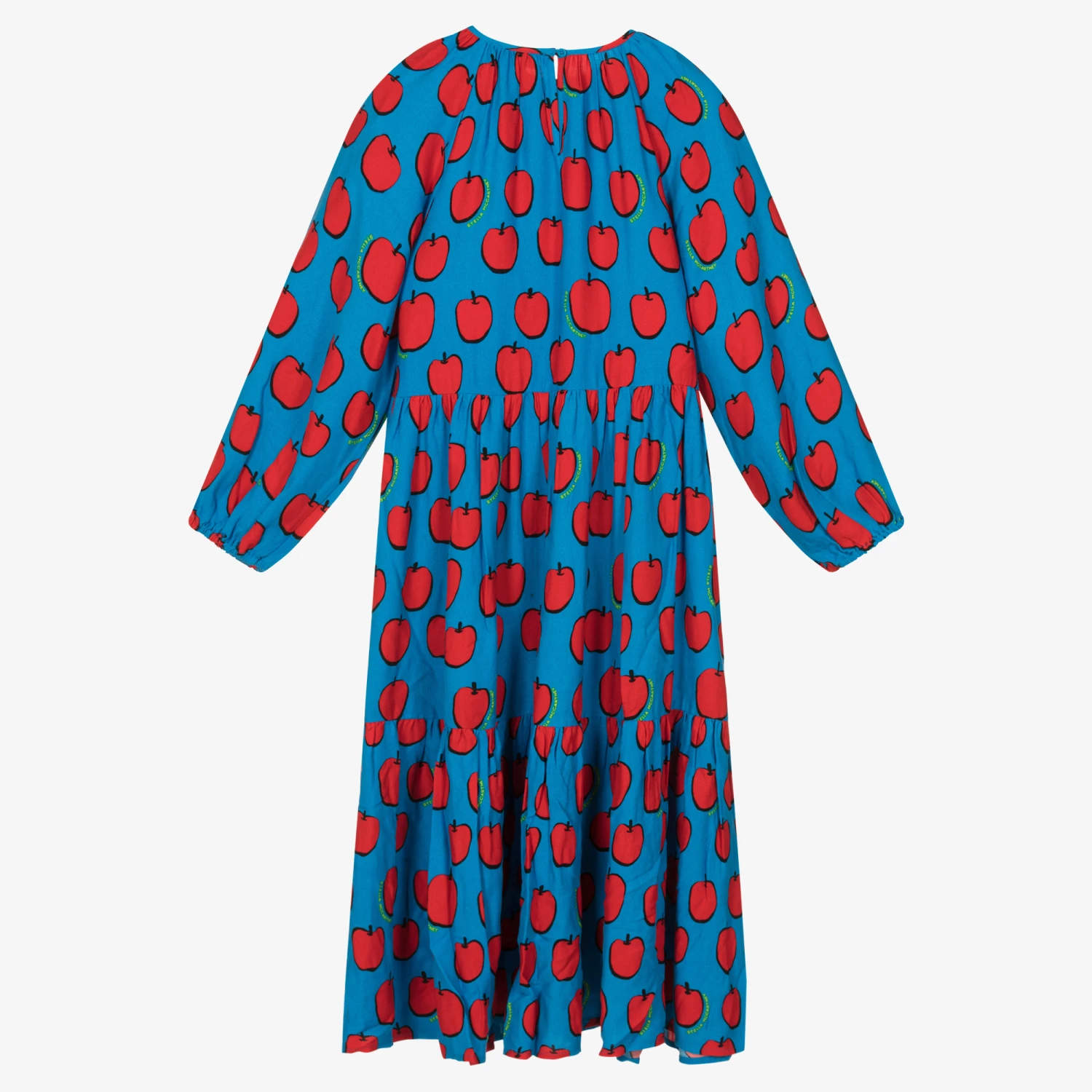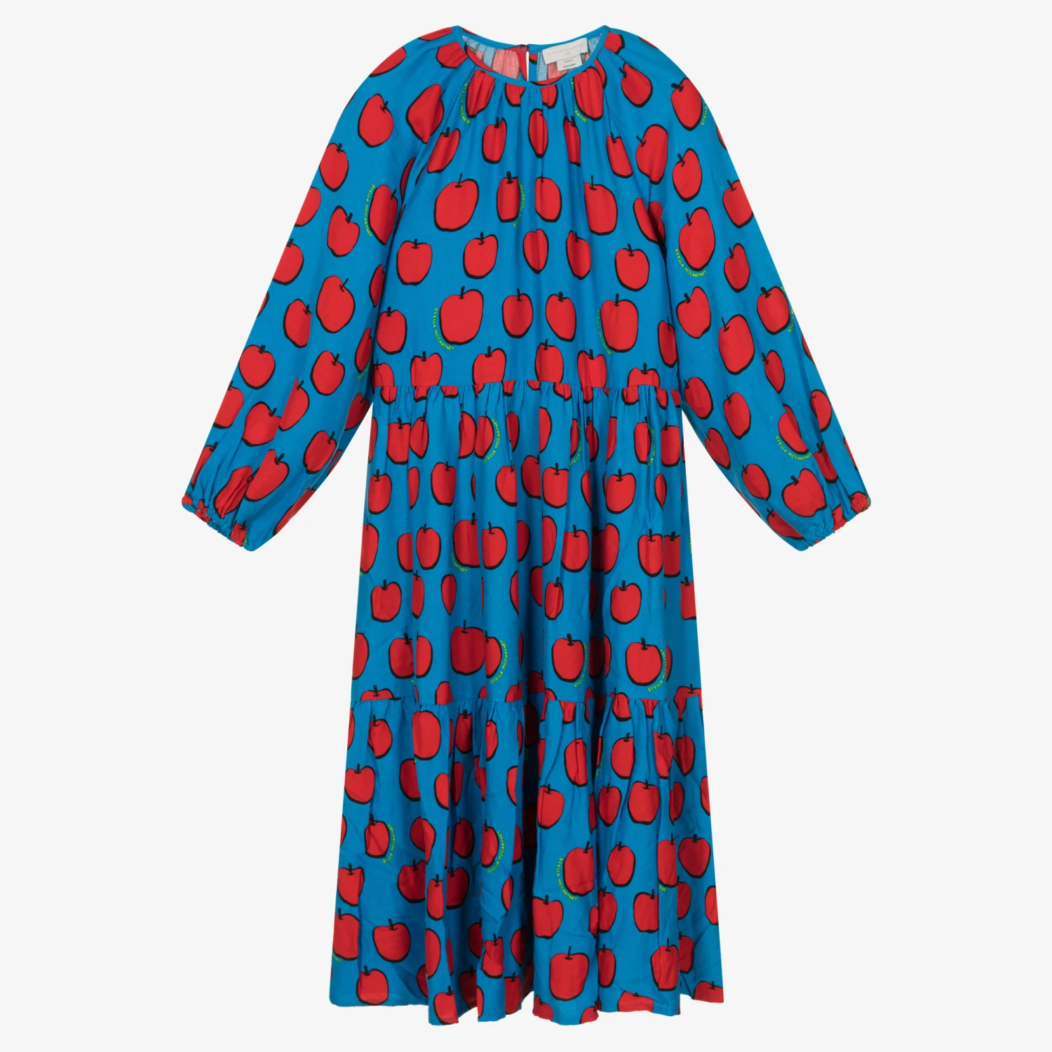 Bright blue viscose maxi dress for teen girls by British brand Stella McCartney Kids, with a red apple print and subtle yellow logos that stand out against the background. It has a classic silhouette with gathered tiers creating movement in the skirt, whilst the long sleeves are gently elasticated at the wrists for added volume. There is a button fastening on the back keyhole detail for easy dressing and two concealed pockets.
