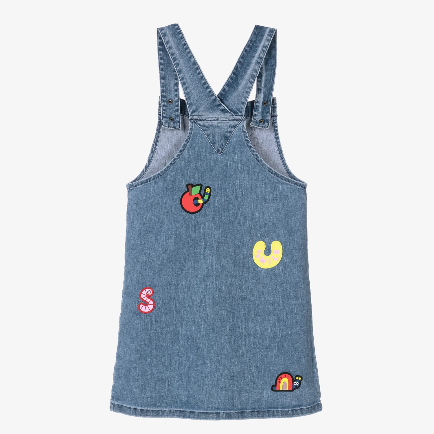 Off-duty denim pinafore dress for teen girls by Stella McCartney Kids, made in soft and stretchy cotton. Patterned with fun and colourful silicone patches, it fastens with poppers down the front and has patch pockets. There are adjustable popper fastening shoulder straps, embossed with the brand’s logo.