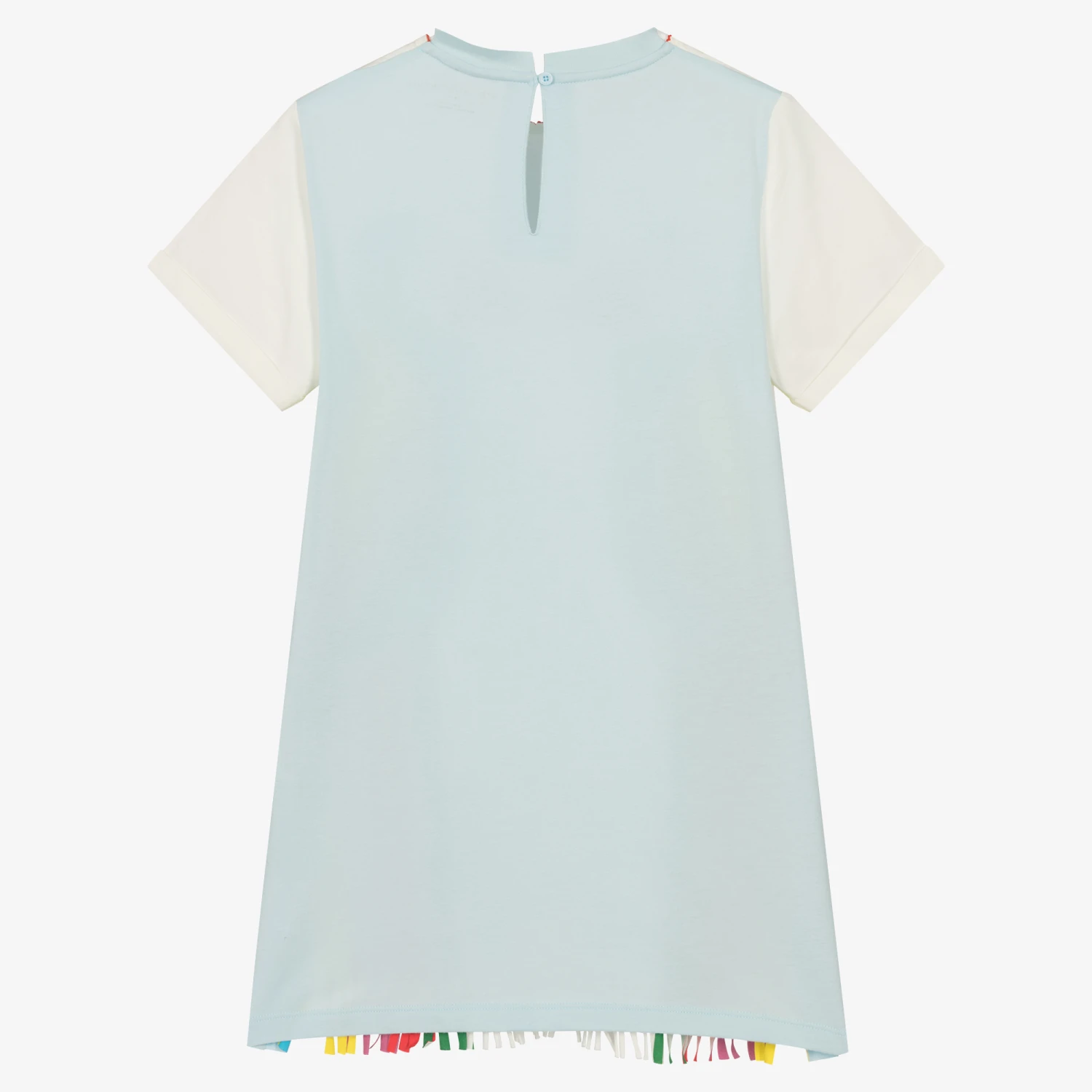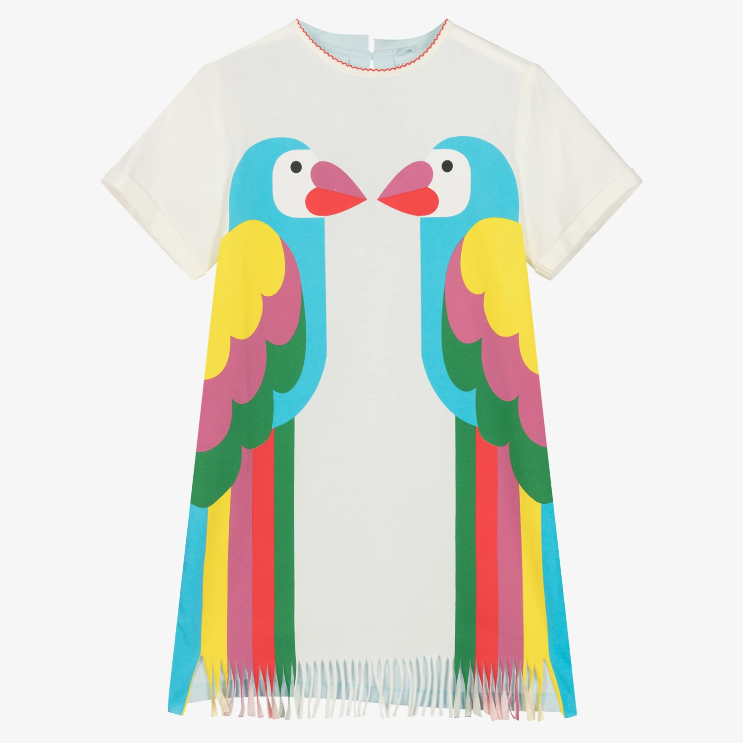 Bold, colourful parrot prints give a playful twist to this ivory T-shirt dress for teen girls by Stella McCartney Kids. Made in soft organic cotton jersey with red embroidered trim on the neckline, it has fringing detail on the front for a bohemian touch. The pale blue back has a raw edge crew neck detail with a single branded button fastening. The Stella McCartney fit can be quite small so choose a size up if you want room to grow.