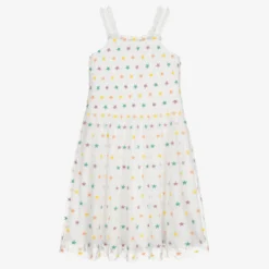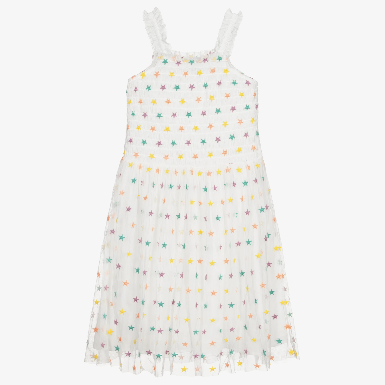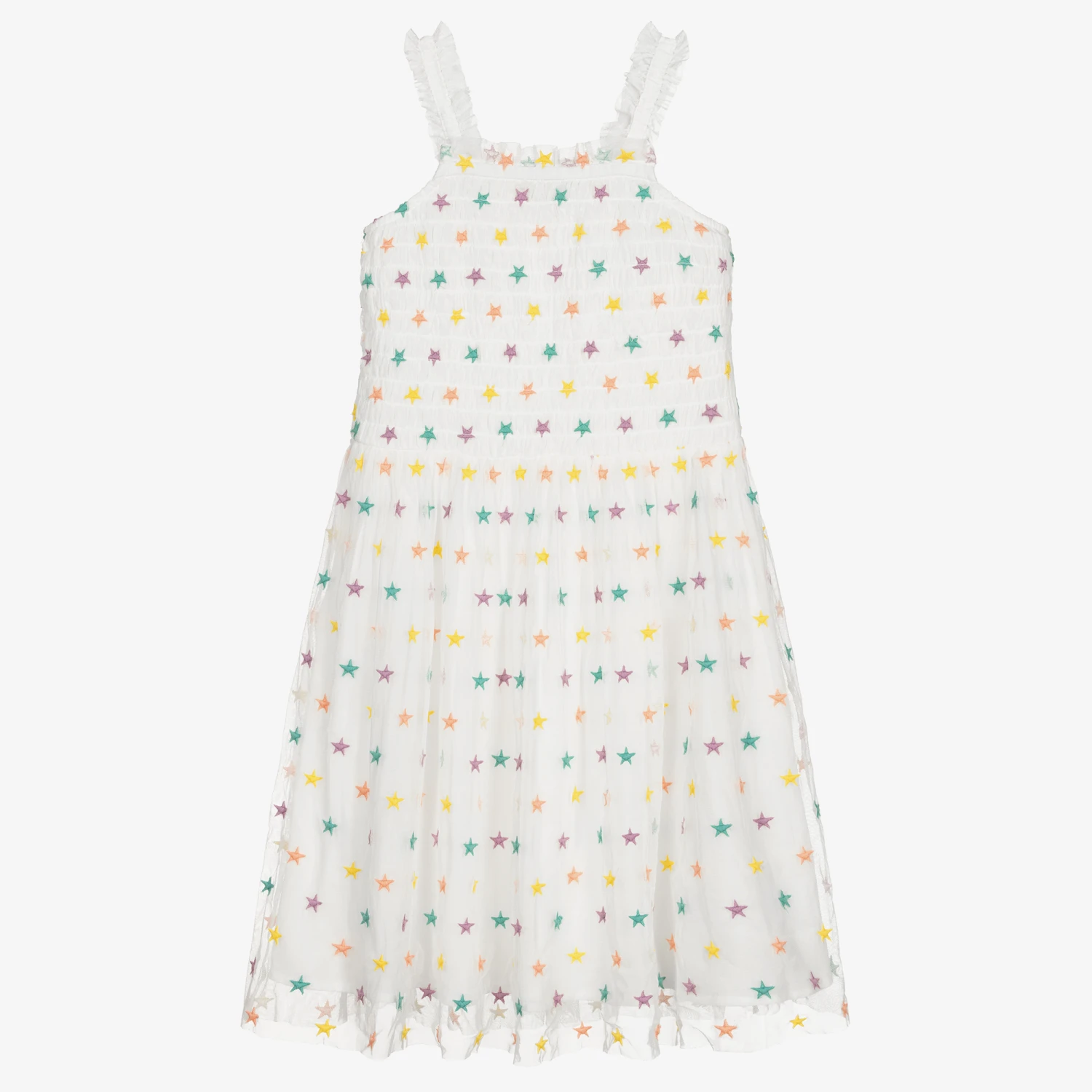 Teen girls off-white dress by British brand Stella McCartney Kids, made in soft recycled tulle. It has a colourful embroidered stars pattern and a ruched bodice. Fully lined in soft cotton voile, with frills on the elasticated shoulder straps.