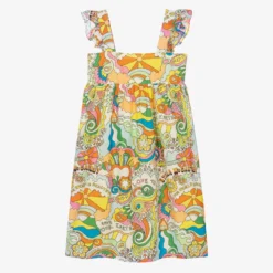A multicoloured dress for teen girls by Stella McCartney Kids, designed in an imaginative cartoon-inspired print with distinct logo branding. Spreading a sustainable message, this colourful piece has a squared neckline, a stretchy shirred back and ruffle-trimmed shoulder straps. Made in an organic cotton weave, the lined skirt gently gathers from the waist for a light and comfortable feel. The Stella McCartney fit can be quite small so choose a size up if you want room to grow.