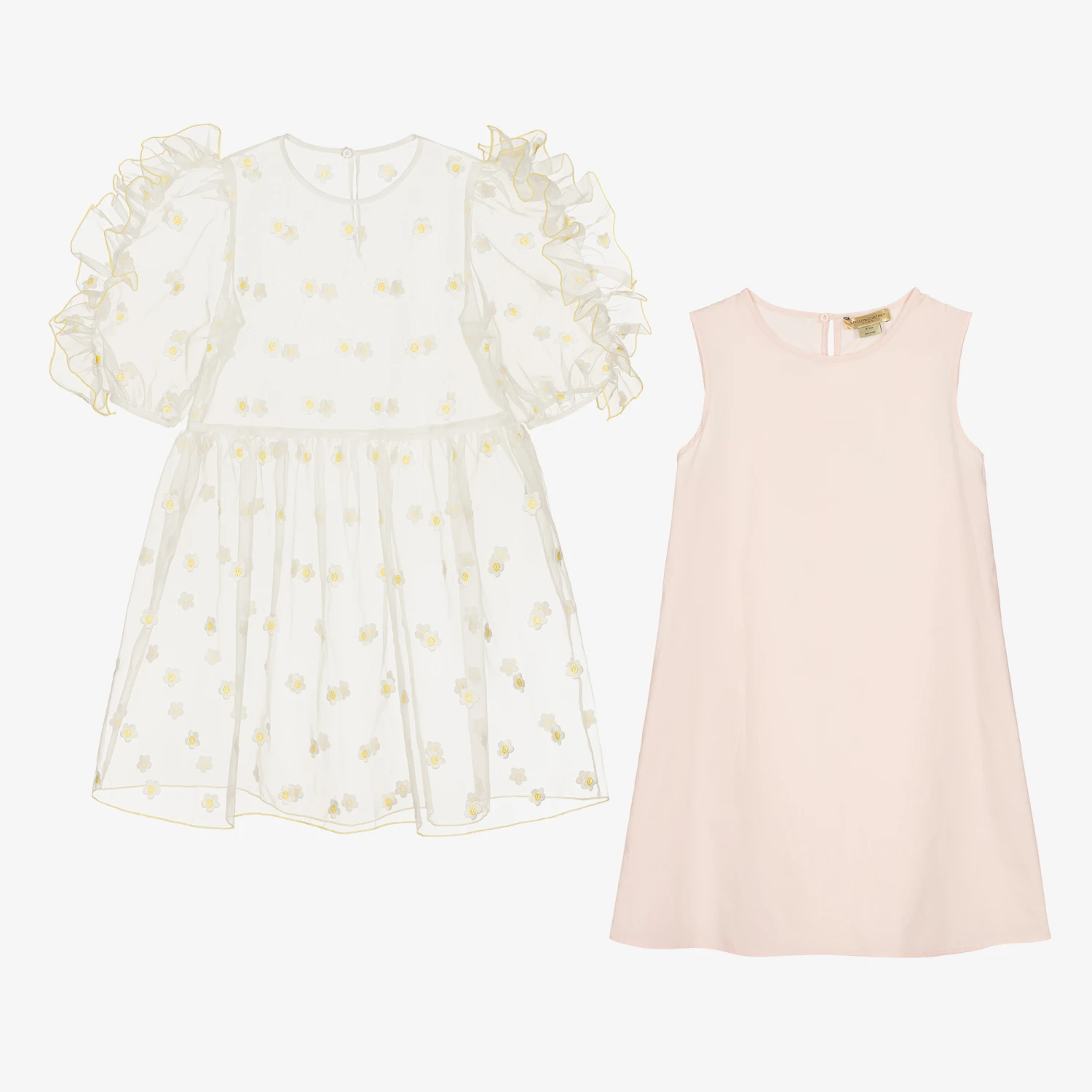 Romantically styled in pastel hues, a pink two-in-one dress for teen girls, from Stella McCartney Kids. Made from recycled materials, the sheer organza overlay is embroidered in daisies, with charming ruffled sleeves and yellow trims. There is a keyhole button fastening on the back, which is daisy-shaped for a feminine finish. In a simplistic A-line silhouette, the cotton dress is placed underneath the overlay to complete the look. The Stella McCartney fit can be quite small so choose a size up if you want room to grow.