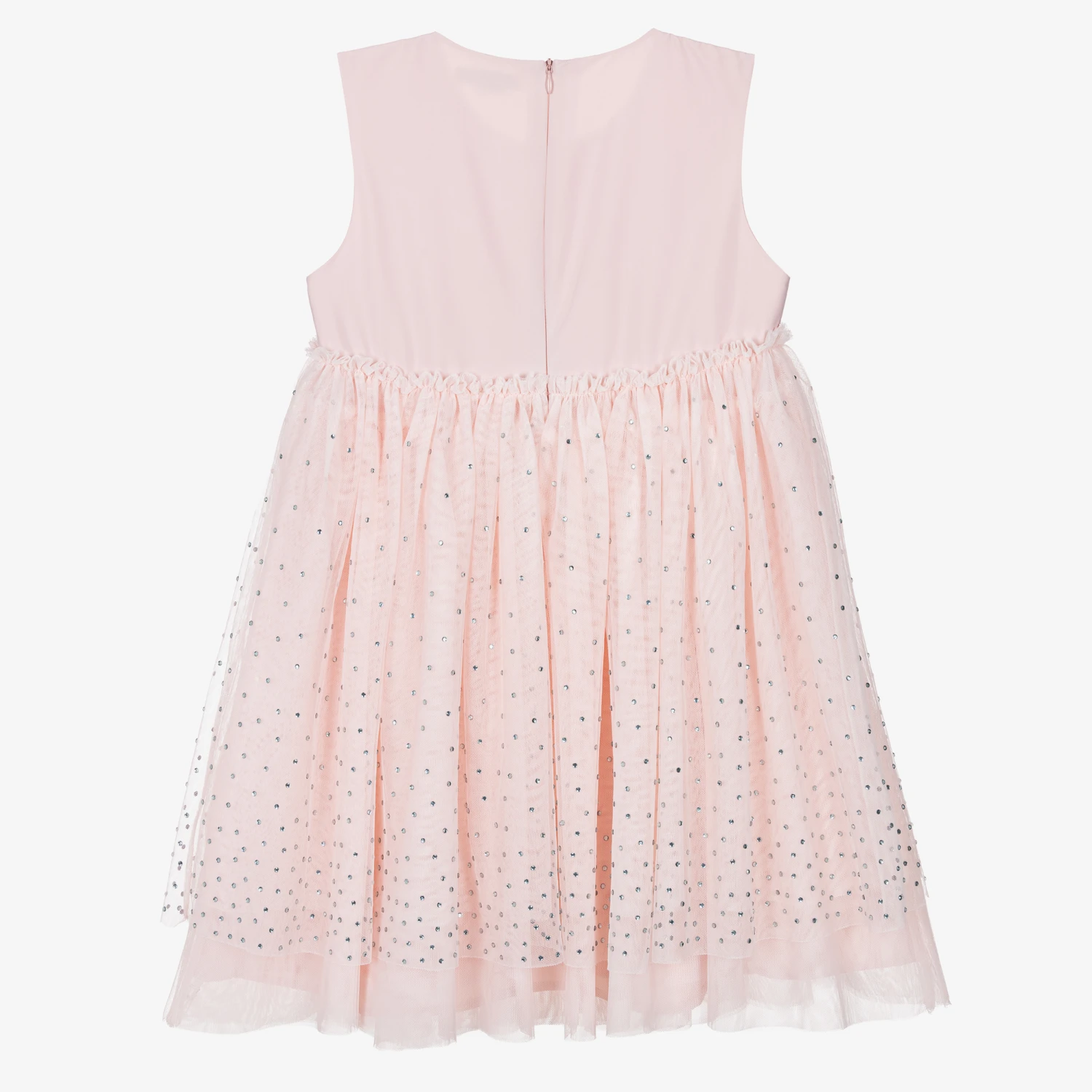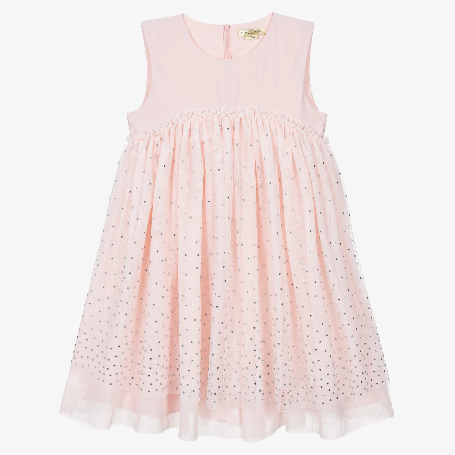 Teen girls pale pink special occasion dress, designed by British brand Stella McCartney Kids. Encompassing the designer’s eco-conscious direction, this gorgeous style is made using recycled materials. The minimalist satin bodice flows into a dramatic tulle skirt, encrusted with silver diamantes for added glamour. Lined with added layers of tulle for volume, this stand-out style fastens with a concealed zip on the back for a seamless appearance. The Stella McCartney fit can be quite small so choose a size up if you want room to grow.