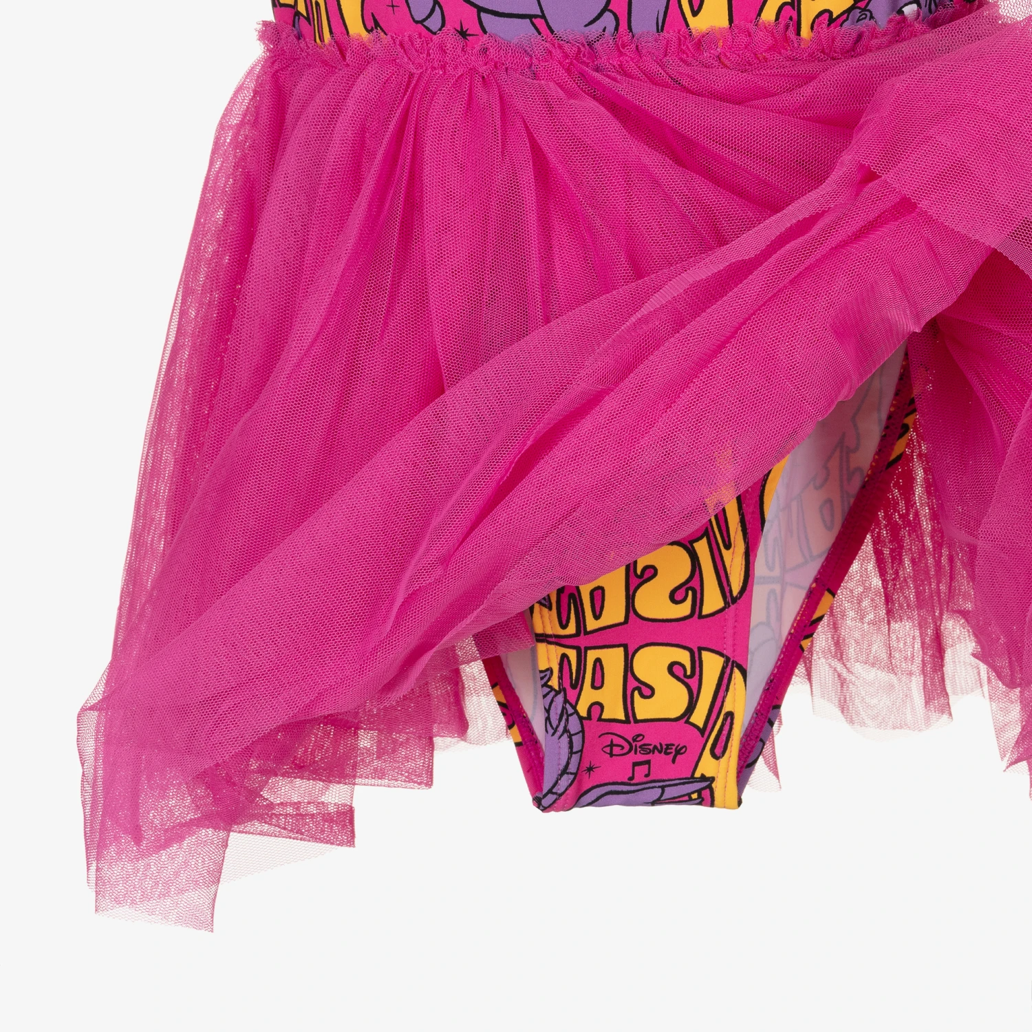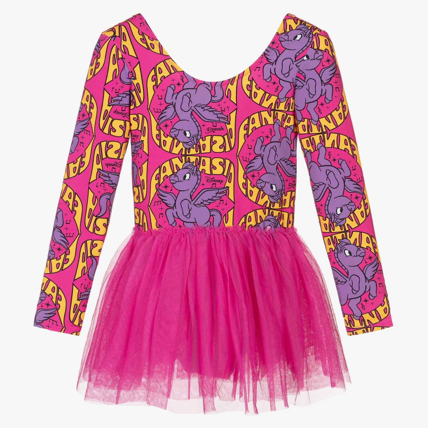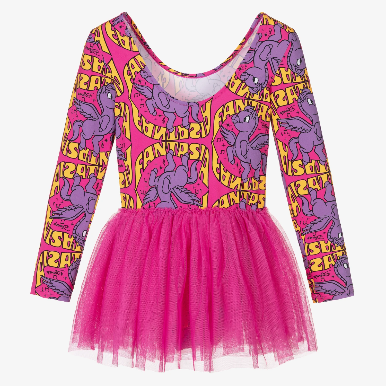 Designed by Stella McCartney Kids, quirky fuchsia pink dress for teen girls inspired by Disney’s Fantasia. Made in eco-conscious recycled nylon, the bodysuit is patterned with psychedelic Pegasus graphics and neon orange pops of colour. With a cool, 80’s inspired aesthetic, the attached tutu-style skirt gives this dress a girly feel with luxurious layers of tulle for added volume.