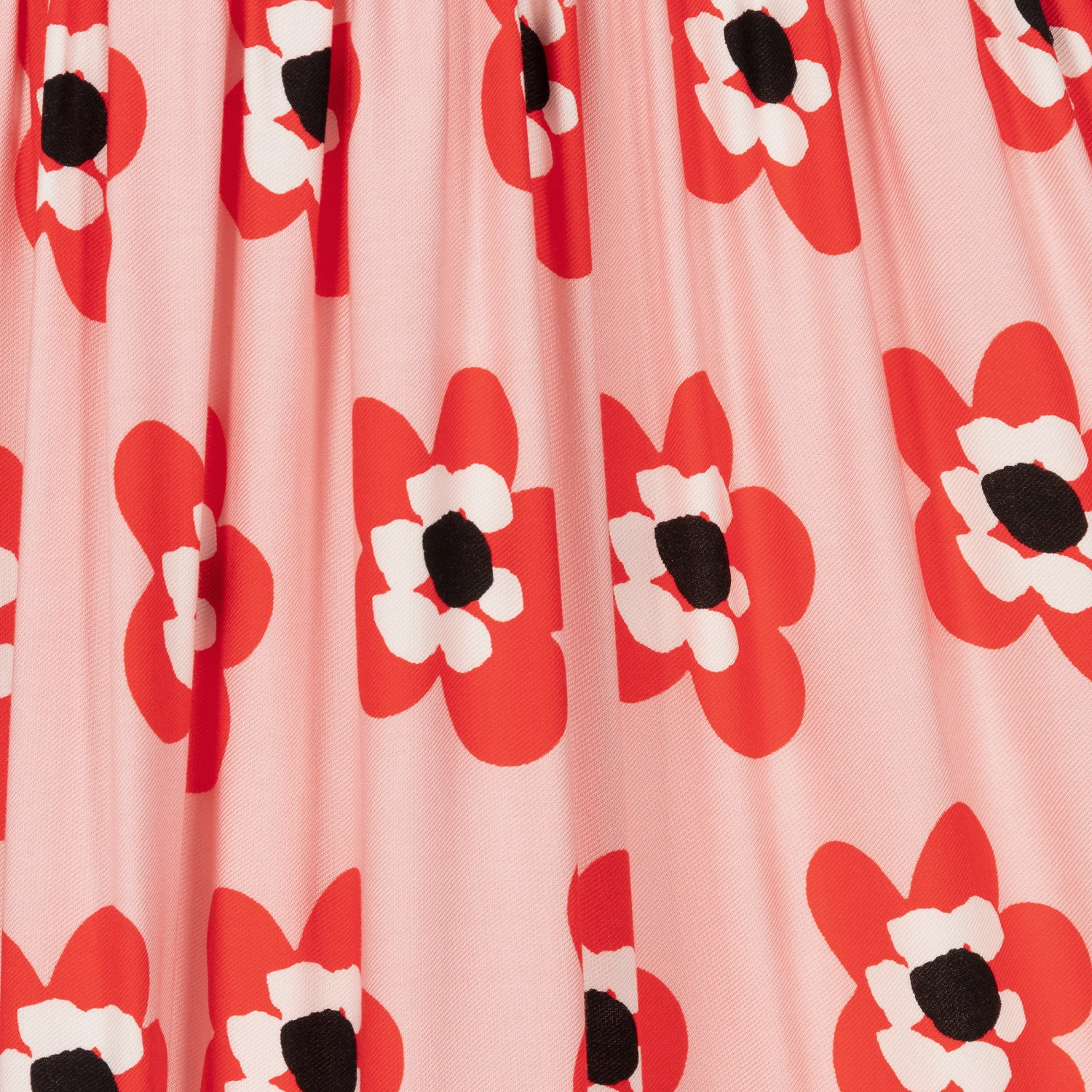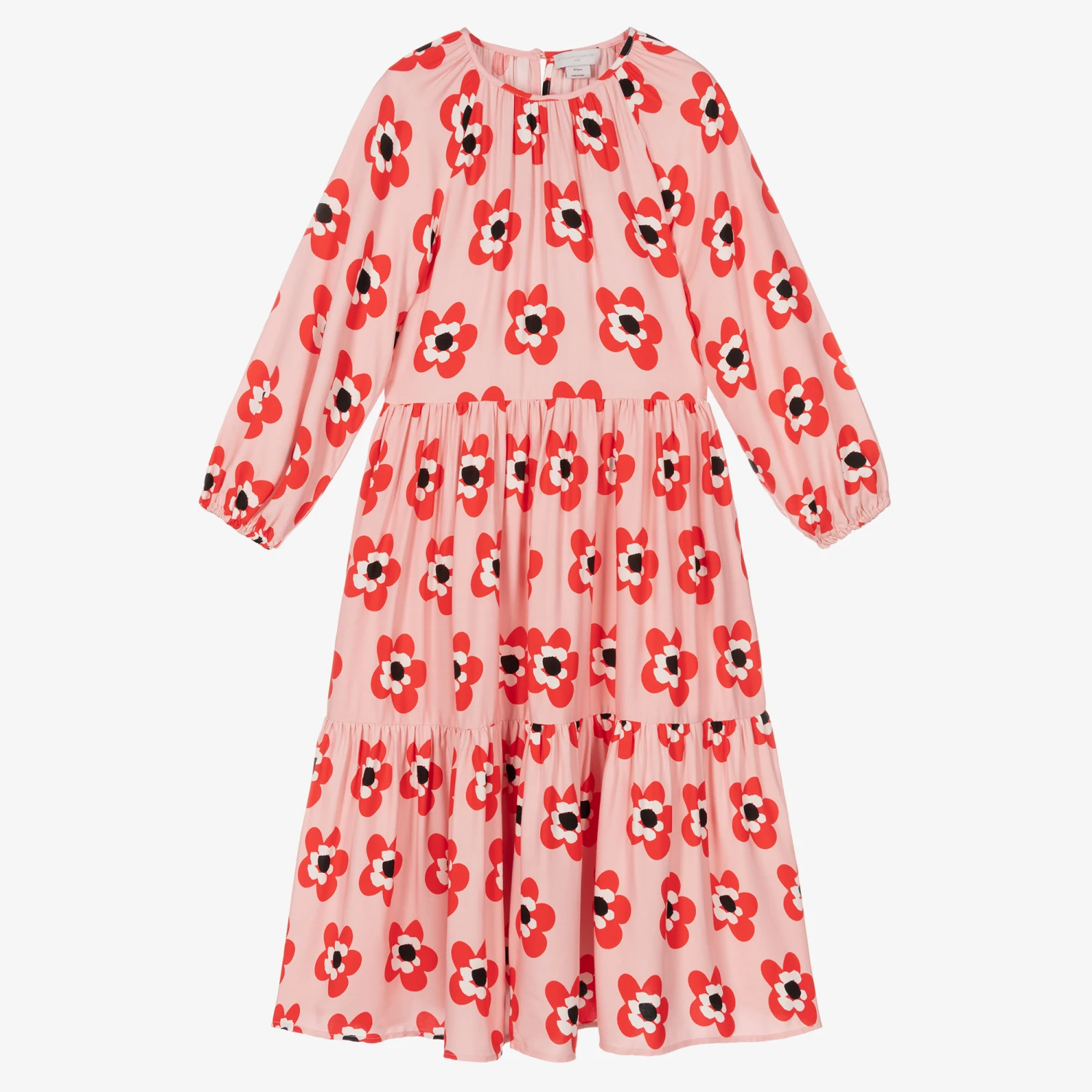 Bright and beautiful, this pink dress for teen girls is by British brand Stella McCartney Kids. It has a fun, bold red, white and black flower print and fastens with a red logo button around the back. It is made in super soft, sustainable viscose which feels smooth and comfortable against delicate skin. There are pretty gathers around the neck, raglan sleeves with gently elasticated cuffs and a tiered skirt. There are useful concealed pockets on the side seams.