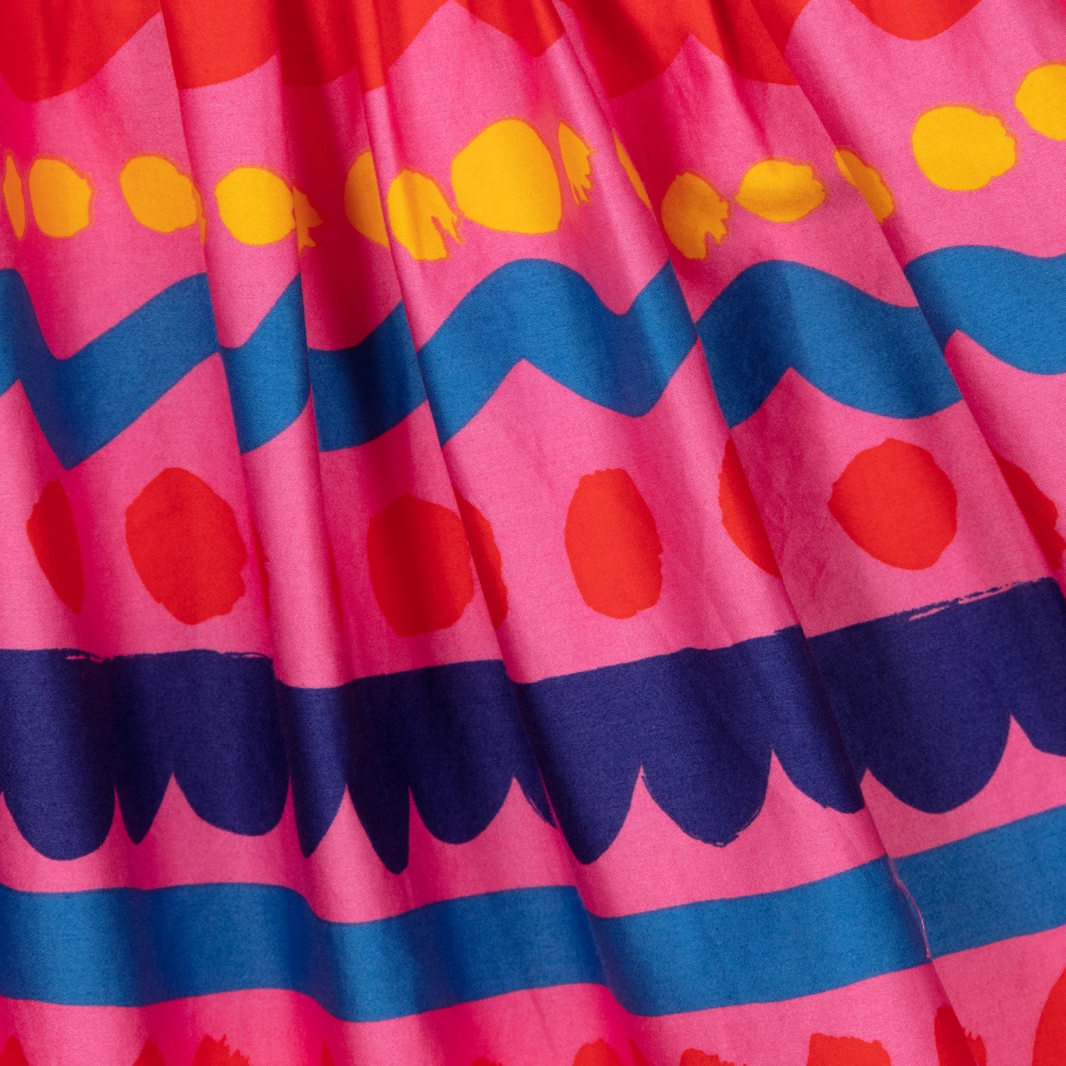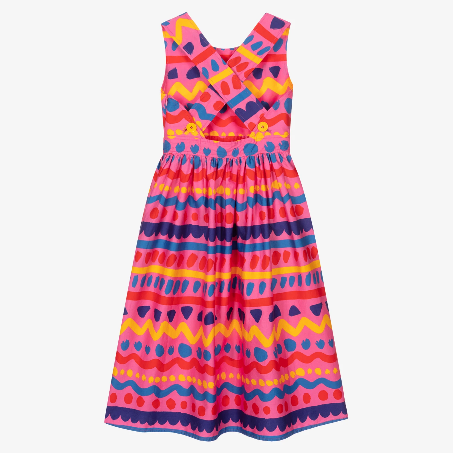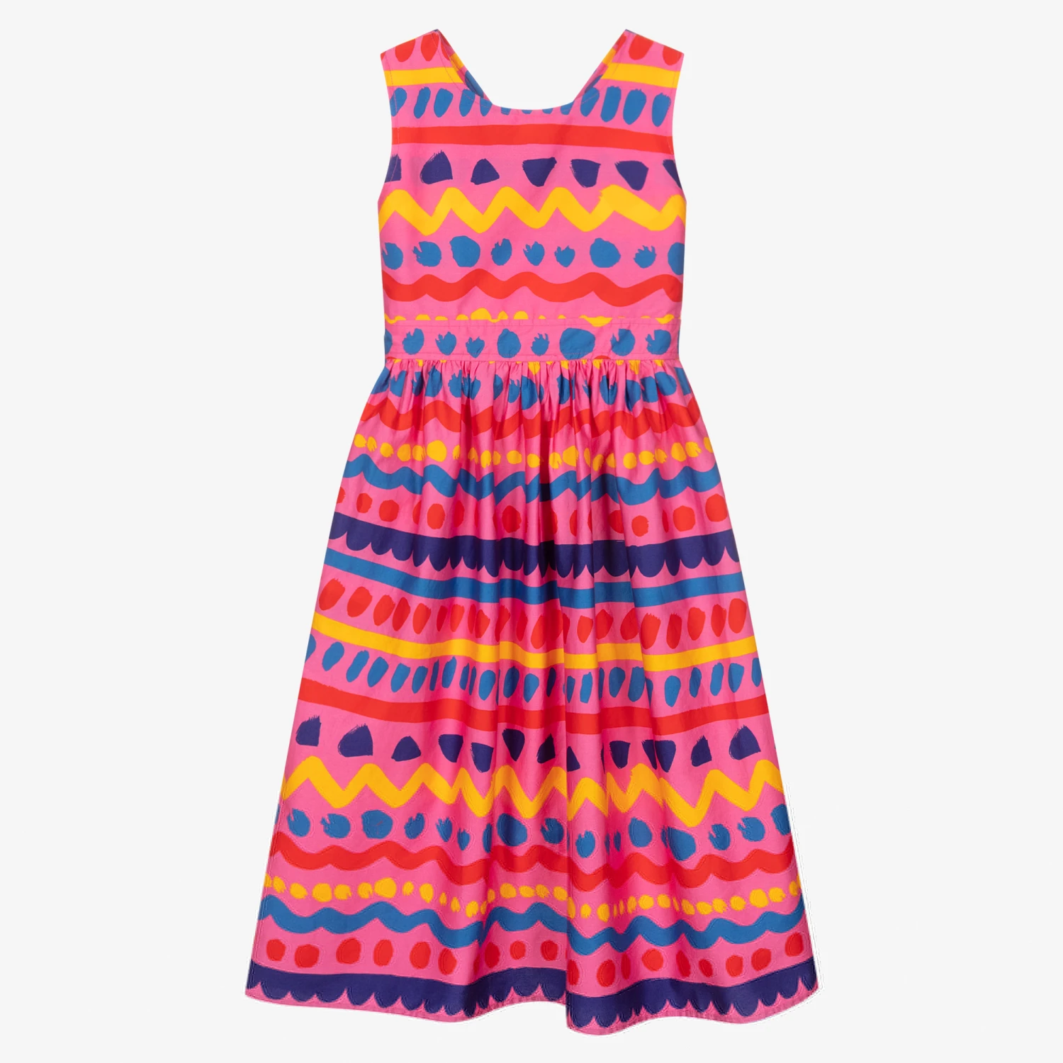 Quirky pink sun dress for teen girls by British designer Stella McCartney Kids. Made in comfortable organic cotton, it has a wavy stripe and dotted pattern in shades of blue, yellow and red. There are large decorative yellow buttons on the fixed cross-over shoulder straps and useful concealed pockets on the side seams.